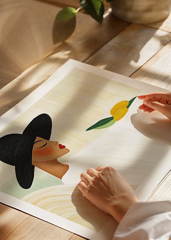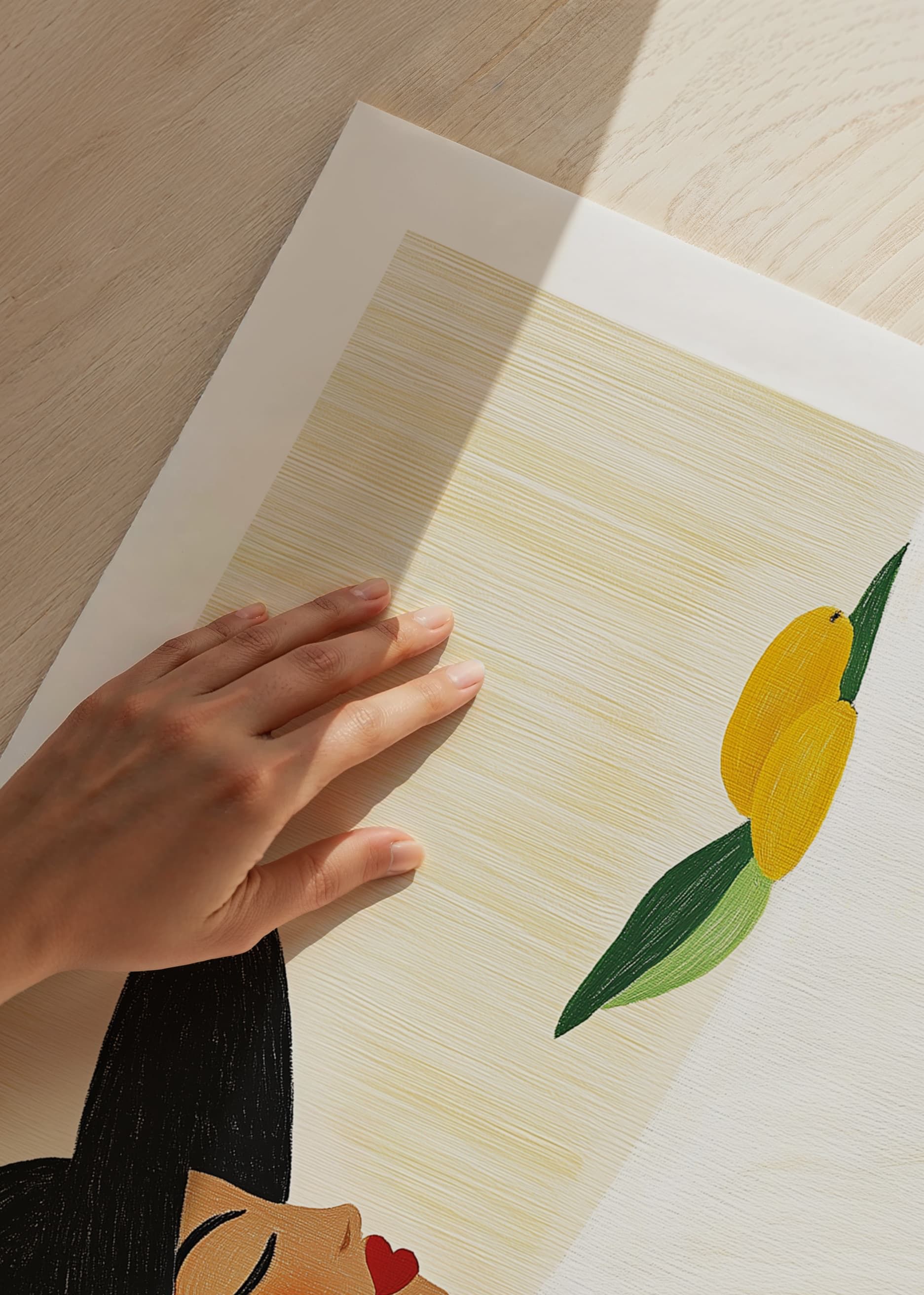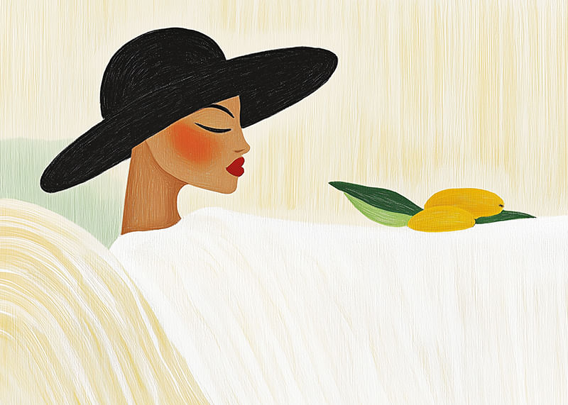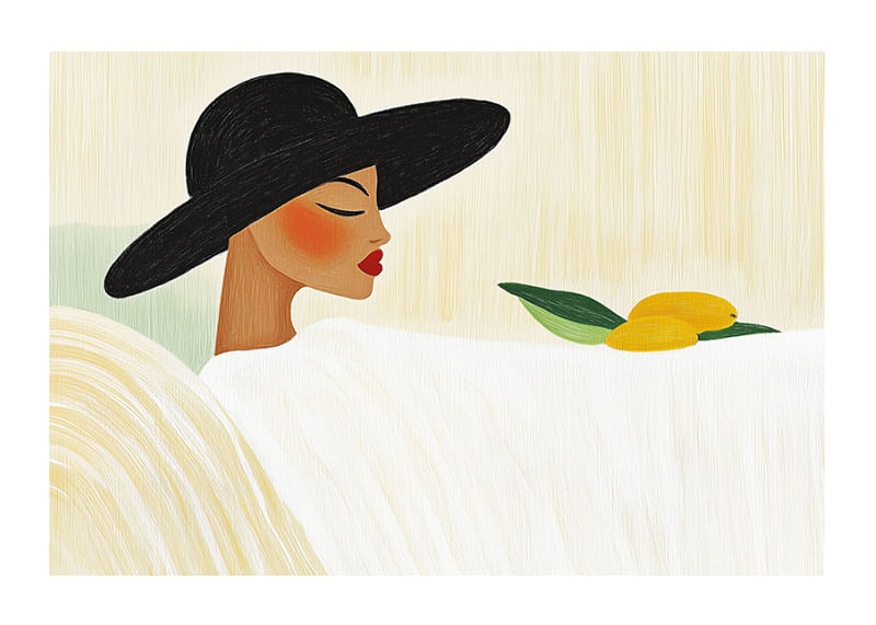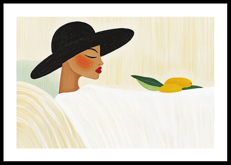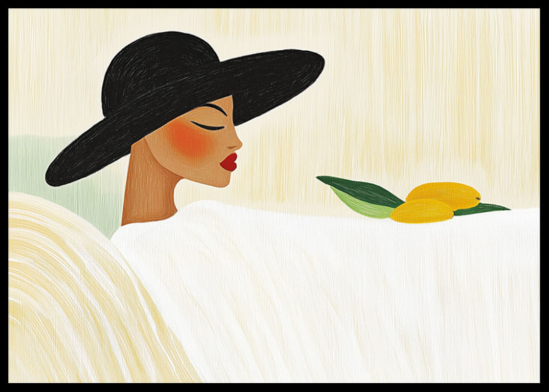 I denna poster ser vi en elegant kvinna iklädd en stor svart hatt, vilande mot en mjuk och ljus bakgrund, vilket skapar en stämning av lugn och introspektion. Hennes släta hy och röda läppar framhävs av det enkla motivet, medan de två citronerna med gröna blad tillför en hint av friskhet.