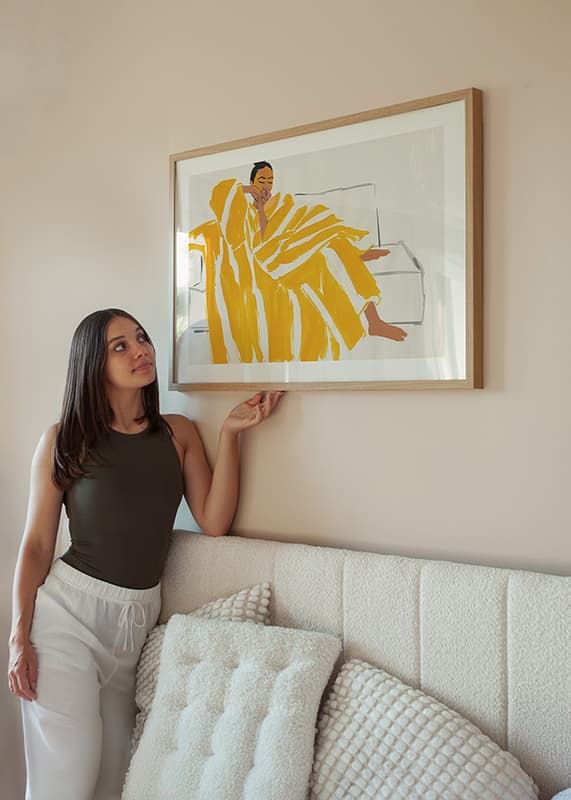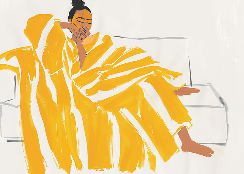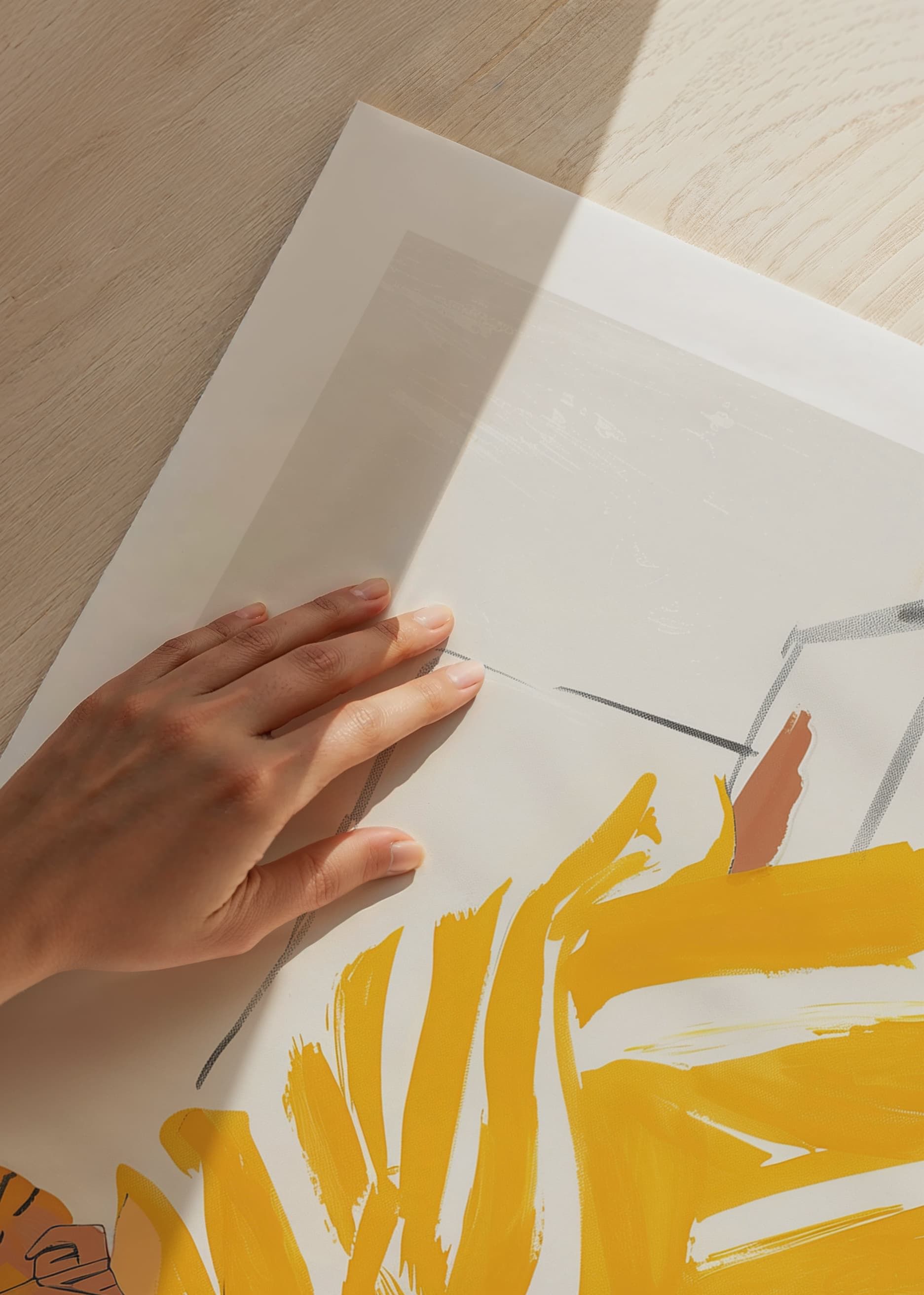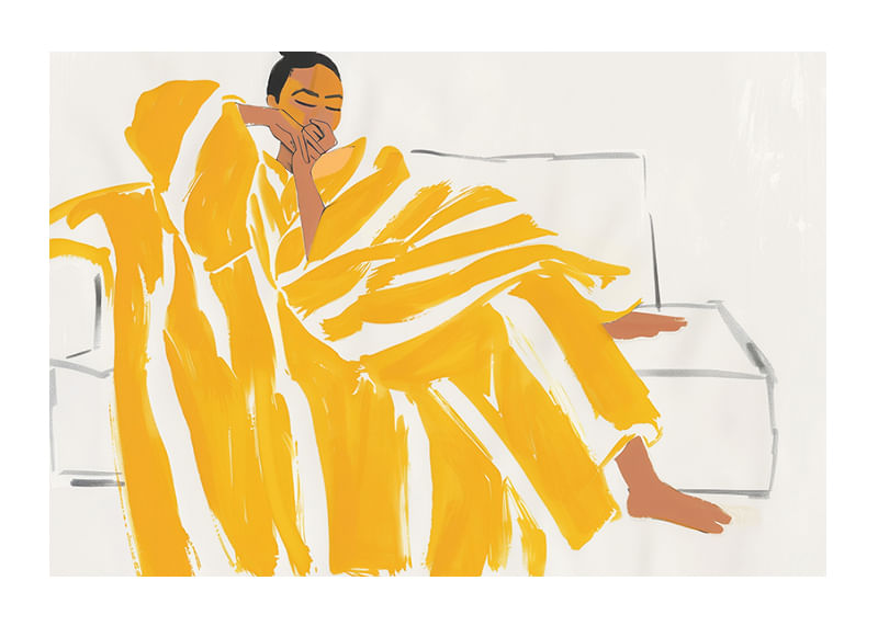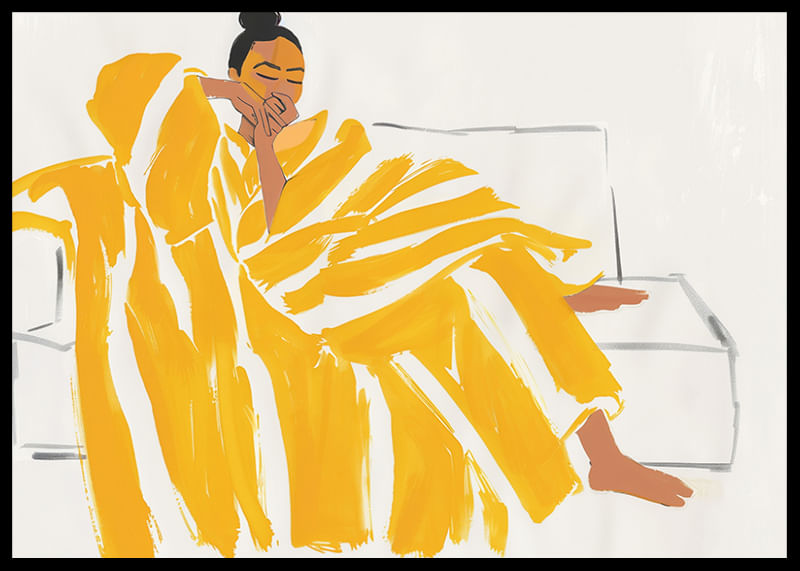 Denna poster fångar en avslappnad stund med en kvinna insvept i en strålande gul filt, som lyser upp hela rummet. De mjuka penseldragen och den djupa stillheten i hennes ansikte skapar en atmosfär av lugn och eftertanke.