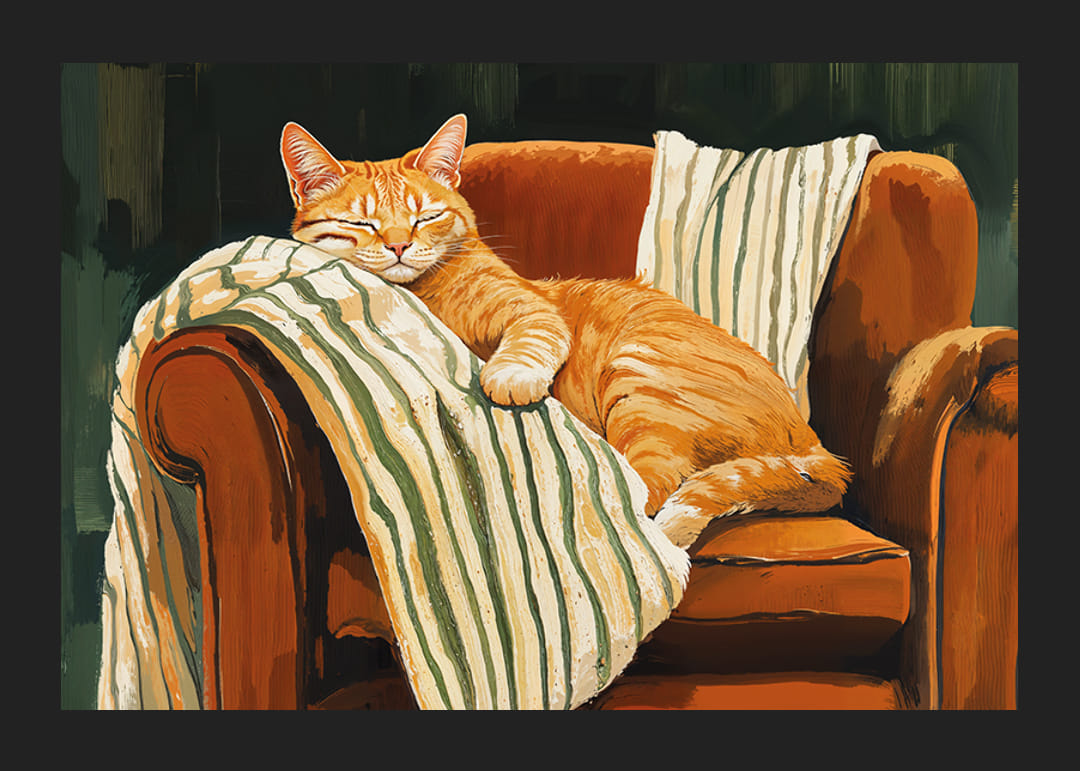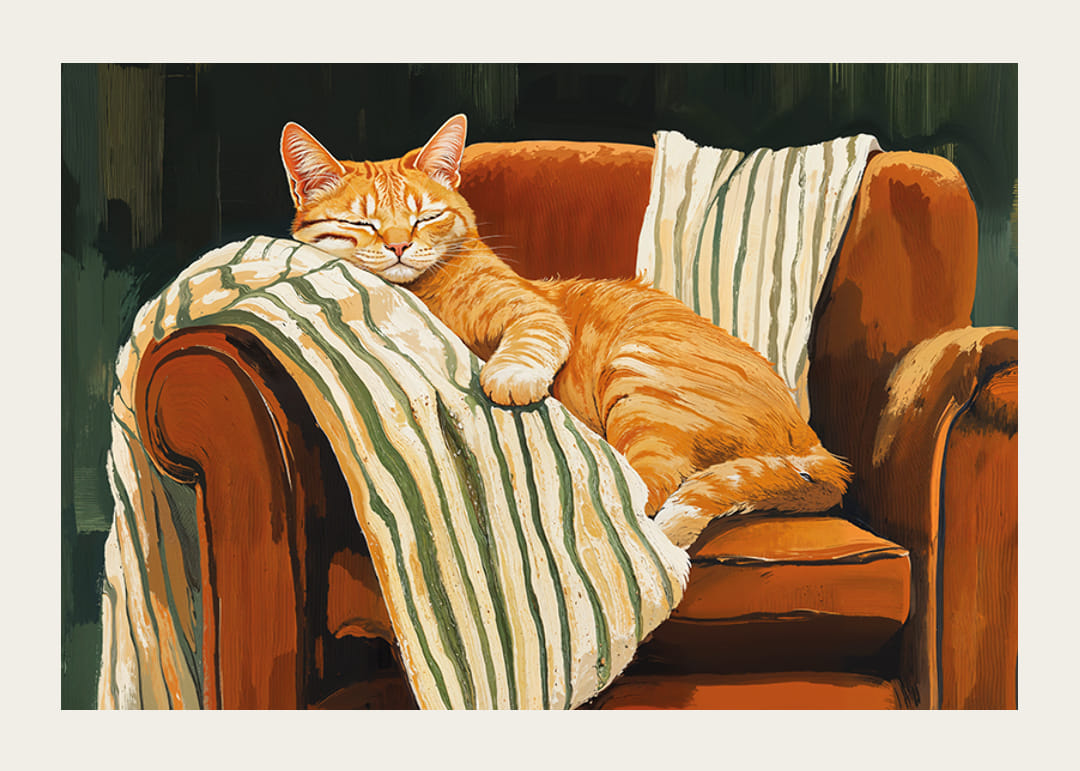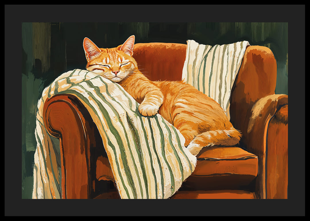 Denna poster fångar en varm känsla av hemmets lugn med en katt som sover fridfullt i en djupt brun fåtölj. Det mjuka, gyllene ljuset speglar sig i kattens päls, medan den randiga filten tillför ett subtilt mönster till scenen.