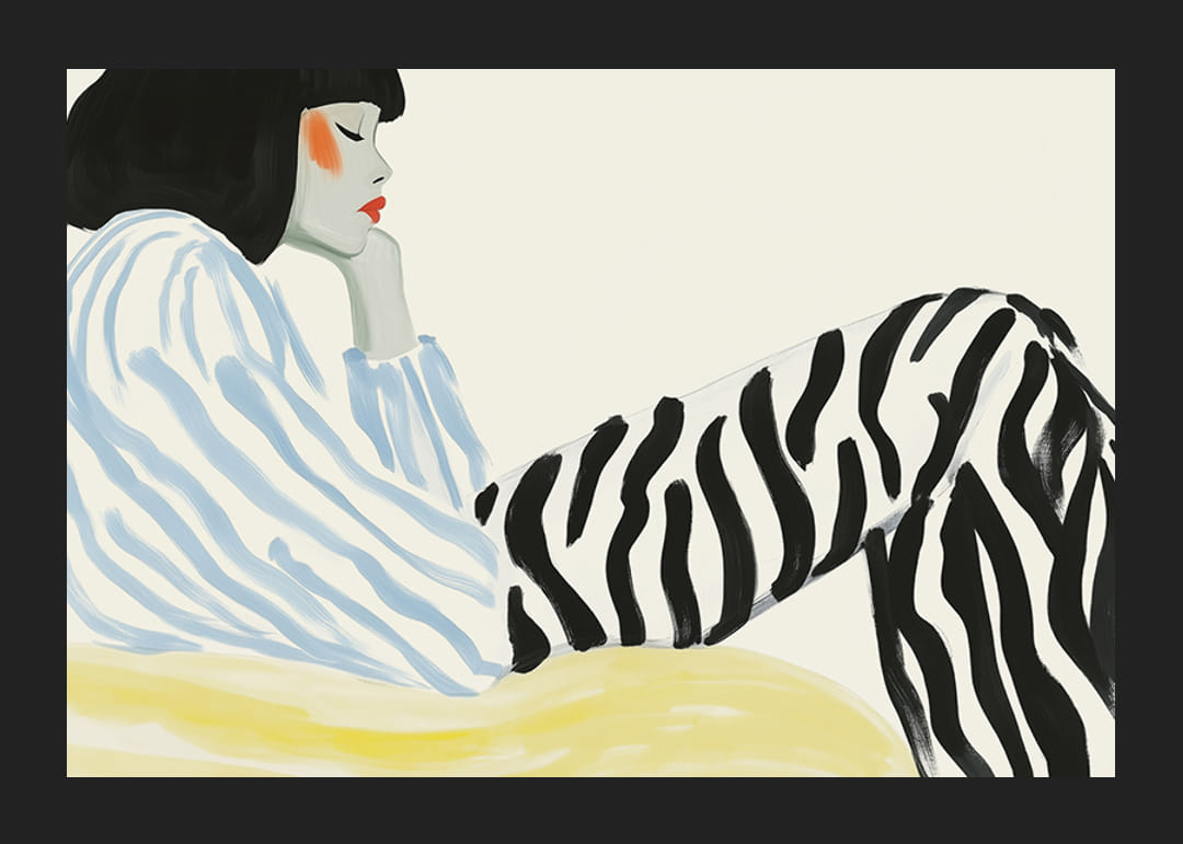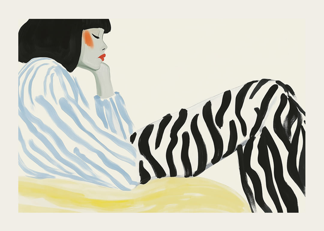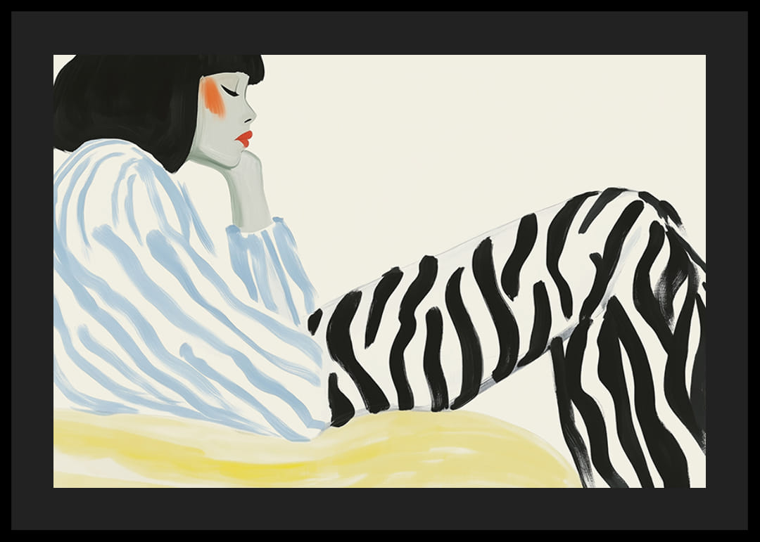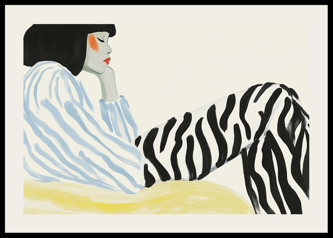 Denna poster fångar en känsla av lugn och stil genom sitt grafiska porträtt där zebramönster möter mjuka färgtoner. Den avslappnade posen hos motivet skapar ett intryck av djup och eftertänksamhet.