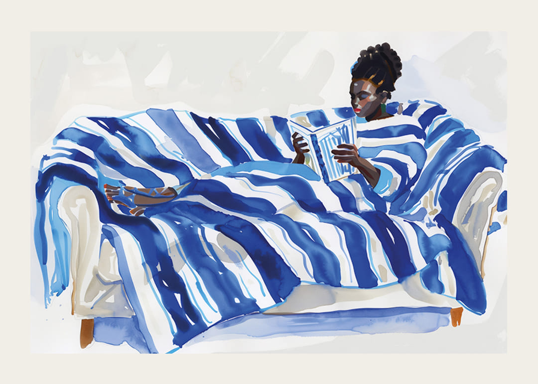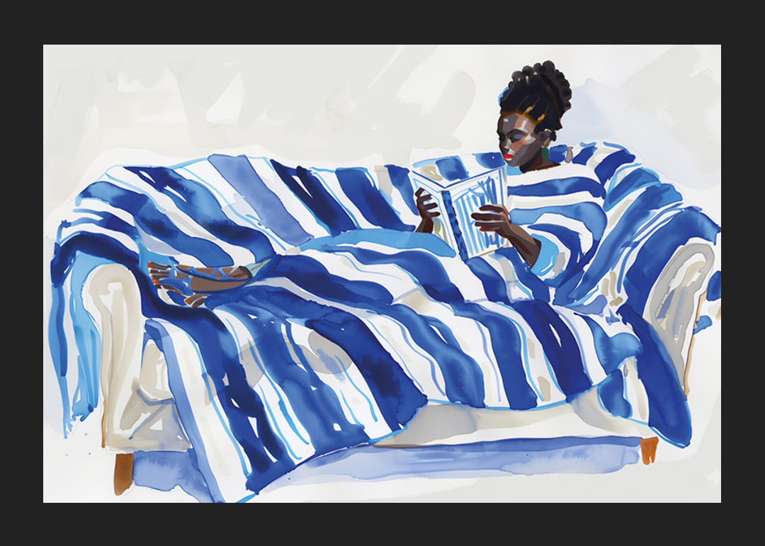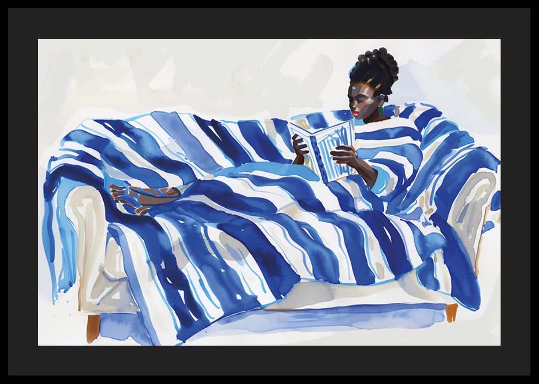 Upptäck en avkopplande värld genom denna poster där en person vilar på en soffa täckt av dynamiska blåvita ränder. Kontrasten mellan de djärva strecken och den lugna läsupplevelsen skapar en harmonisk atmosfär.