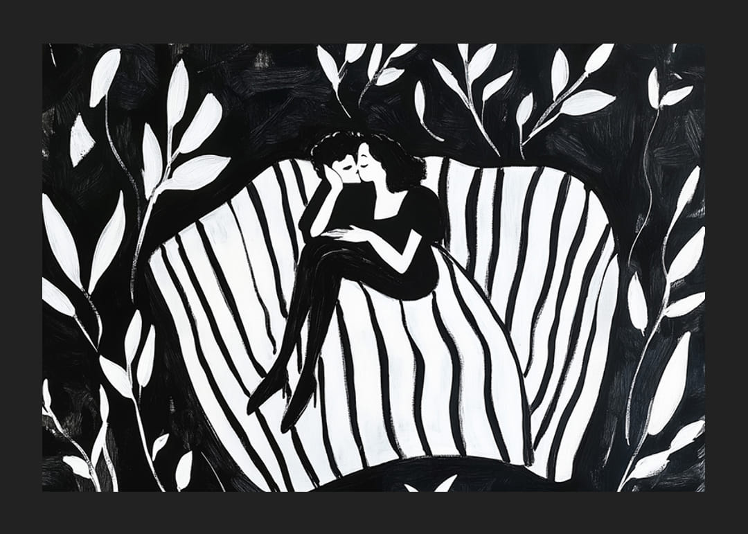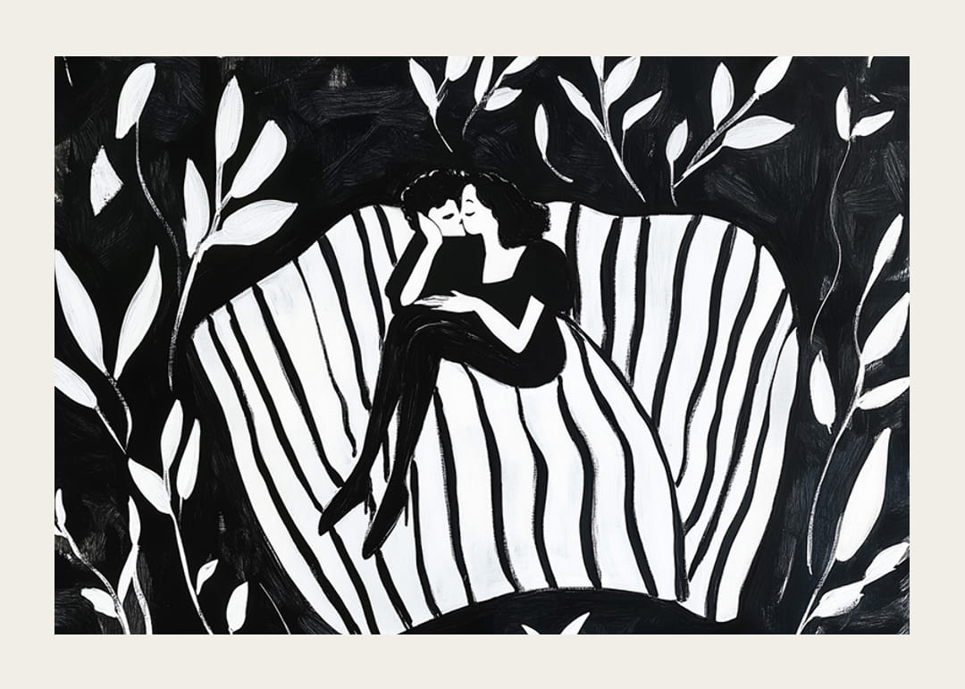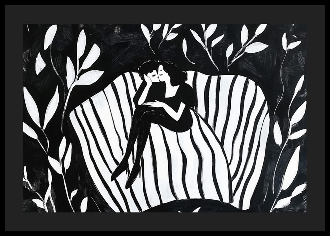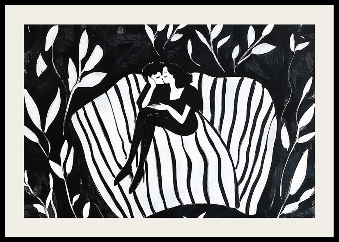 Denna poster fångar ett par i en drömlik omfamning, omgivna av harmoniska mönster i svart och vitt. Denna bild förkroppsligar en känsla av lugn och närhet, där kärleken talar i tystnadens språk.