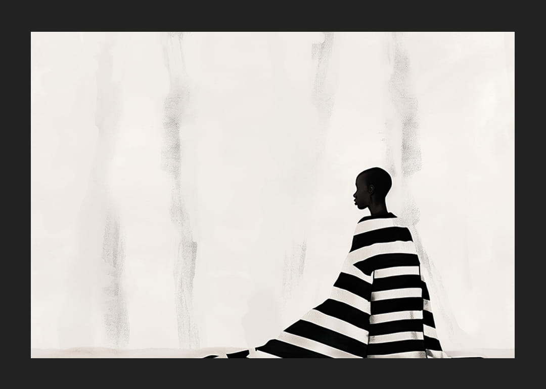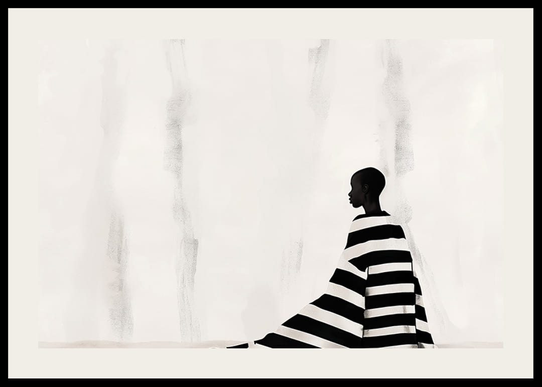 Den här postern fångar ögat med sin kontrast mellan en elegant svartvit figur och en mjuk, subtil bakgrund. Den harmoniska föreningen av ränder och den tysta profilen skapar en känsla av lugn och introspektion.