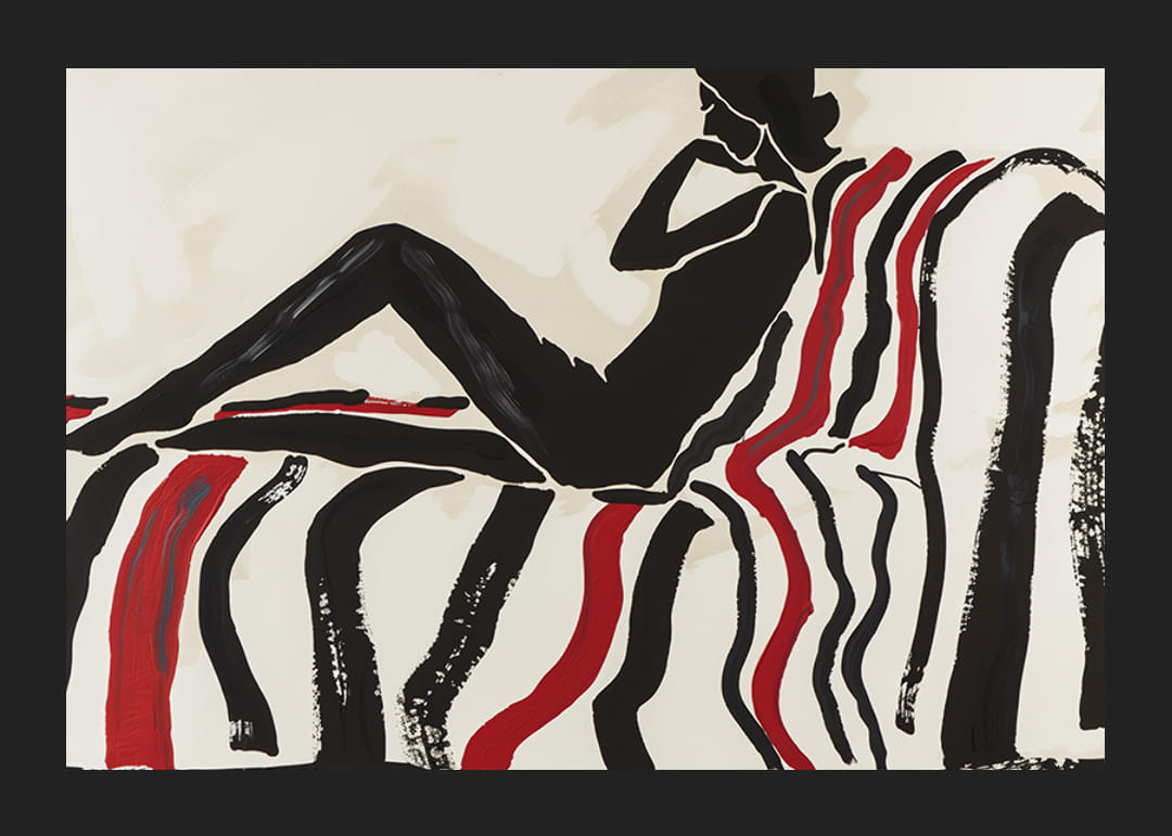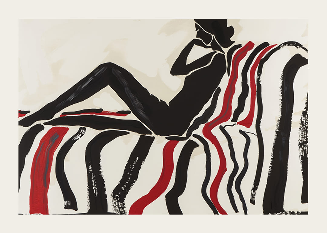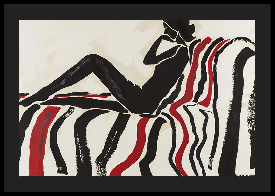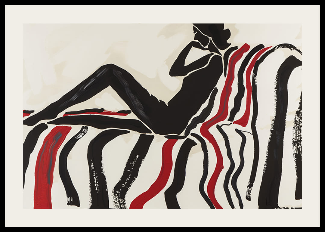 Denna poster fångar ögat med en elegant, kontrastfylld silhuett som vilar avslappnat på en soffa dekorerad i röda och svarta böljande linjer. Den enkla men effektfulla färgpaletten skapar en känsla av lugn och sofistikering.
