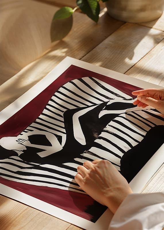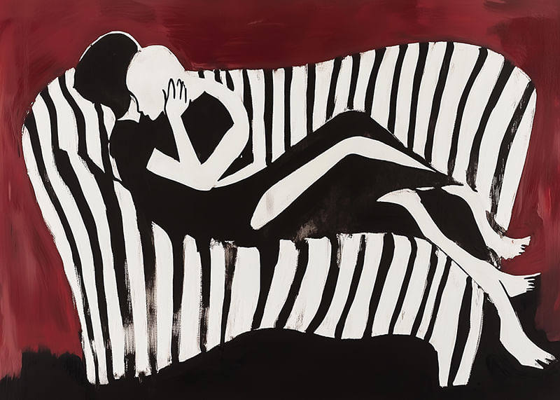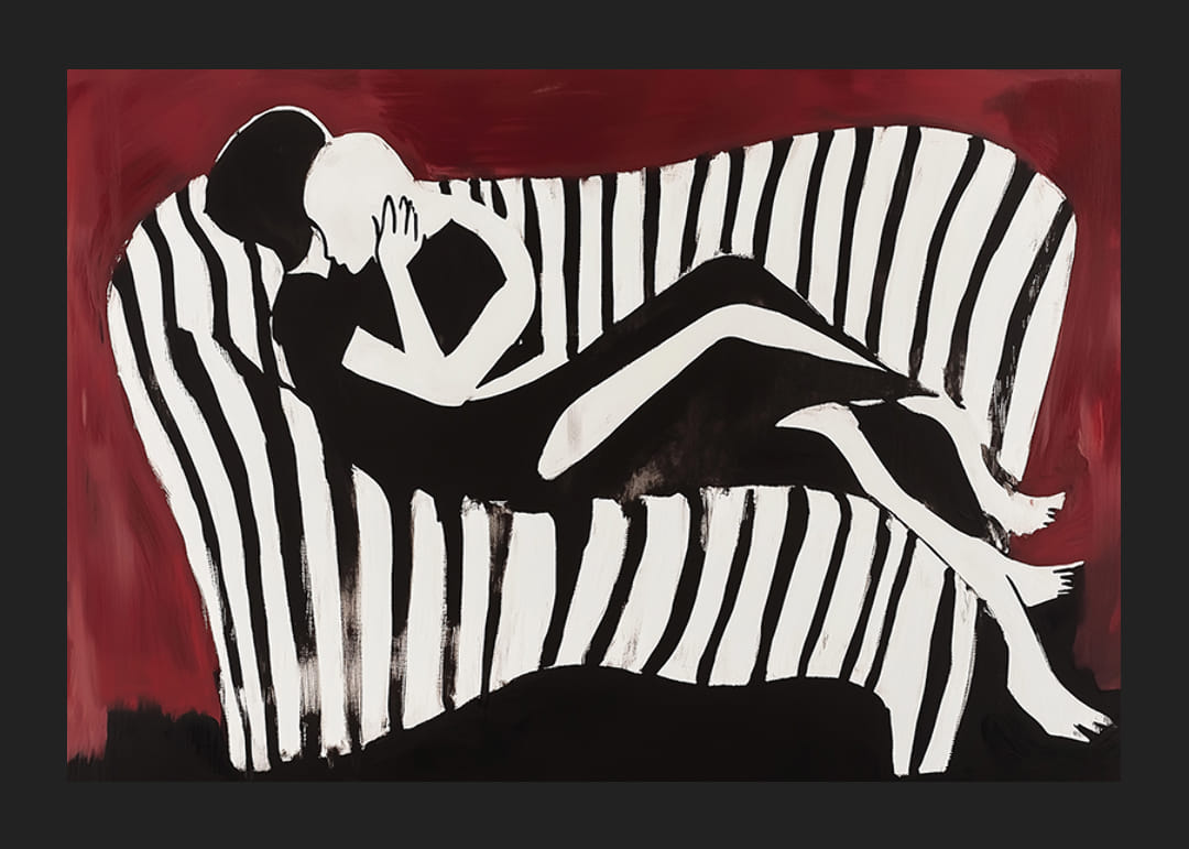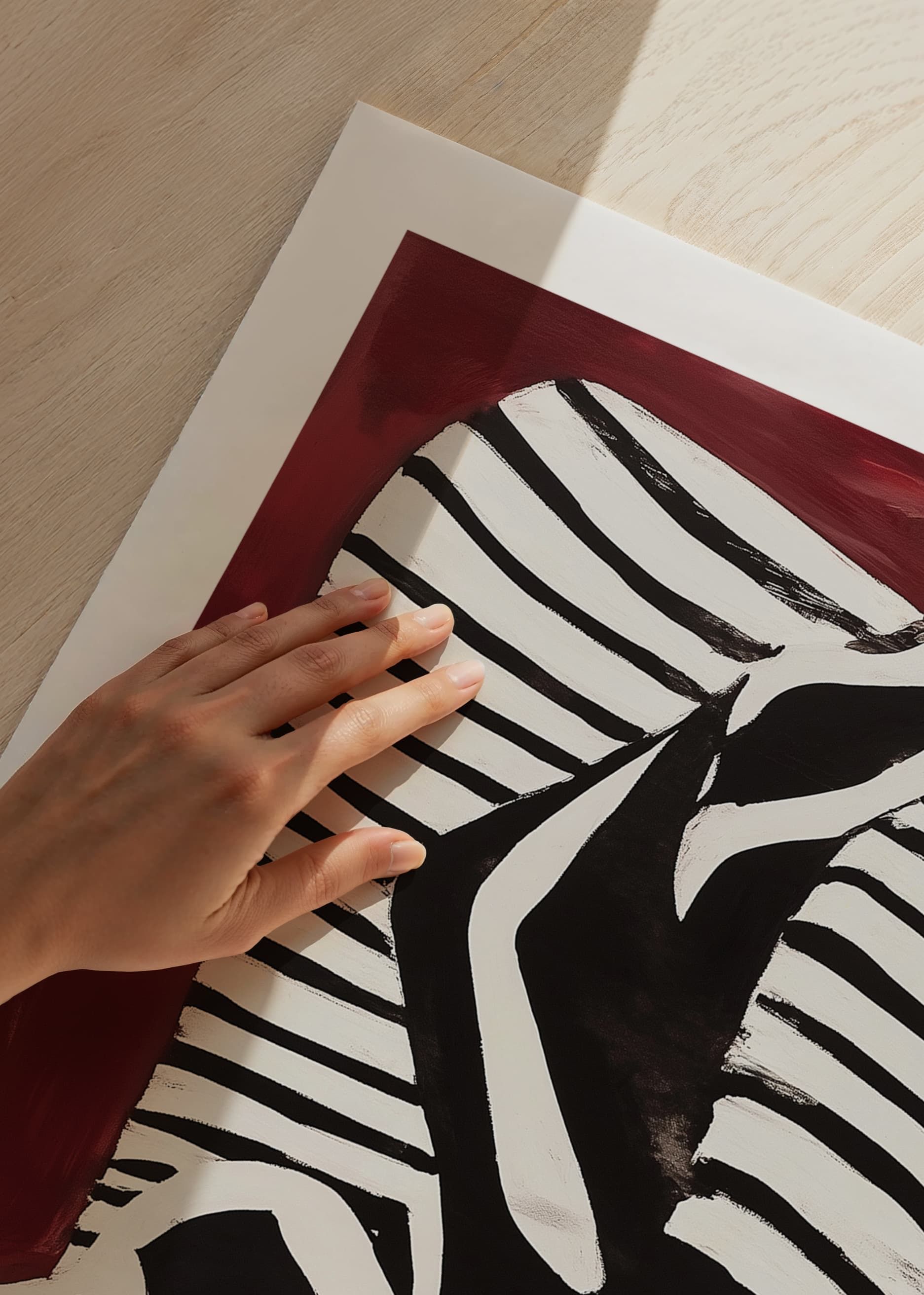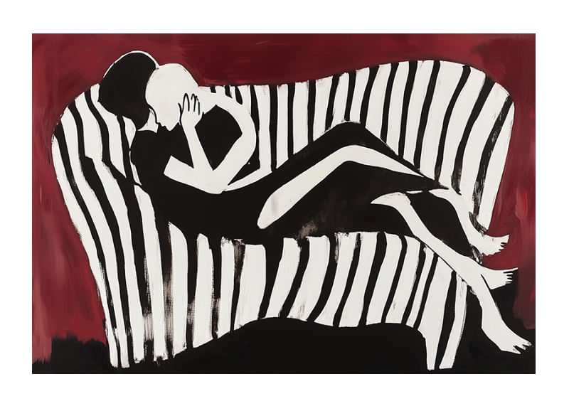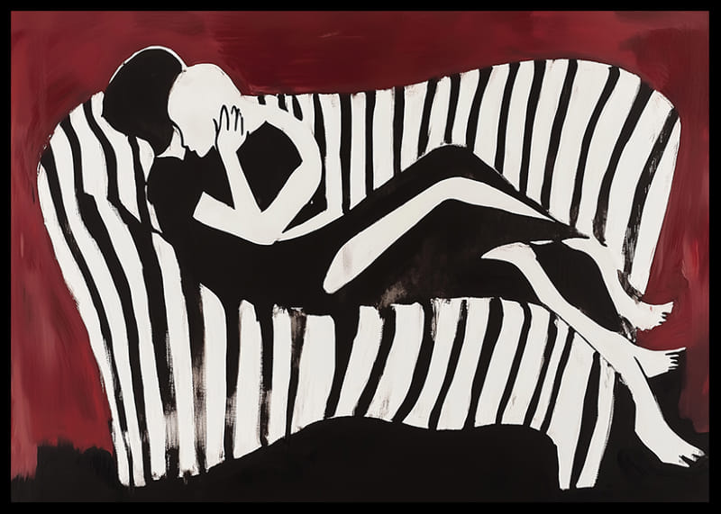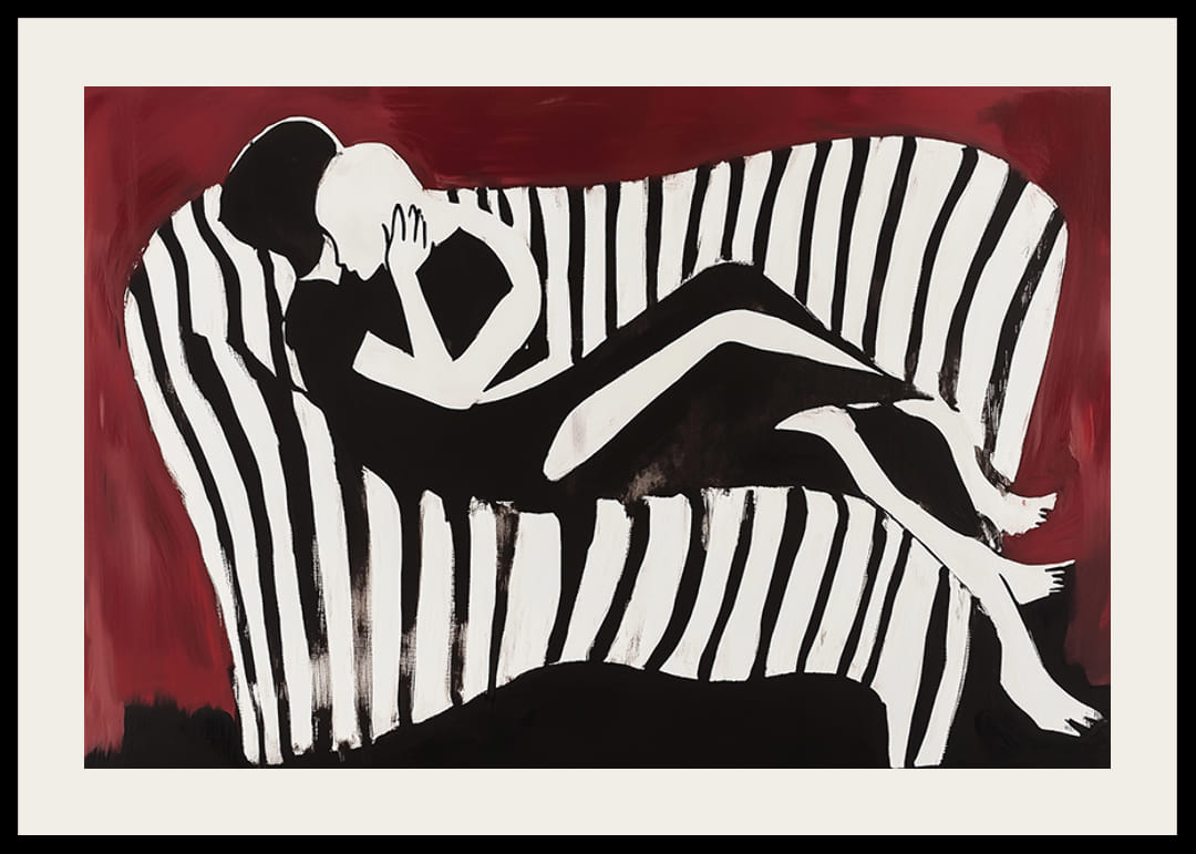 Denna poster fångar en intim och emotionell silhuett av två personer i kärleksfull omfamning på en randig svartvit soffa. Mot den djupa röda bakgrunden skapas en stark kontrast som förstärker det passionerade uttrycket.
