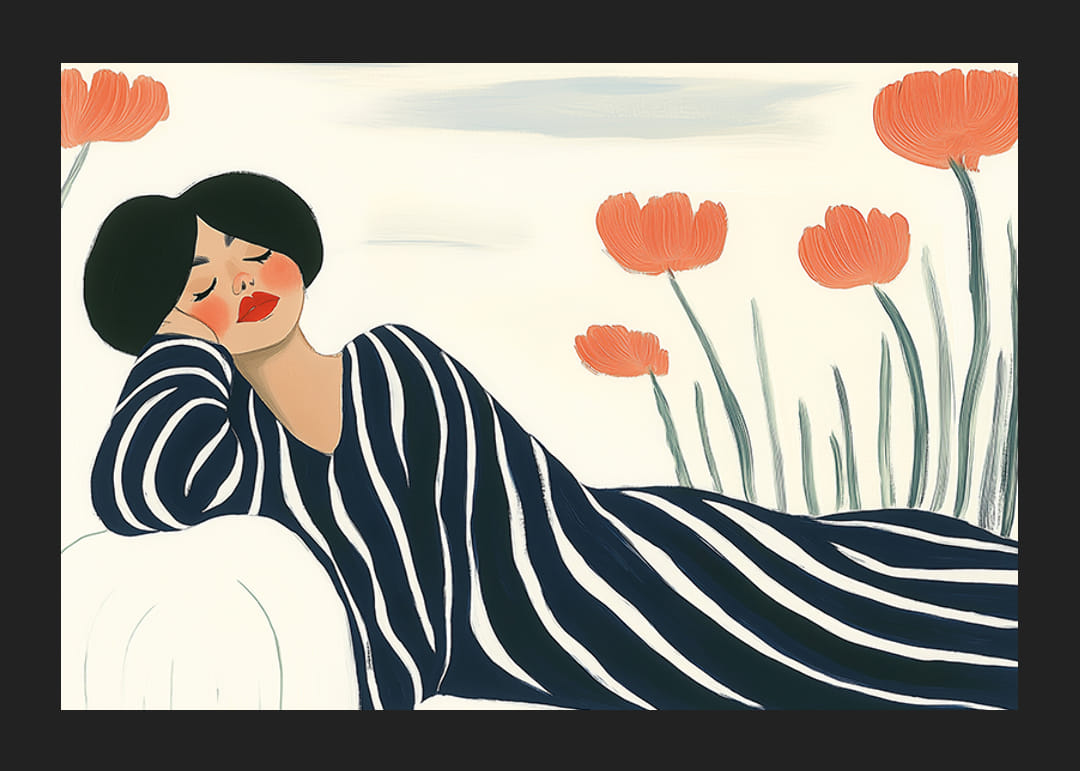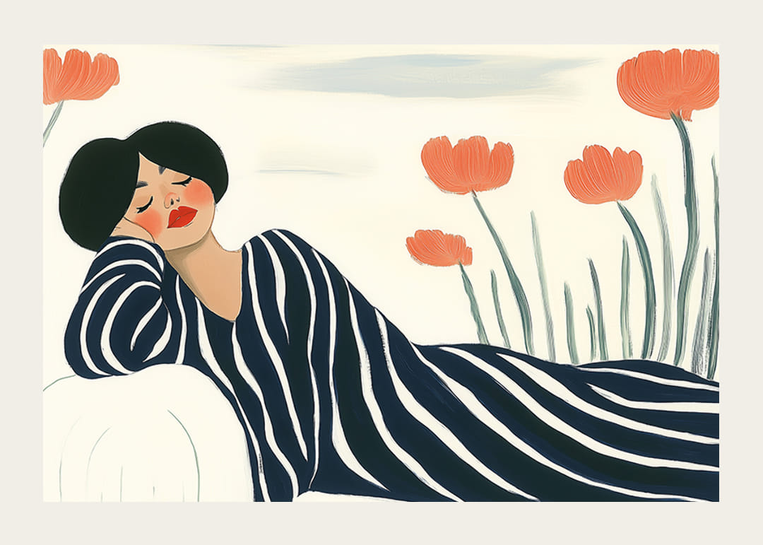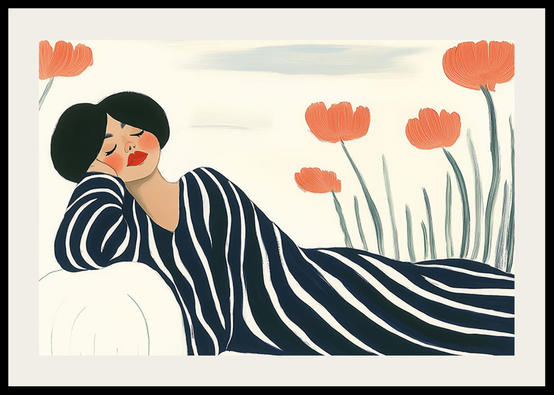Denna poster fångar en kvinna som vilar fridfullt i en randig klänning, omgiven av levande orange blommor mot en ljus bakgrund. Hennes avslappnade uttryck och de mjuka vågorna i tygets mönster skapar en harmoni mellan stillhet och livfullhet.