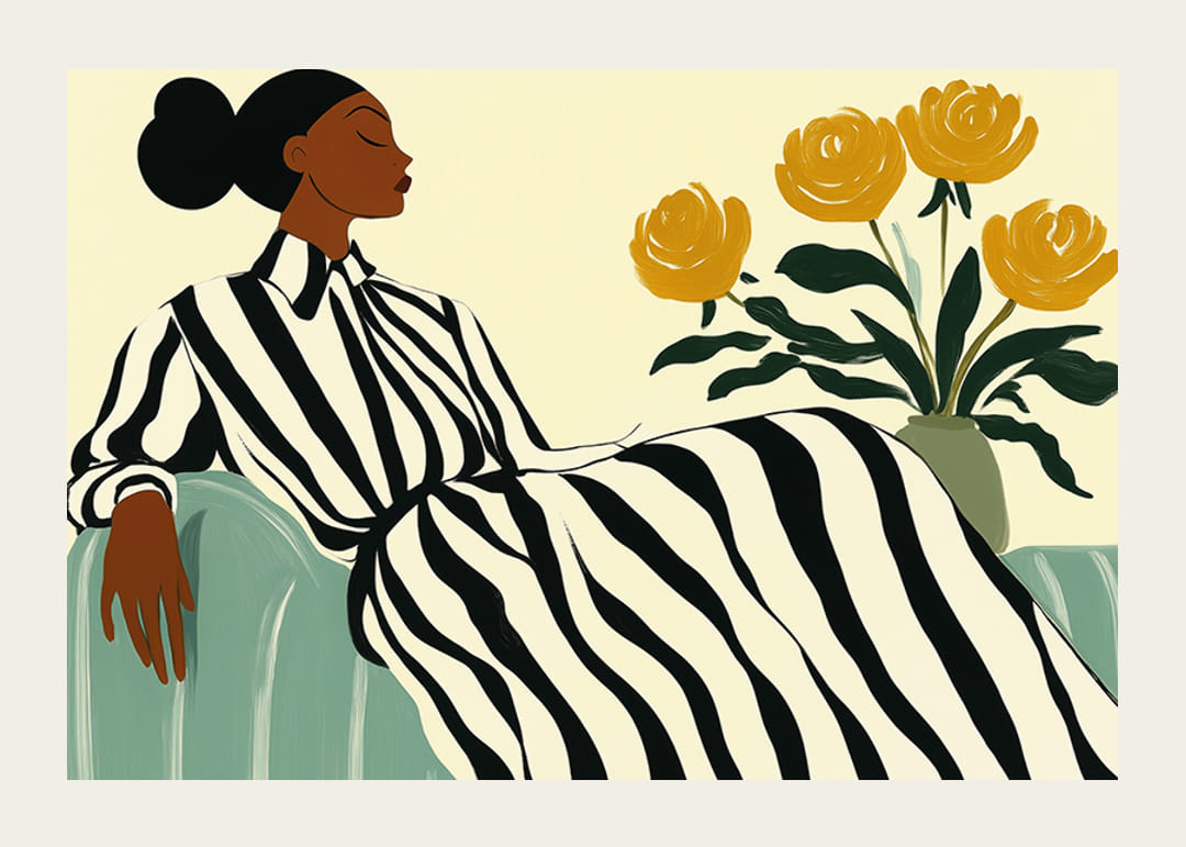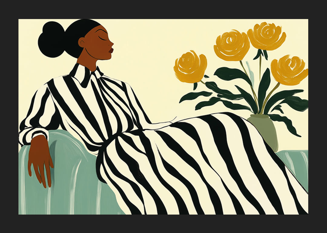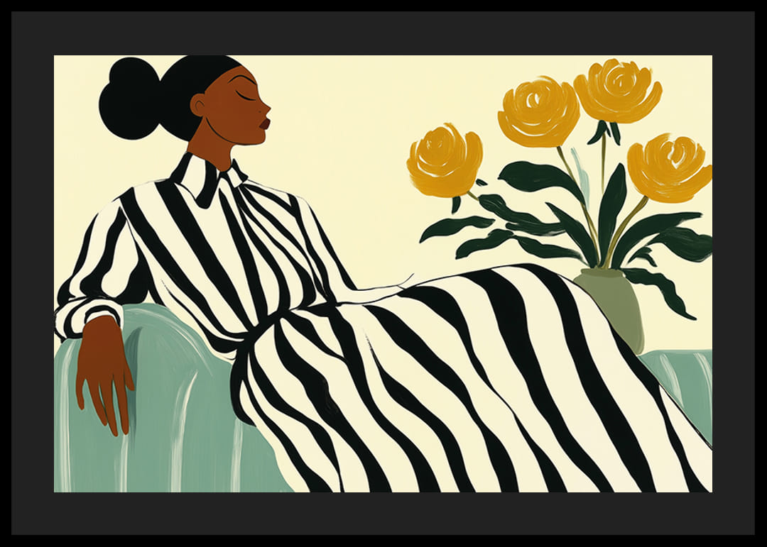 Denna poster fångar en elegant kvinna klädd i en slående svartvit randig klänning, vilande med grace på en fåtölj. Bredvid henne står en bukett med gyllene blommor som tillför värme och färg till kompositionen.