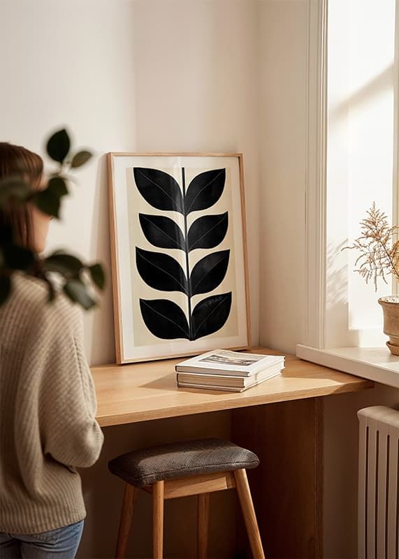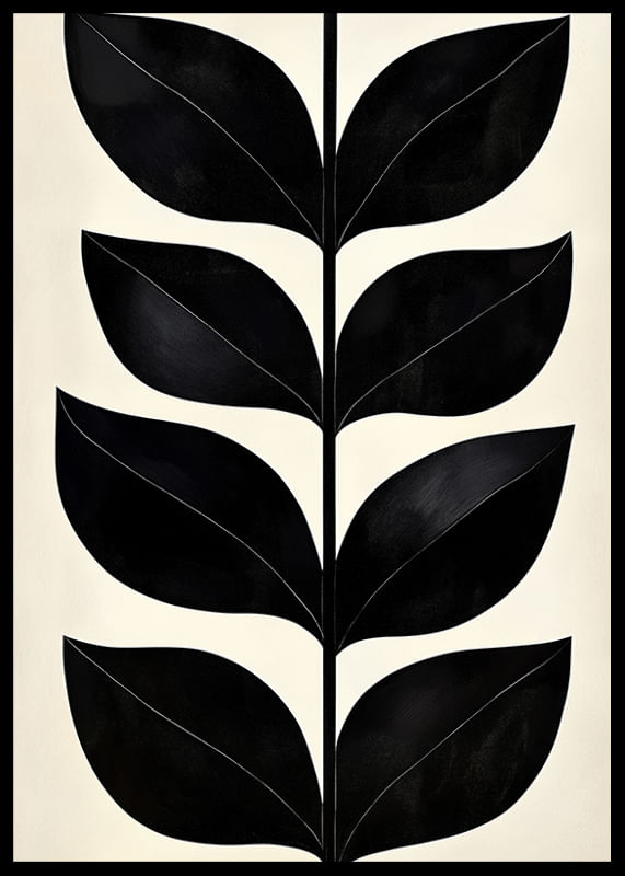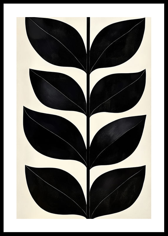 Denna poster fångar essensen av modern minimalism med sina stiliserade svarta löv mot en cremefärgad bakgrund. Den enkla och eleganta kontrasten skapar en lugnande atmosfär som passar perfekt i varje rum.