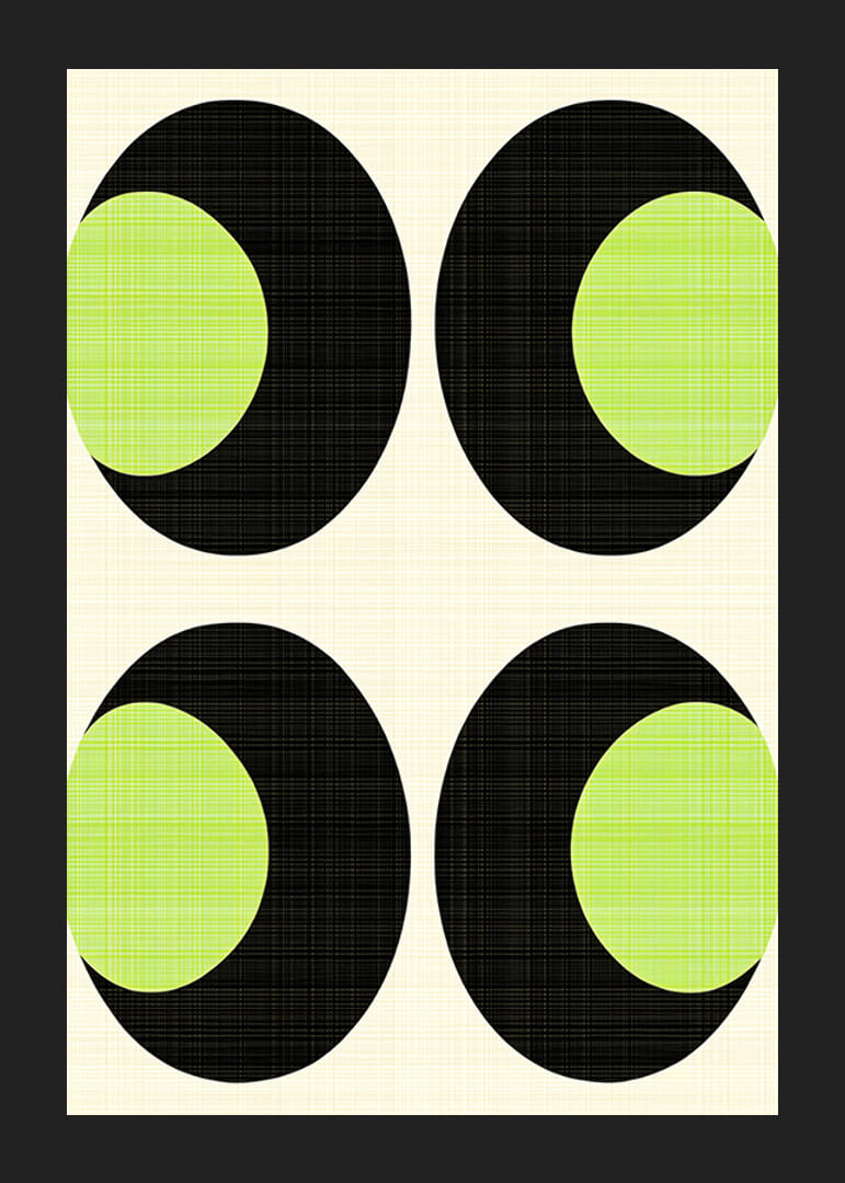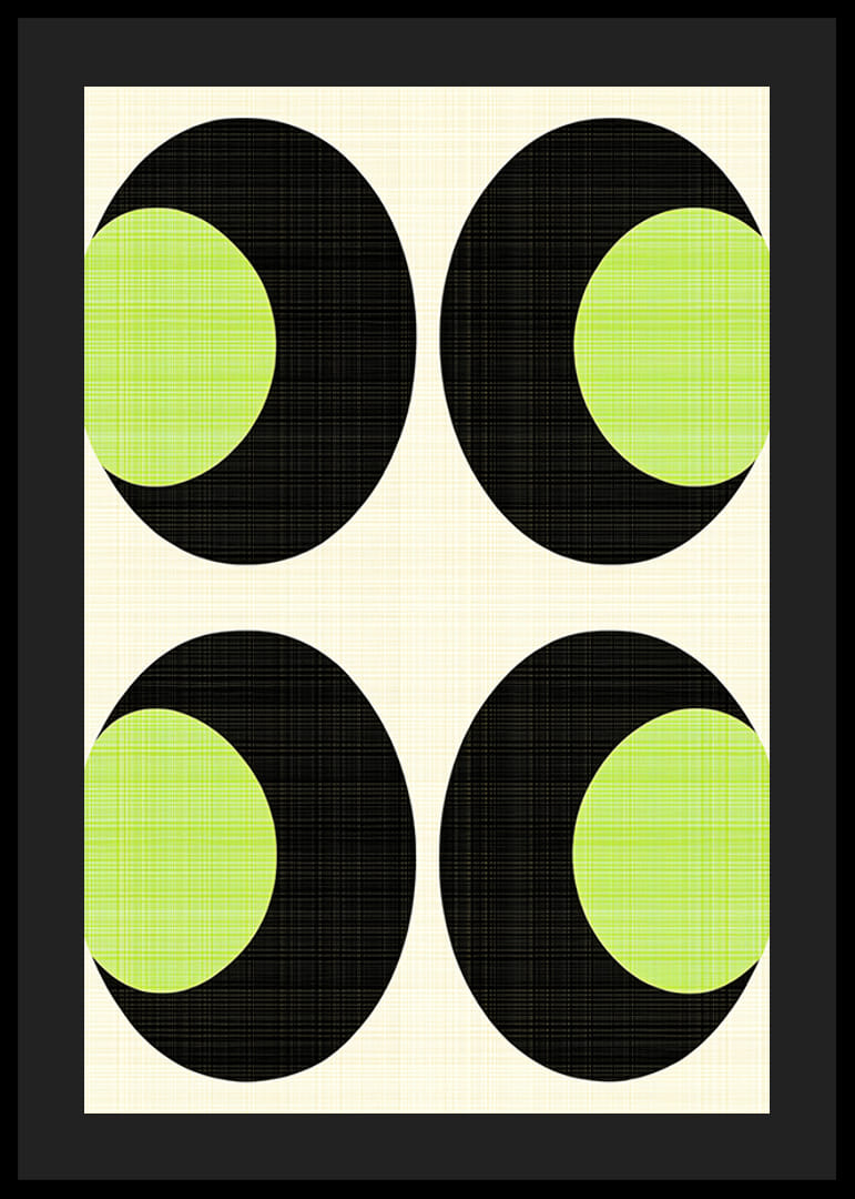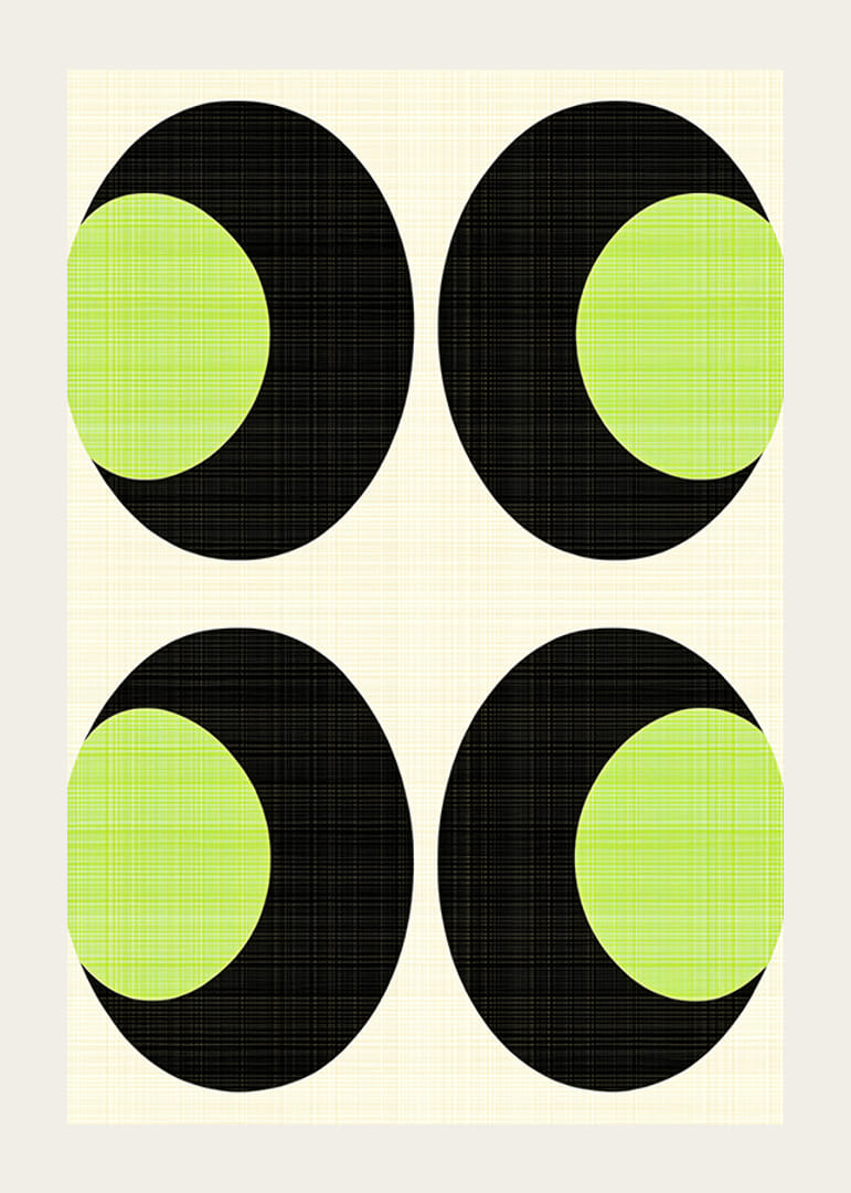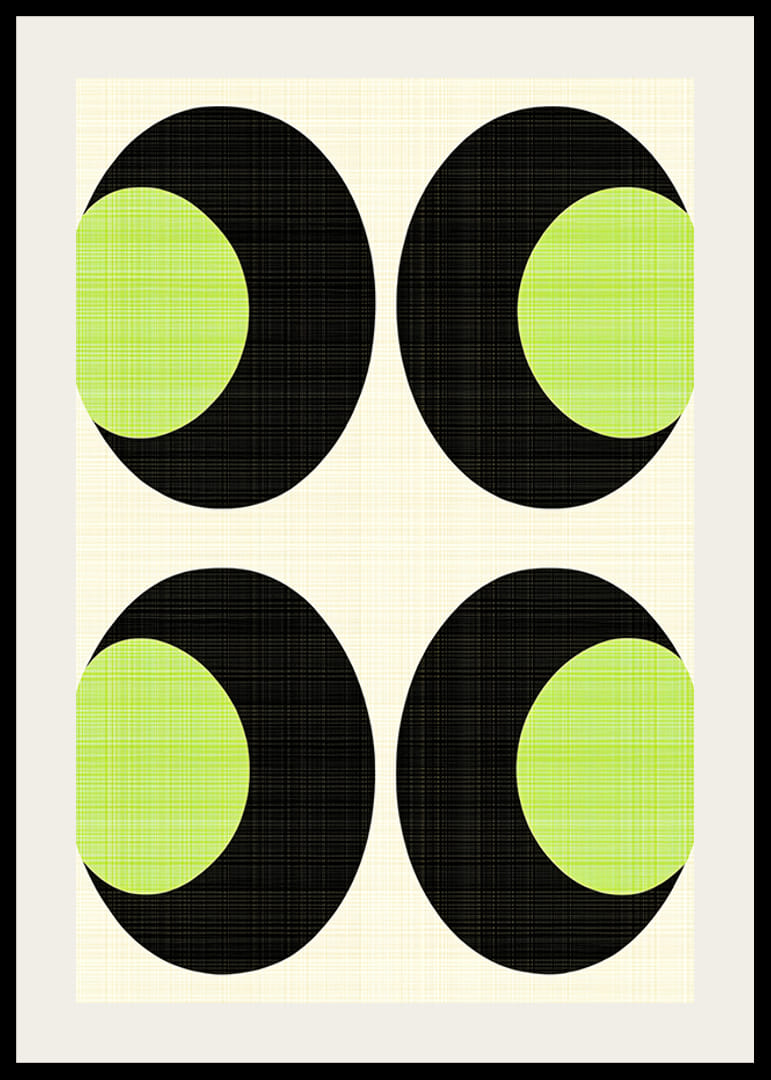 Denna poster fångar blicken med sina djärva svarta och livfulla gröna cirklar i ett rytmiskt och geometriskt mönster. Den subtila bakgrunden förstärker kontrasten och ger en känsla av balans och lugn.