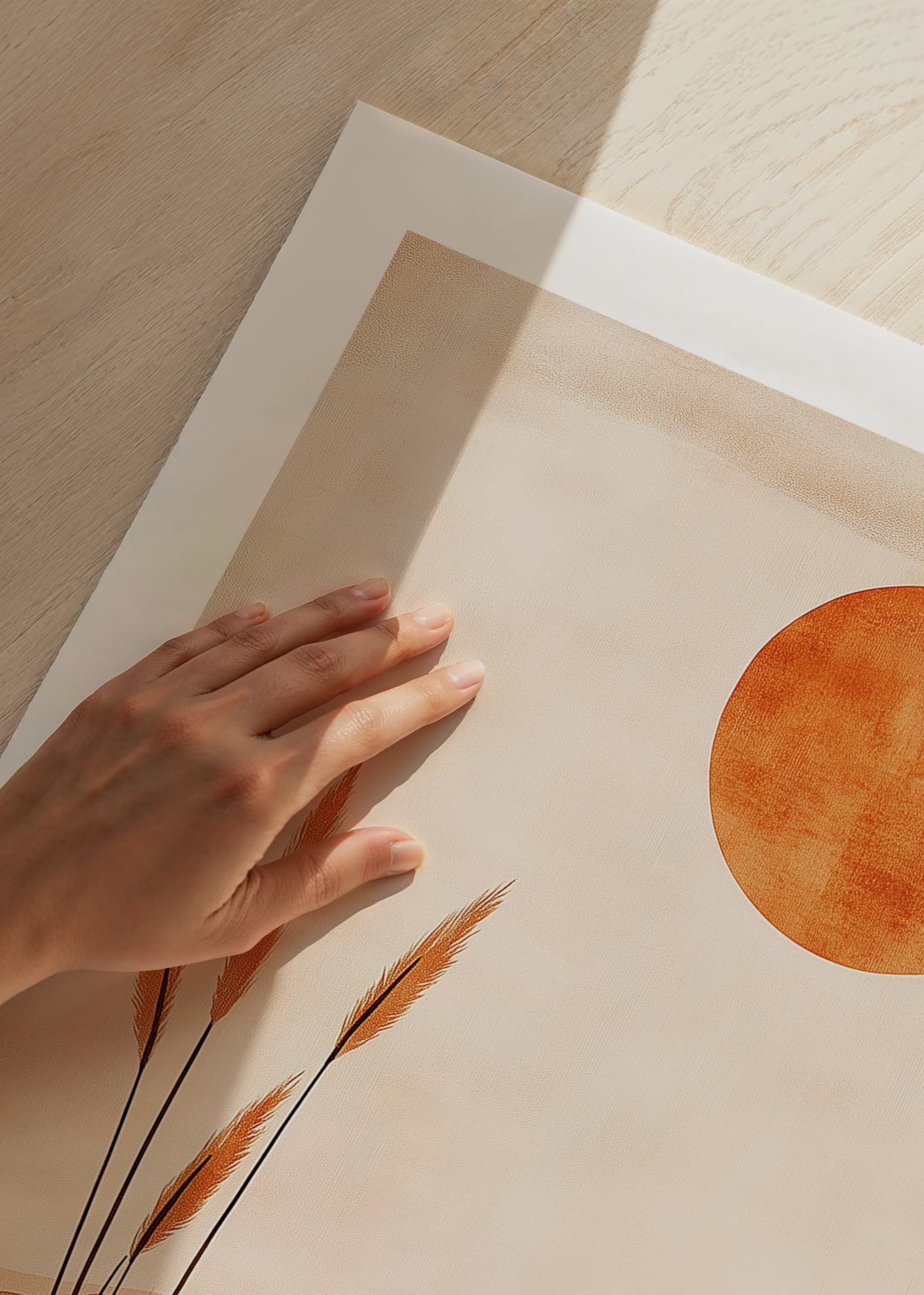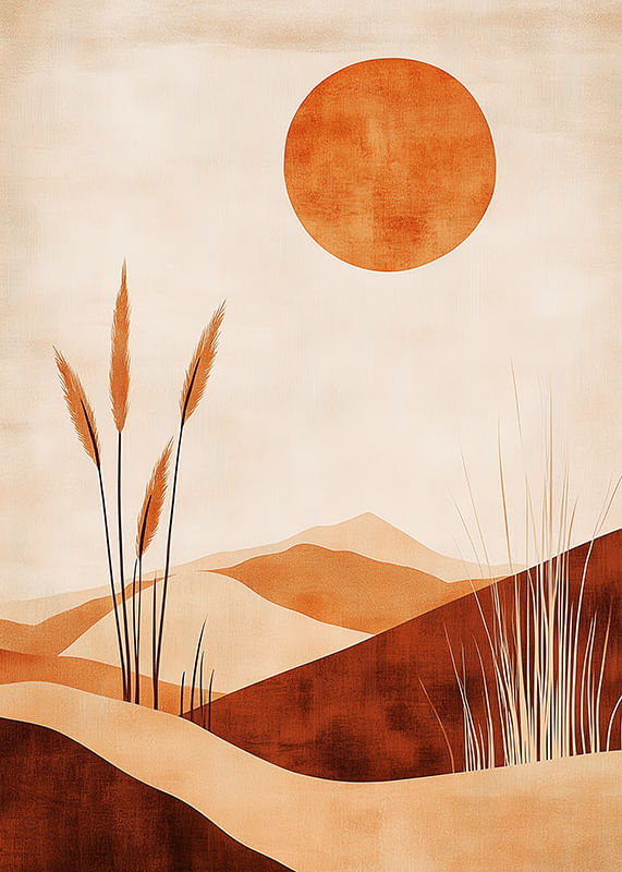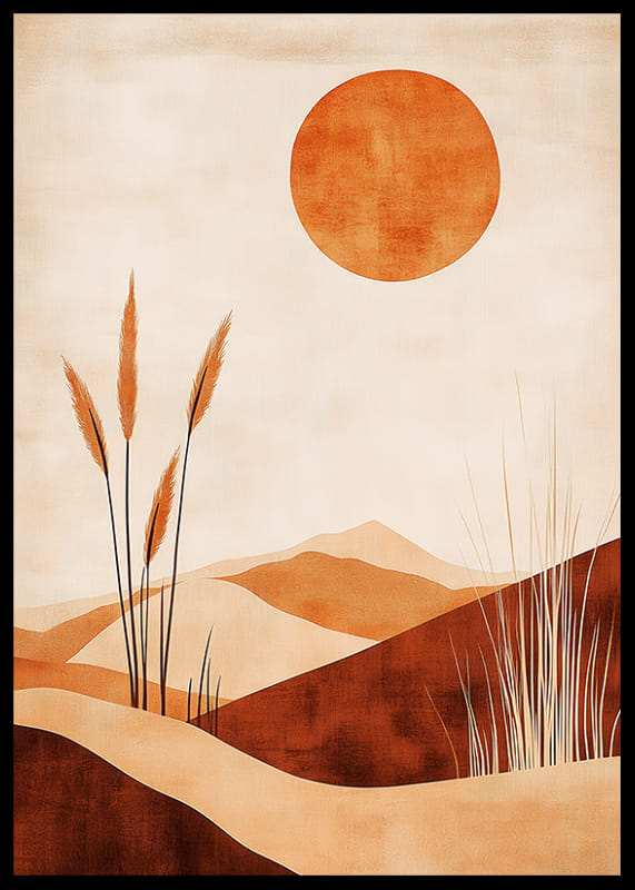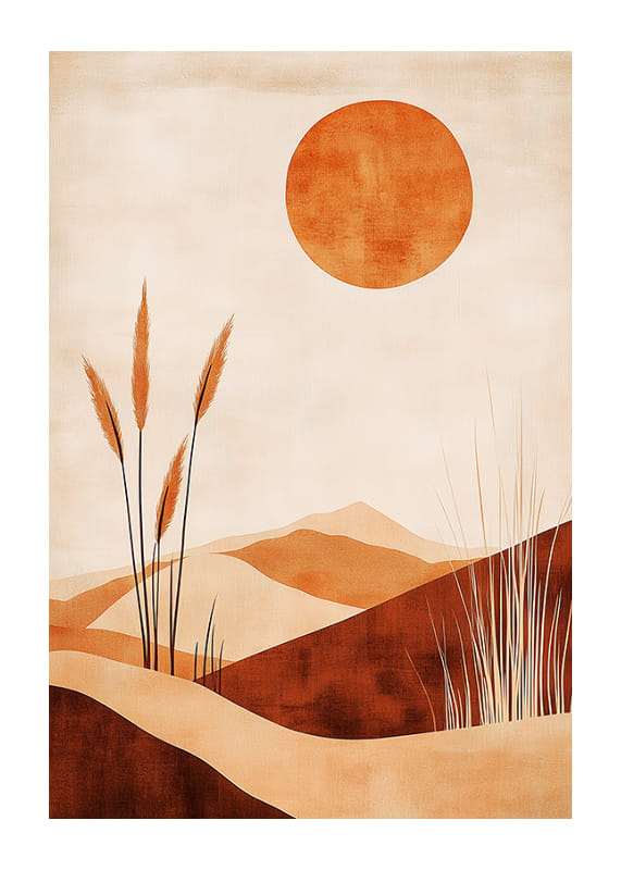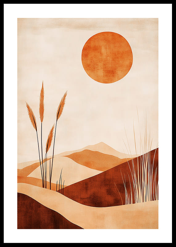 Denna poster fångar en känsla av lugn med sitt ökenlandskap i varma, jordnära toner. Solen står högt på himlen och skapar ett spel av ljus och skuggor över de mjuka sanddynerna. Växtlighet bryter av och skapar balans i kompositionen.