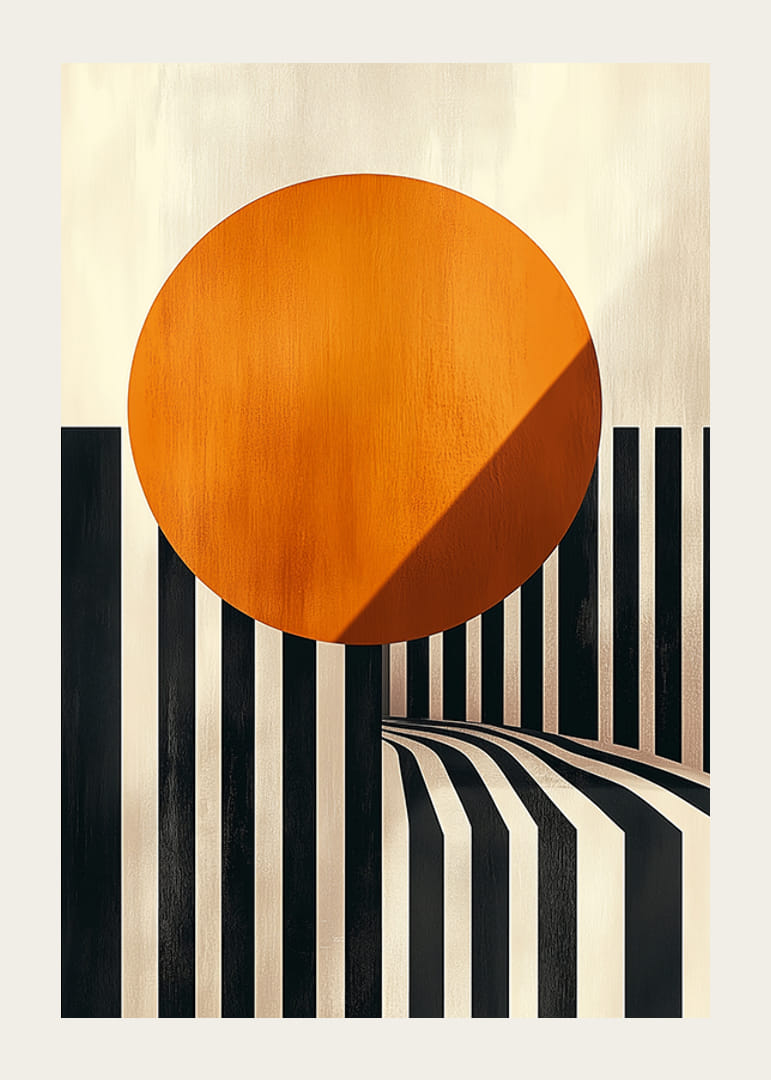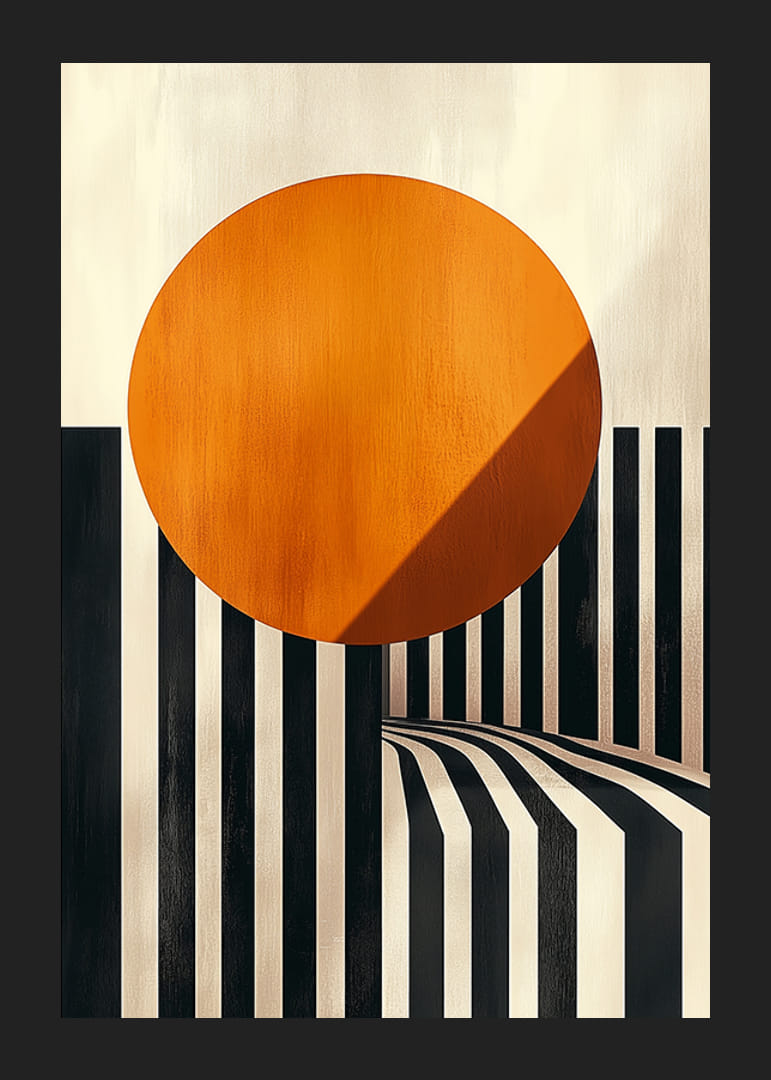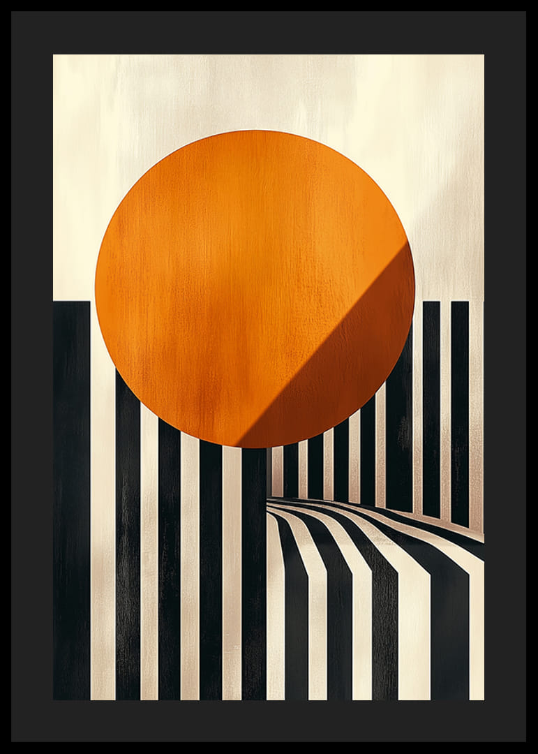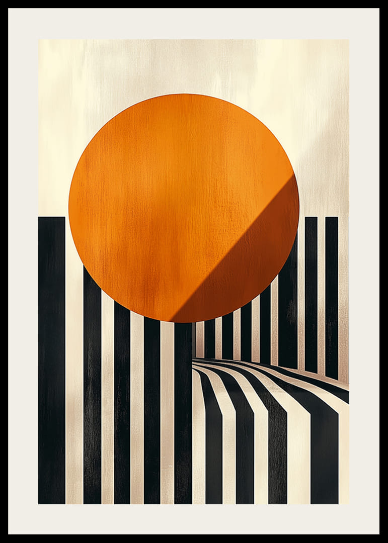 Upptäck en poster där kontrastrika svarta och vita linjer harmoniserar med en strålande orange cirkel som tycks sväva i förgrunden. Den svepande rörelsen av linjerna skapar en hypnotisk känsla av djup och dimension, och kombinationen av färger ger rummet både energi och värme.
