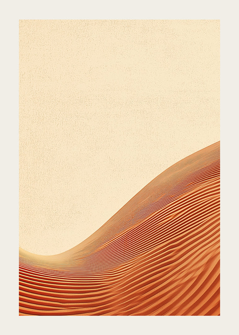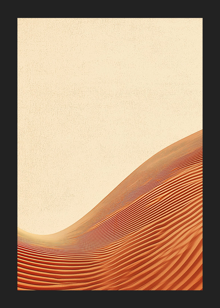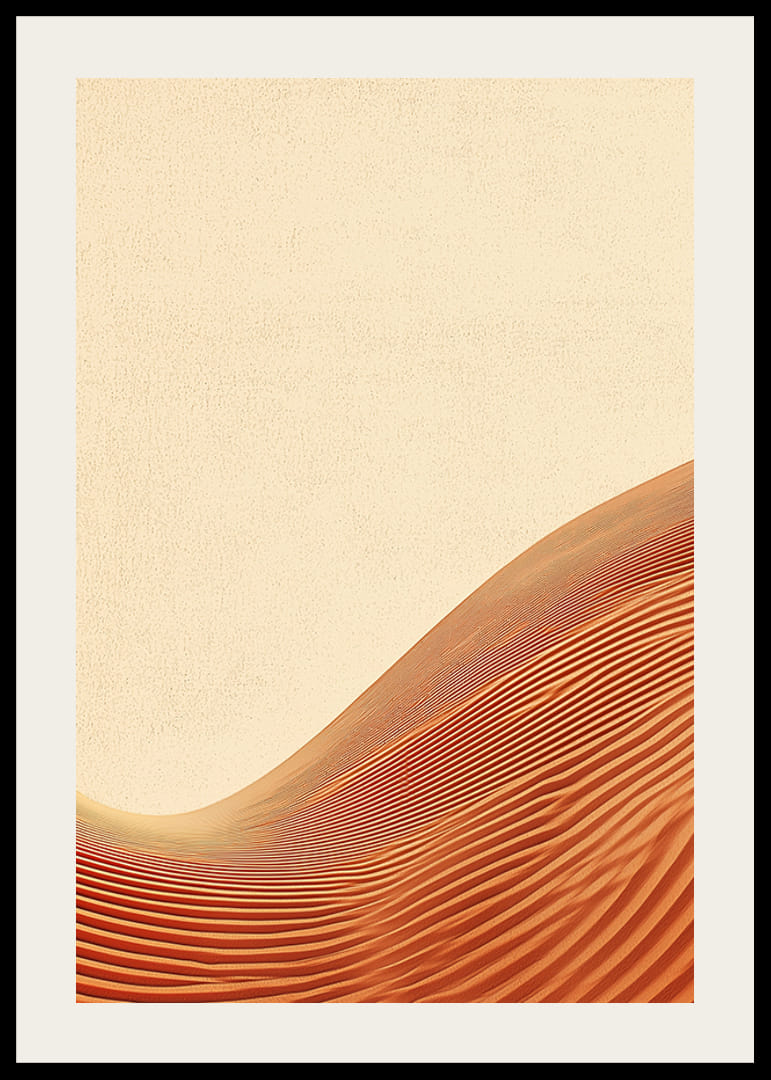 Denna poster fångar ögonen med sina mjuka sandvågor som väcker en känsla av stillhet och harmoni. De böljande formerna i varm sandton mot en ljus bakgrund ger en tidlös och elegant estetik.