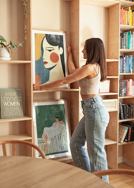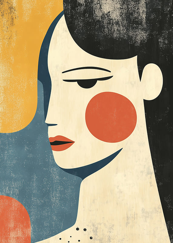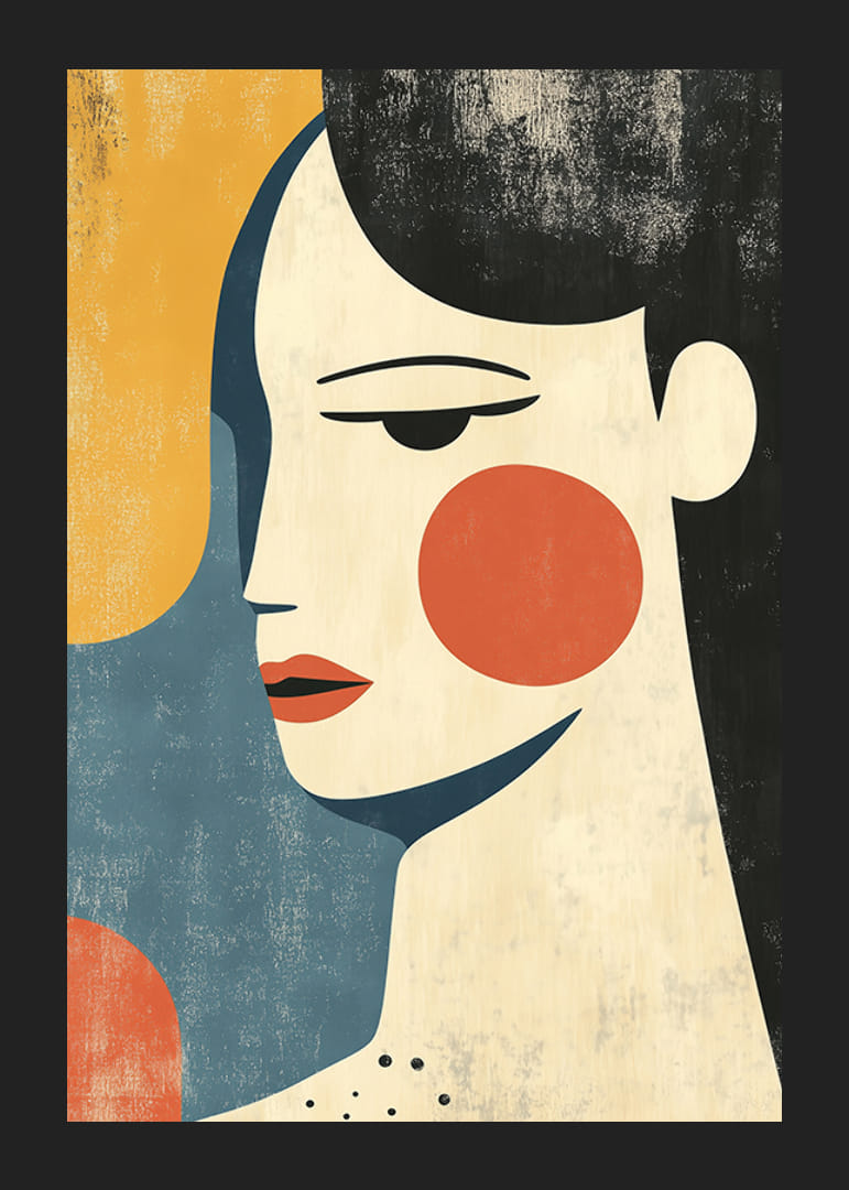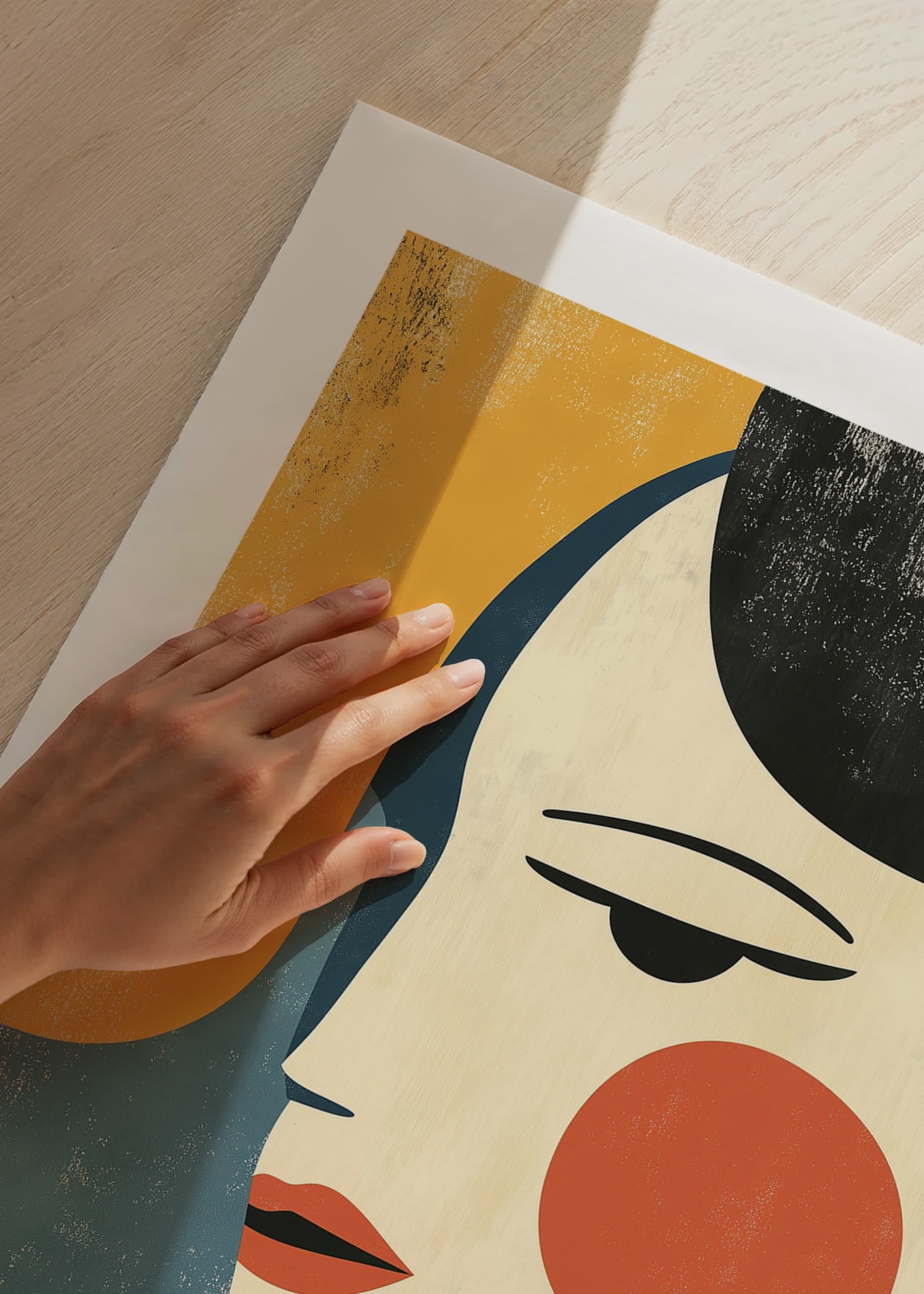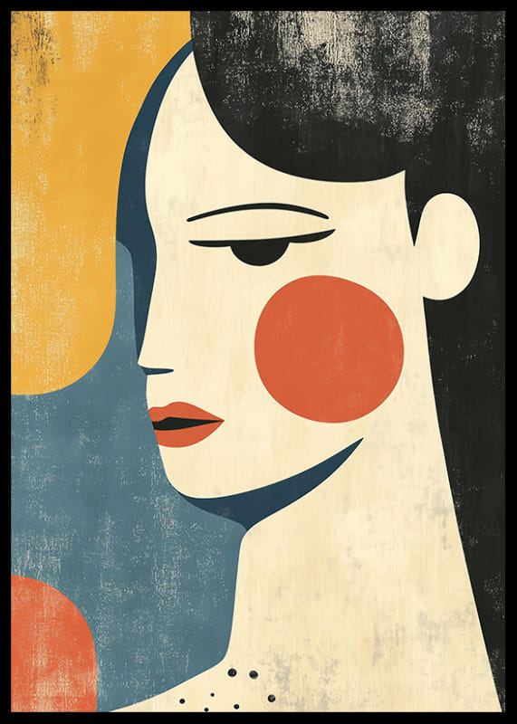 Denna poster utstrålar en tidlös elegans med sina rena linjer och dämpade färger. Illustrationens stiliserade ansikte förmedlar en känsla av både enkelhet och konstnärlig komplexitet.