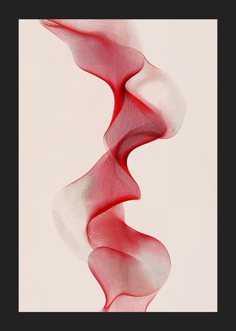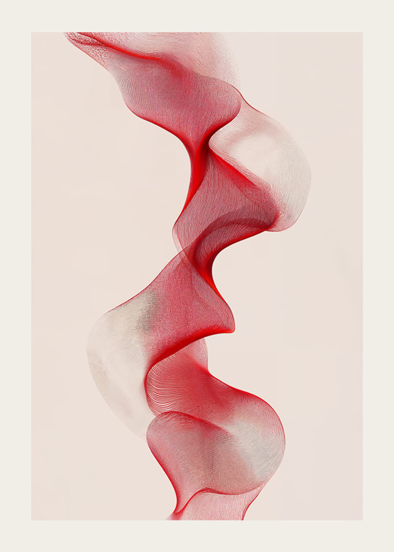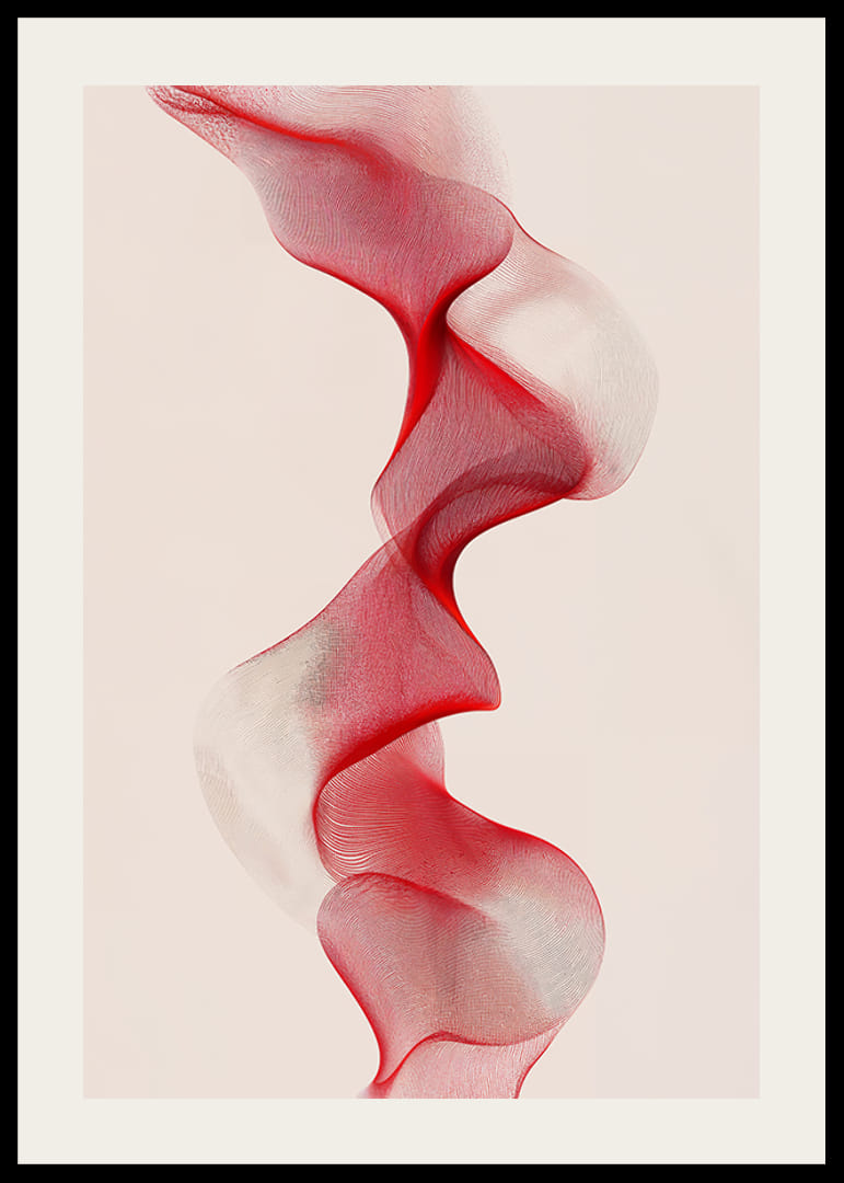 Denna poster fångar ögat med sina subtila rörelser och mjuka färgövergångar från rött till vitt. Linjernas eleganta kurvor ger en illusion av rörelse och flöde, vilket skapar en känsla av lugn och balans.