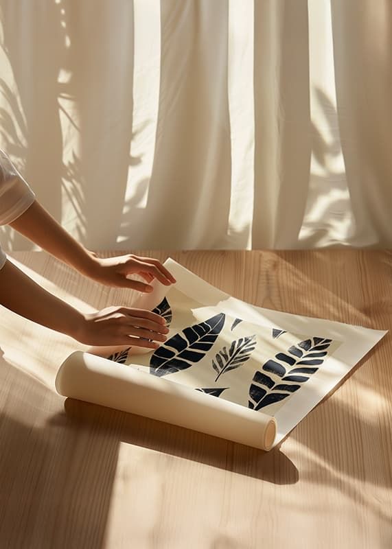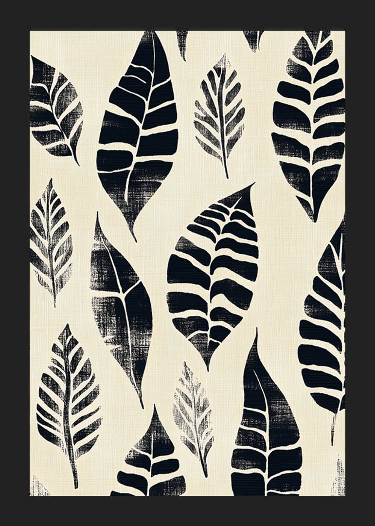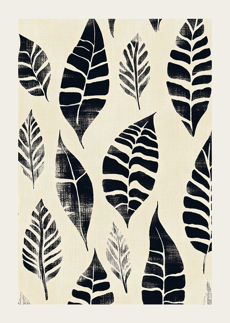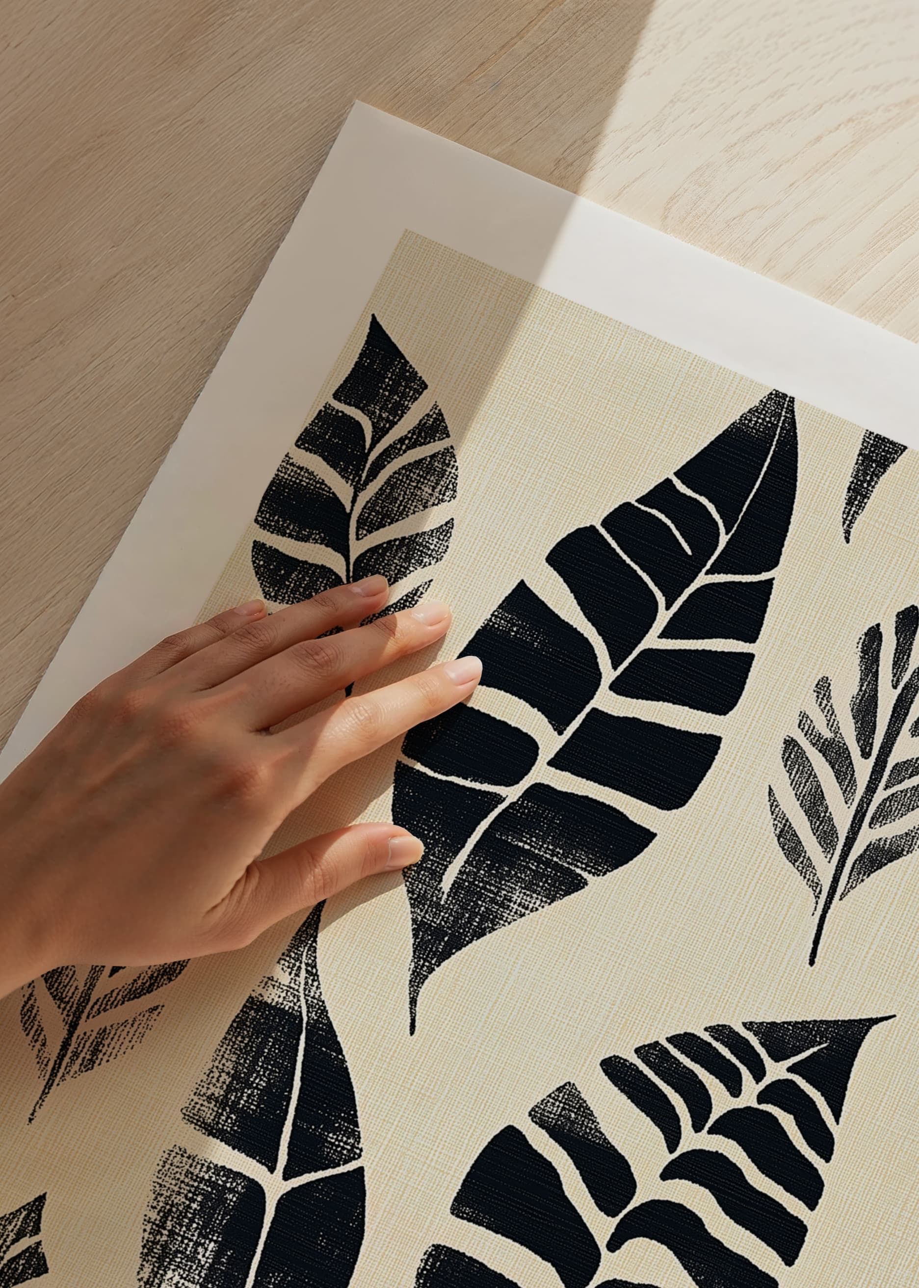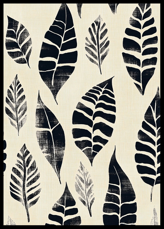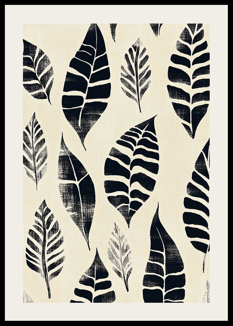 Förälska dig i denna poster där svarta bladmönster mot en krämfärgad bakgrund skapar en känsla av lugn och stil. Det enkla, men uttrycksfulla mönstret förmedlar en tidlös skönhet som drar in naturens elegans i ditt hem.