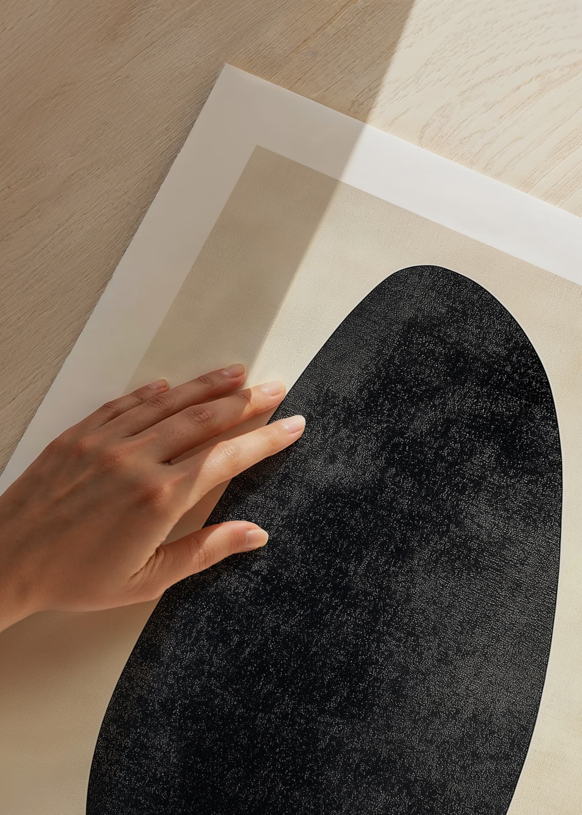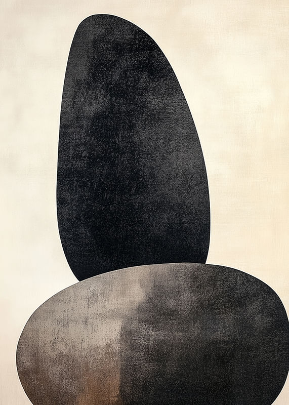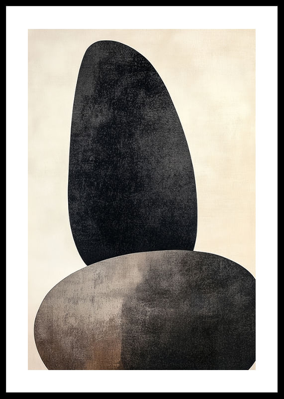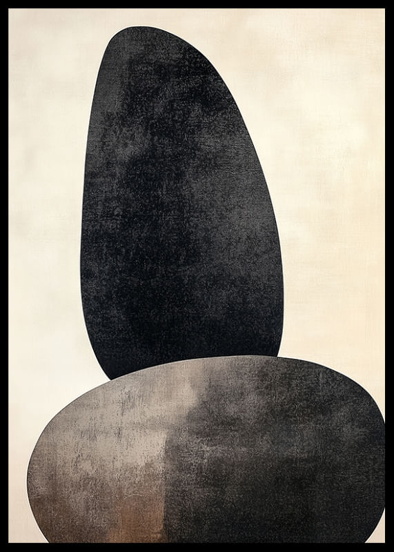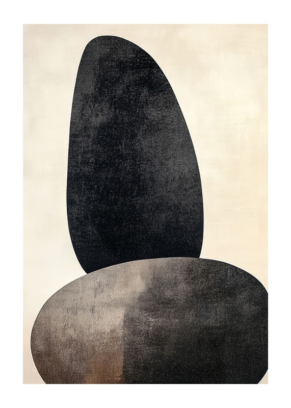 Denna poster fångar omedelbart ögat med sina eleganta, mörka former mot en mjuk bakgrund. De abstrakta, strömlinjeformade konturerna skapar en känsla av balans och stillhet, vilket gör att dess övergripande enkelhet förstärker dess visuella djup.