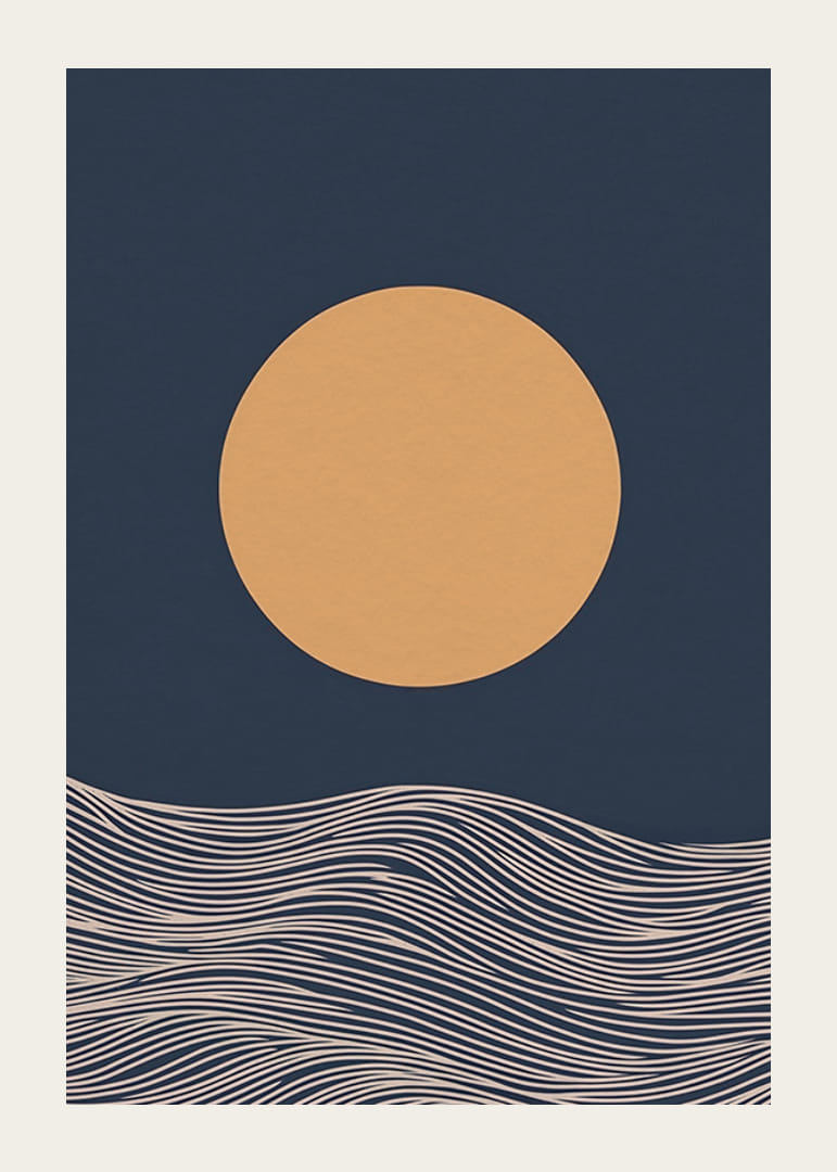 Denna poster fångar en gyllene sol som lugnt svävar över elegant böljande linjer som liknar havet. Den dämpade färgpaletten i blått och guld skapar en känsla av tidlös ro.