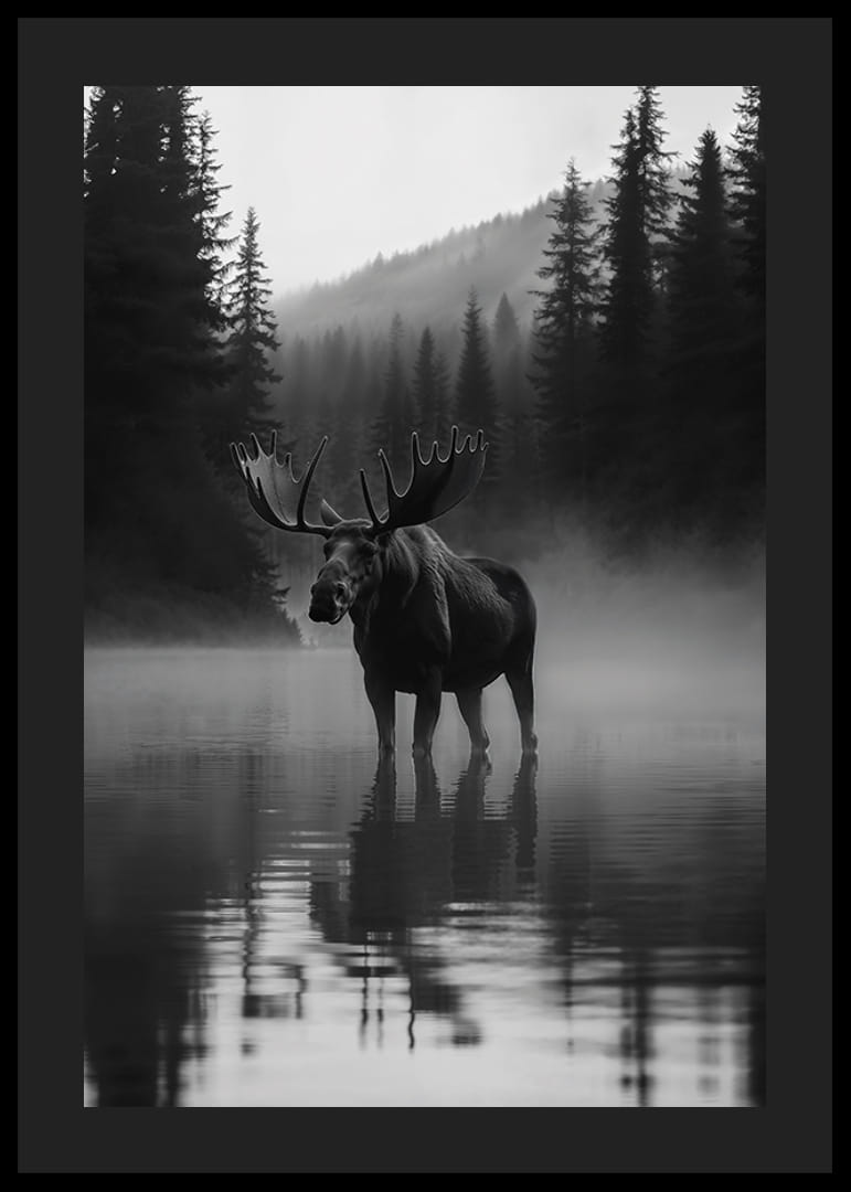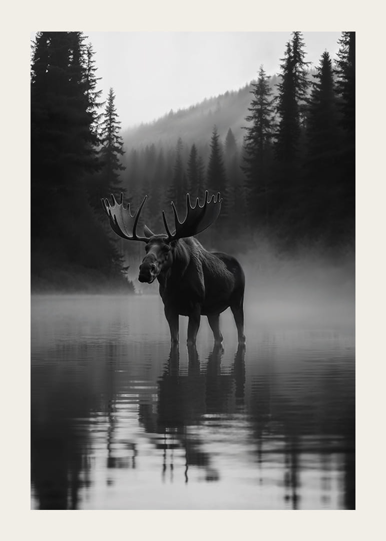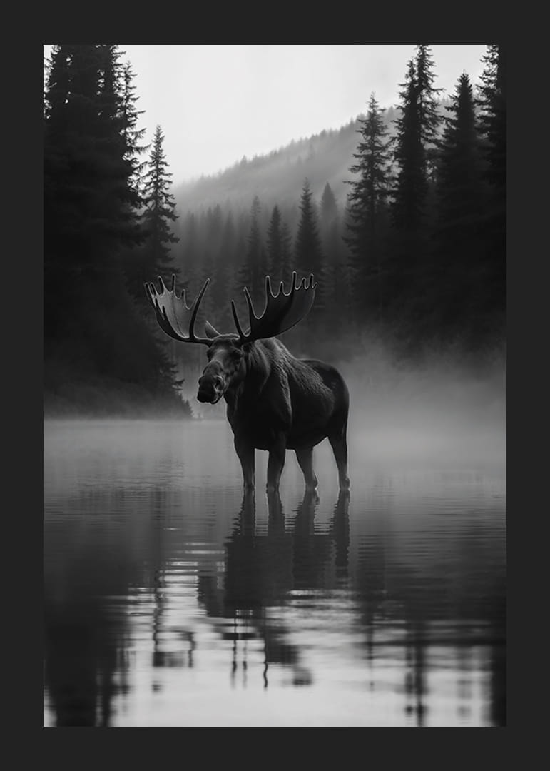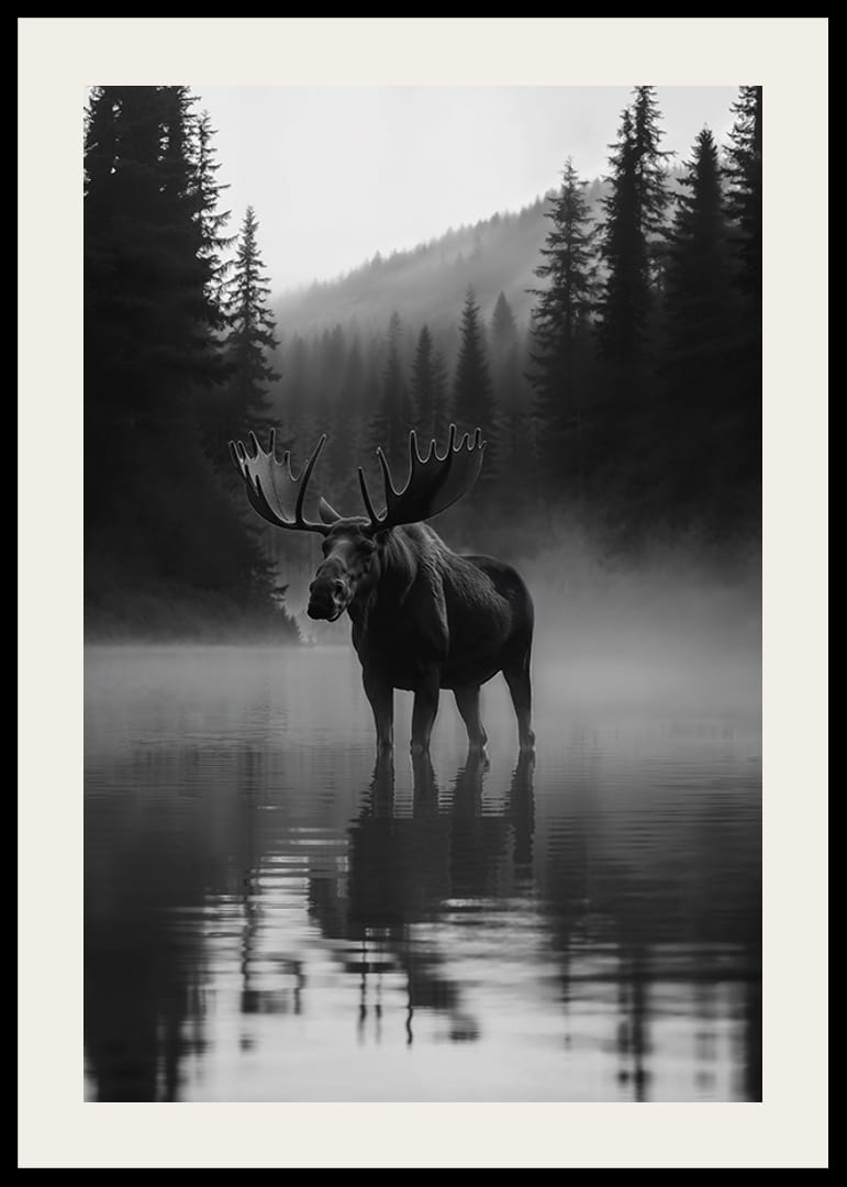 Utforska elegansen i denna poster med en älg stående vid en dimmig skogssjö. Den majestätiska älgen, omgiven av täta träd och mystisk dimma, förmedlar en känsla av ro och storhet. Skogens tysta vakt speglas i det stilla vattnet, vilket ger en drömlik atmosfär.