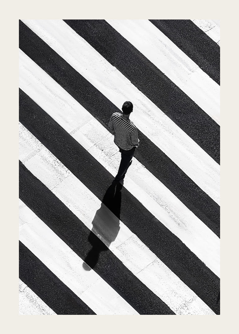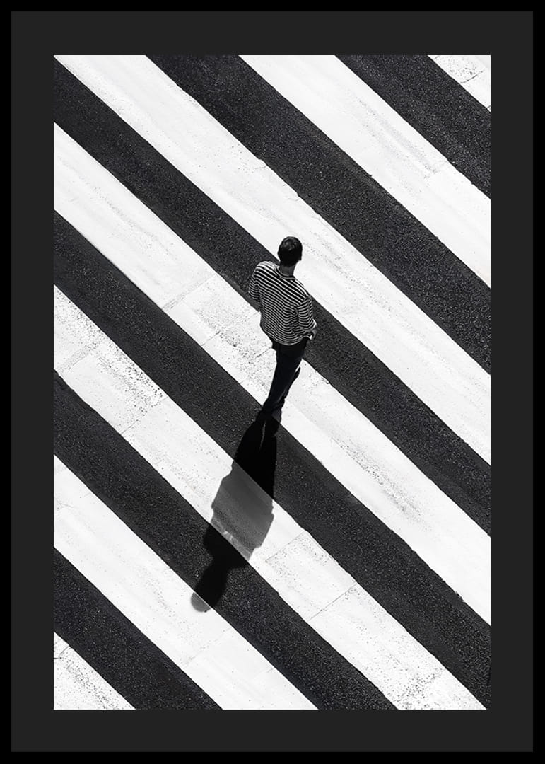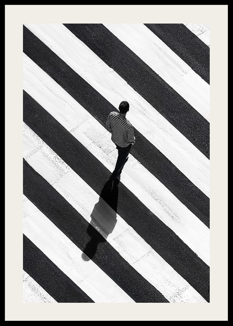 Denna poster fångar en ensam man som promenerar över ett dramatiskt randigt övergångsställe. Det svartvita kontrastspelet mellan mannen och de breda ränderna skapar en känsla av ensamhet och reflektion.