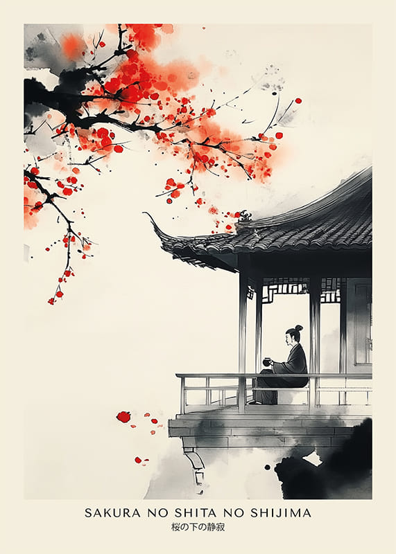 Den här postern fångar essensen av lugn och stillhet under de blommande körsbärsgrenarna. En ensam figur sitter i en traditionell paviljong, omgiven av de mjuka, röda blommorna som svävar mot en vit bakgrund. Den enkla elegansen i bilden skapar en känsla av tidlöshet och frid.