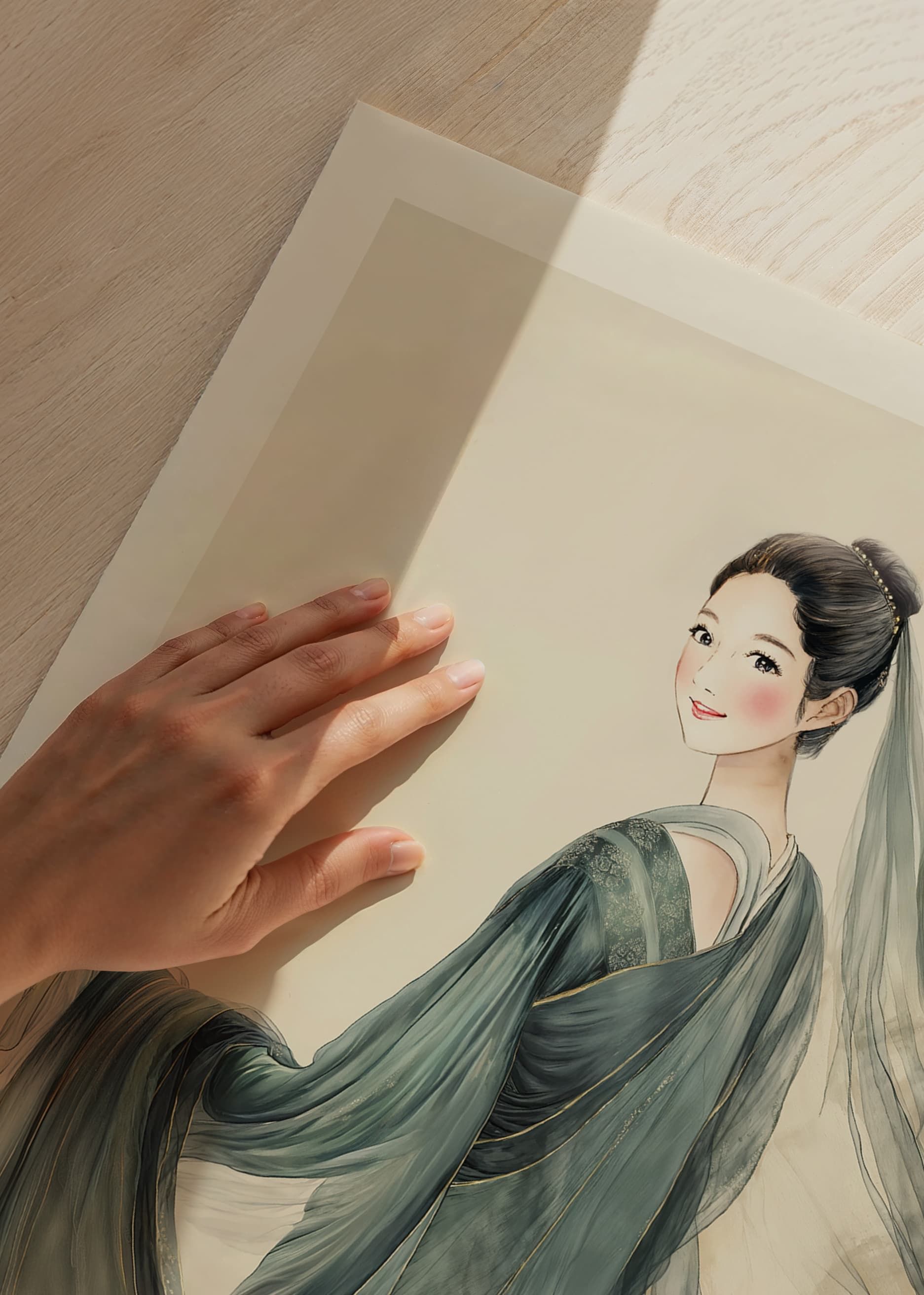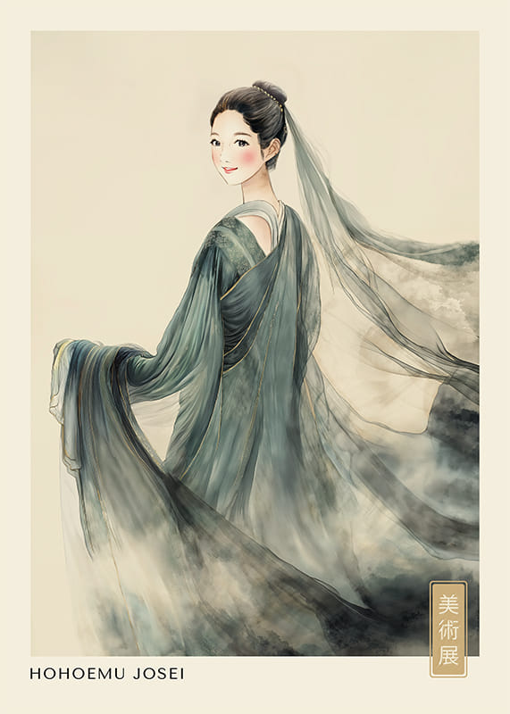 Denna poster utstrålar en känsla av eterisk skönhet med en kvinna klädd i en traditionell dräkt. De flytande tygerna och mjuka färgtonerna skapar en känsla av tidlös elegans. Kvinnans milda blick och vackra hållning ger en fridfull och drömlik atmosfär.