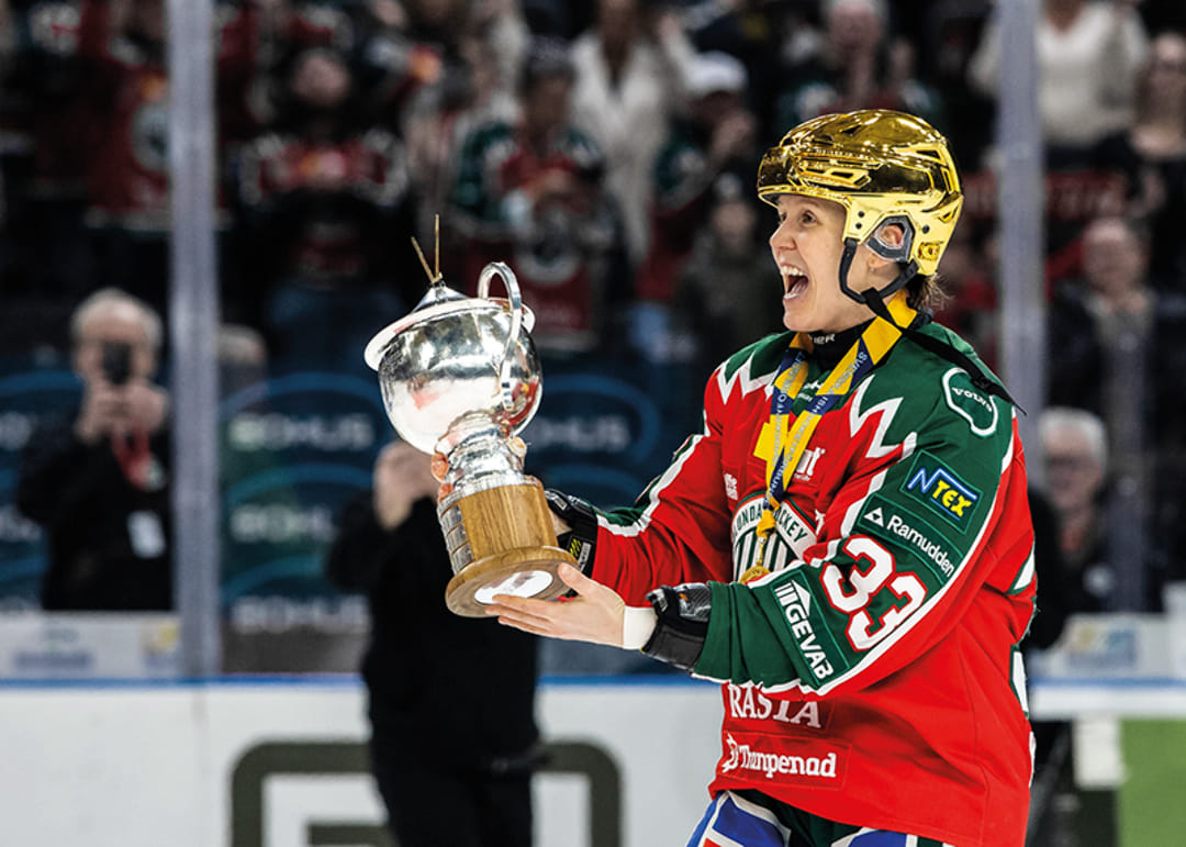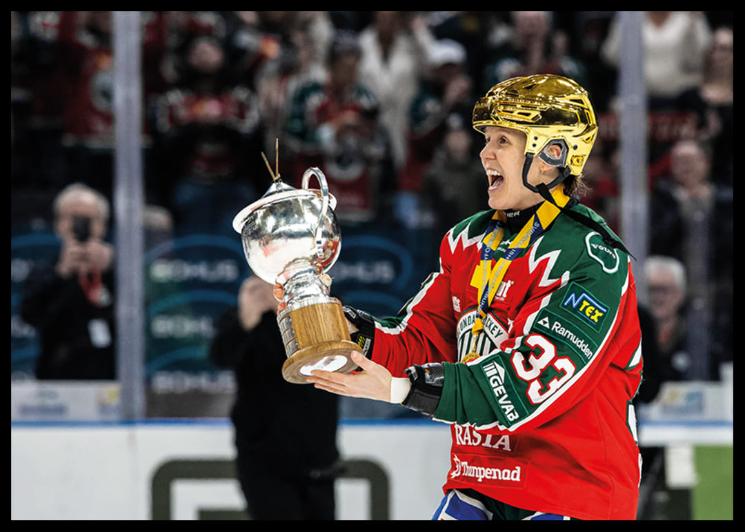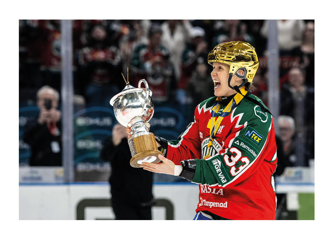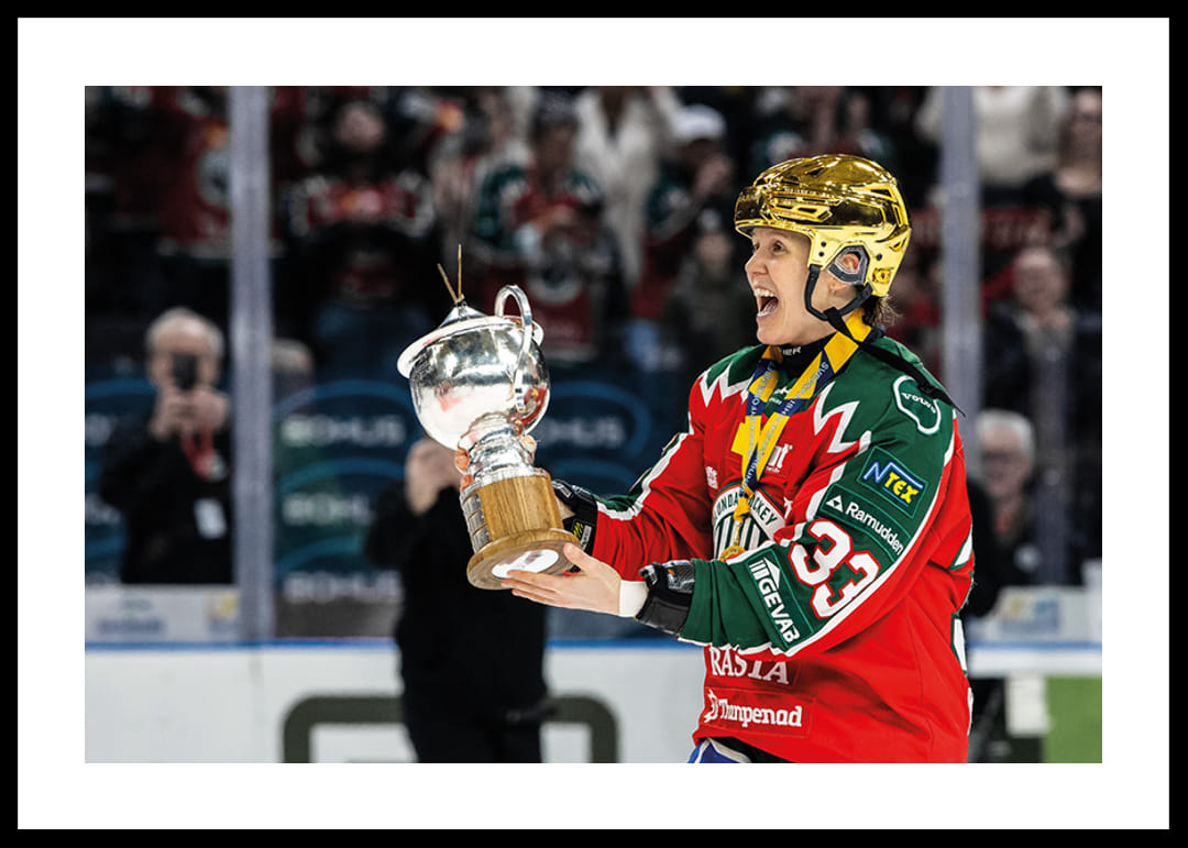 Stilren poster från kategorin Frölunda HC med motiv Frölunda HC SDHL Michelle Karvinen Lyfter Pokalen