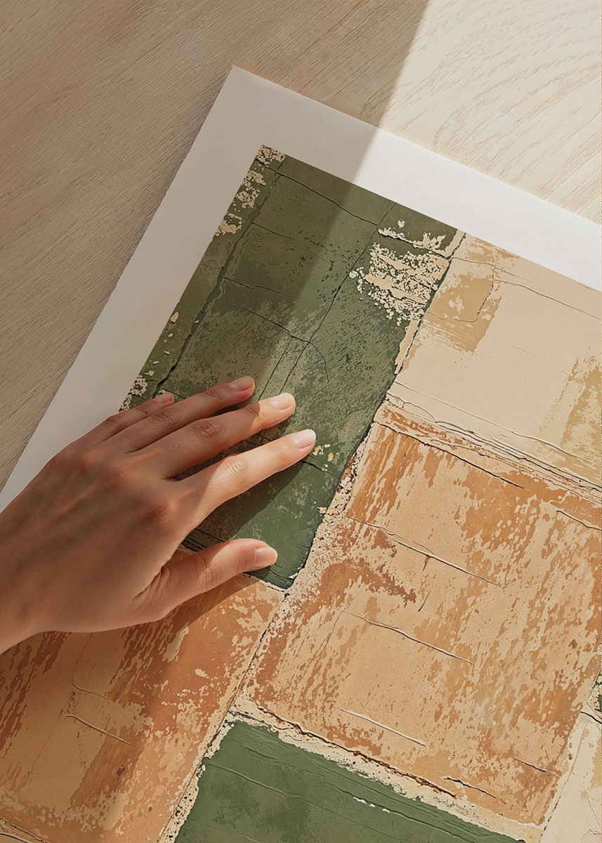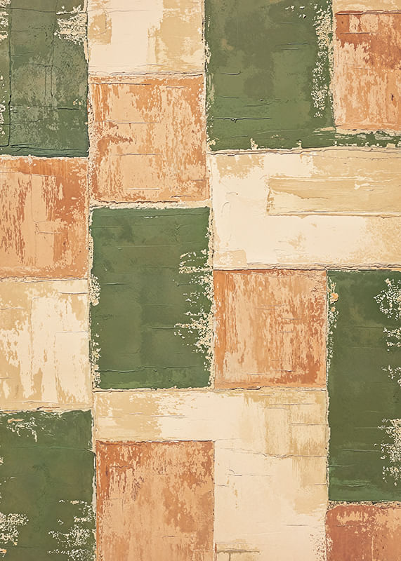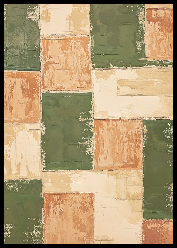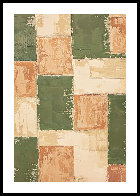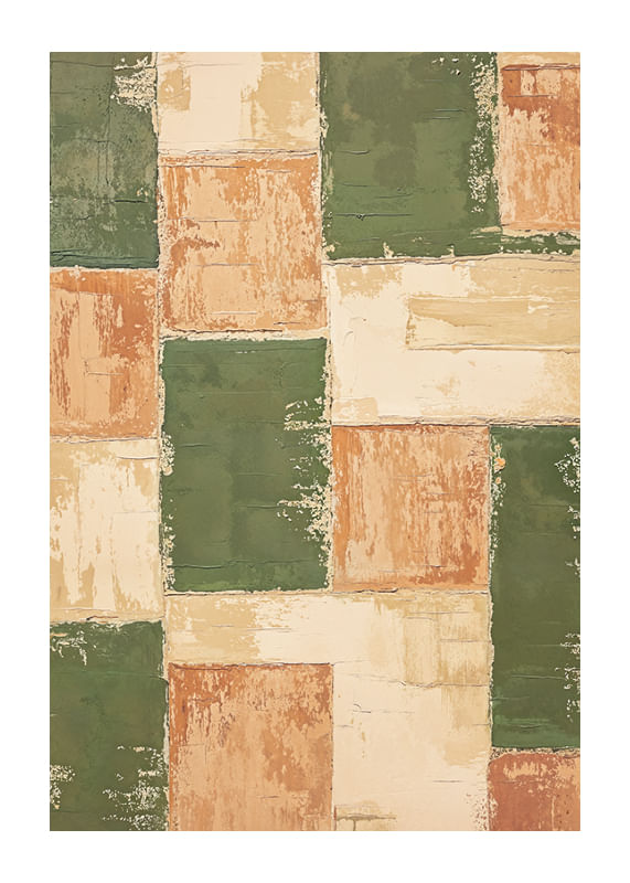 Denna poster fångar ögat med sina harmoniskt sammansatta block i gröna och terracotta-toner. Dess rustika struktur och jordnära färgpalett förmedlar värme och hemtrevnad. Perfekt för att ge liv åt ett vardagsrum eller kontor.