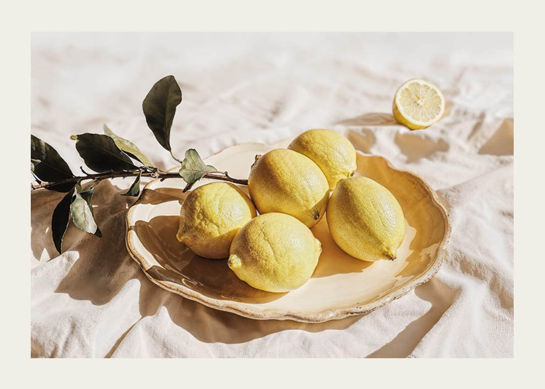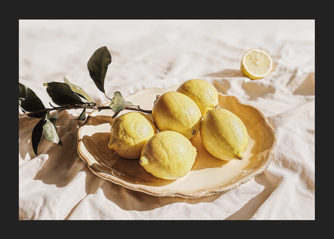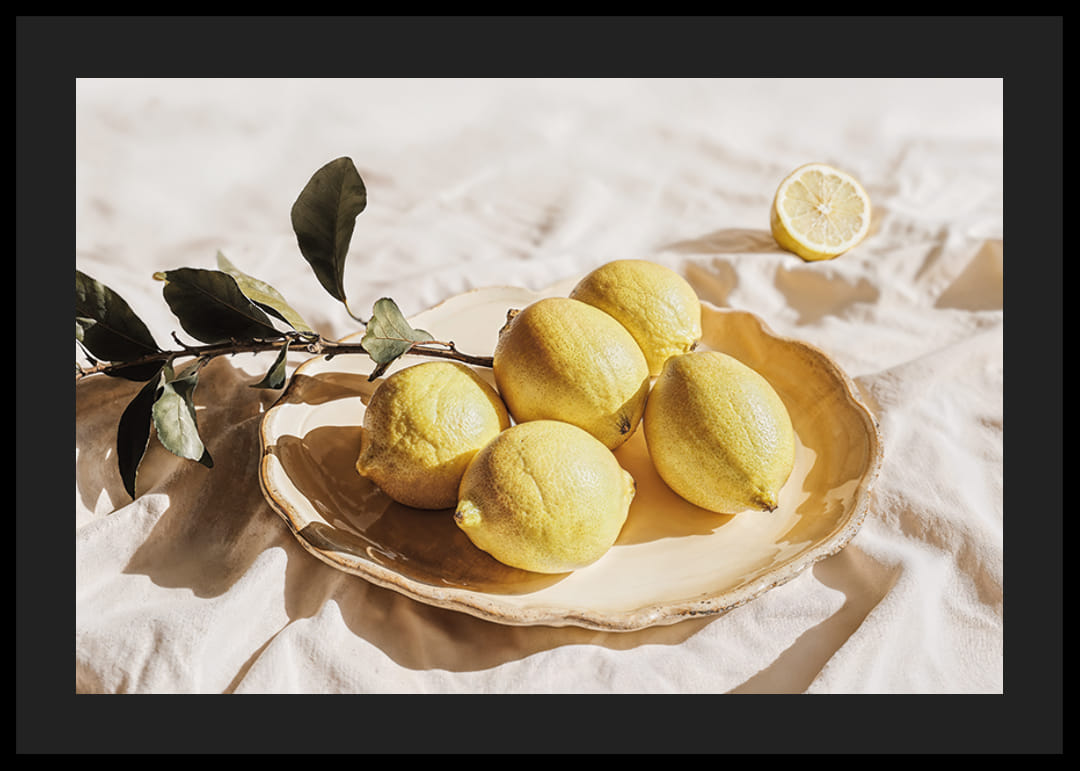Denna poster utstrålar energi med sina ljusa citroner som vilar på ett vackert fat, vilket ger en känsla av soliga dagar och fräschör. De gyllene tonerna i kombination med det mjuka ljuset skapar en harmonisk atmosfär som lockar till lugn och inspiration.