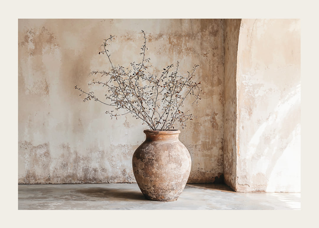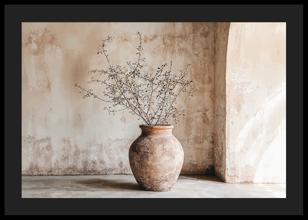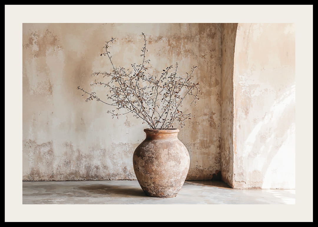 Denna poster fångar en känsla av tidlöshet genom en rustik kruka fylld med sköra kvistar, mot en bakgrund av en mjukt patinerad vägg. Milda jordtoner skapar en lugn atmosfär som framhäver rummets naturliga skönhet.