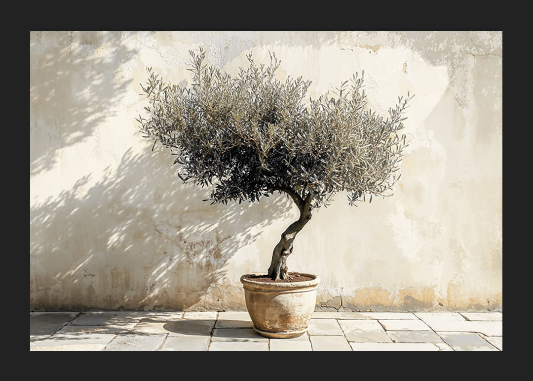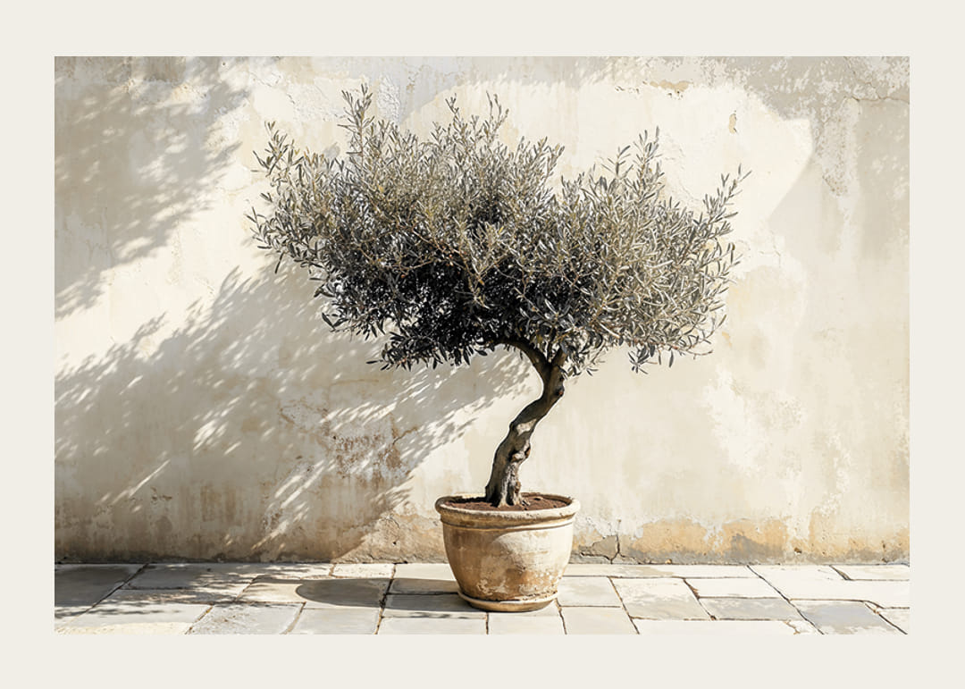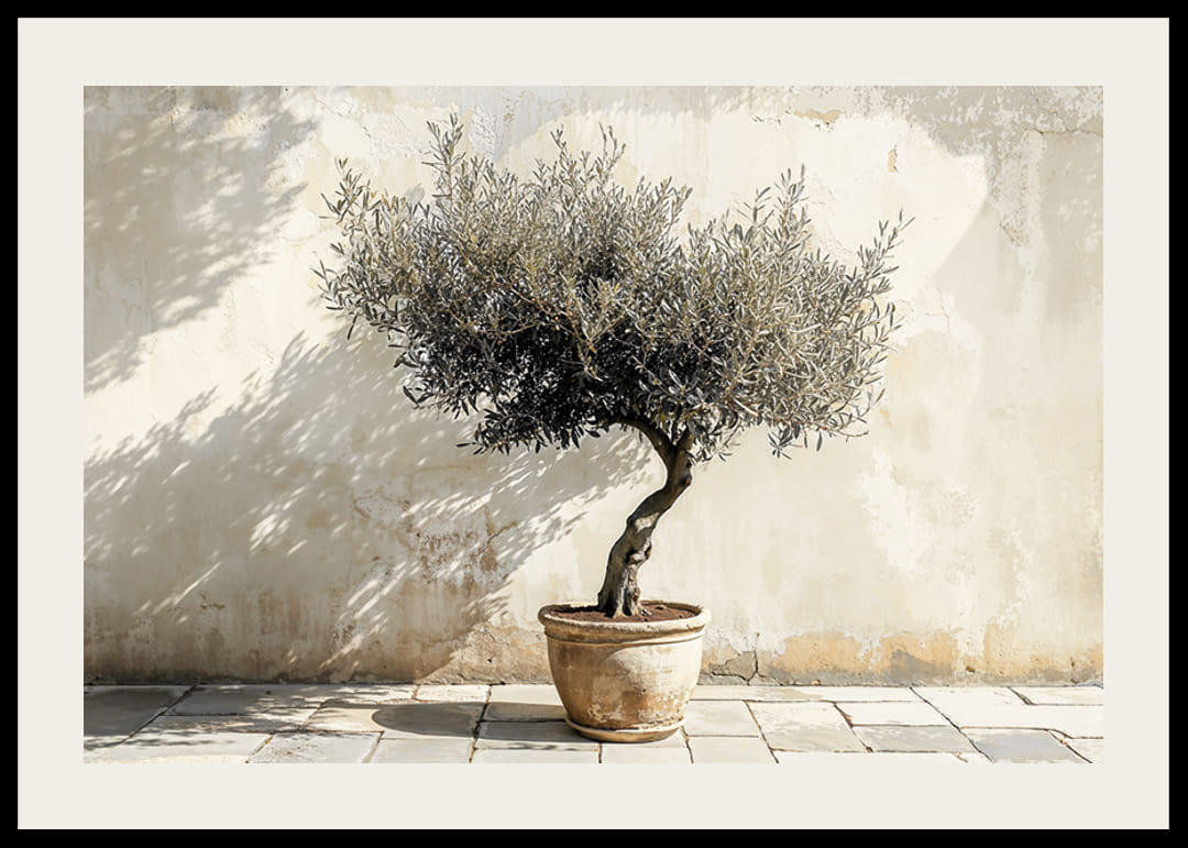 Denna poster fångar ett enkelt men elegant olivträd i en klassisk lerkruka, som sträcker sig mot en varm, väderbiten vägg. Det naturliga ljuset spelar med de silvergröna löven och skapar en lugn, medelhavsk atmosfär.