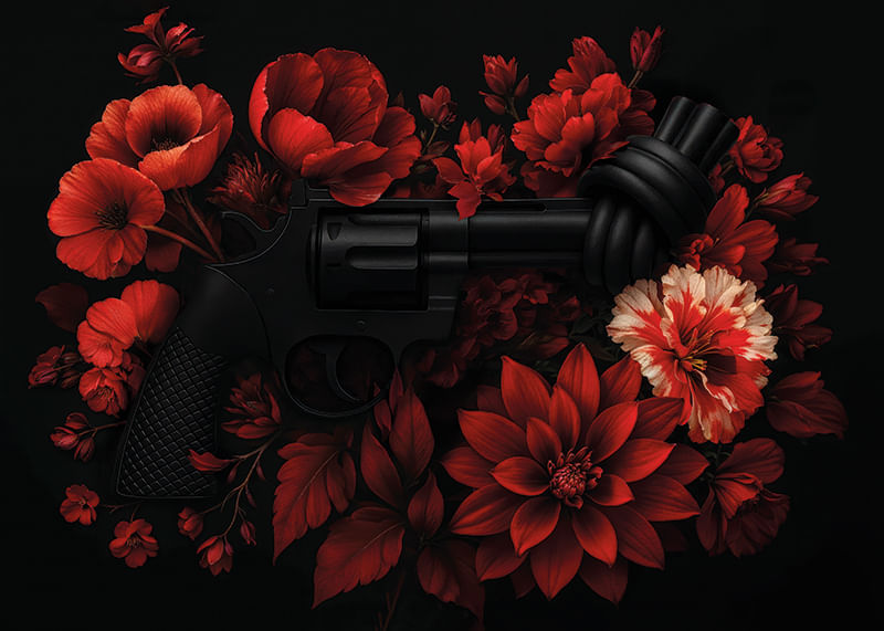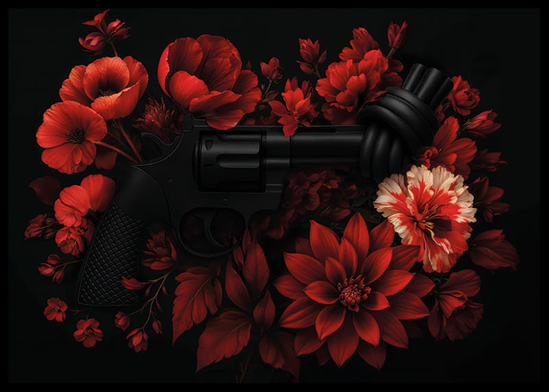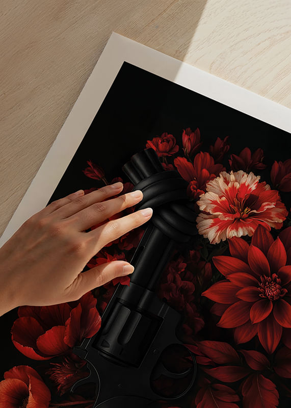 Där mörker möter motstånd blommar något större. Den ikoniska knutna revolvern – symbol för icke-våld – ligger inbäddad i ett dramatiskt stilleben av röda blommor mot en nattsvart bakgrund. En visuell kontrast mellan styrka och skörhet. Non-Violence In Bloom är en hyllning till den tysta kraften i empati och förändring. Ett konstverk som väcker känslor, bjuder in till samtal – och gör skillnad. Denna poster är en del av kollektionen "Non-Violence Collection" där varje köp stödjer The Non-Violence Projects viktiga arbetet med att förebygga våld.