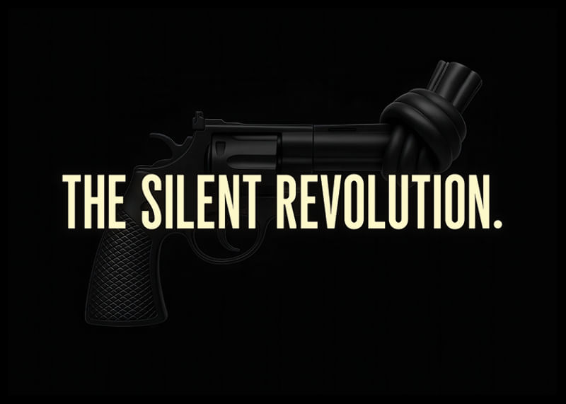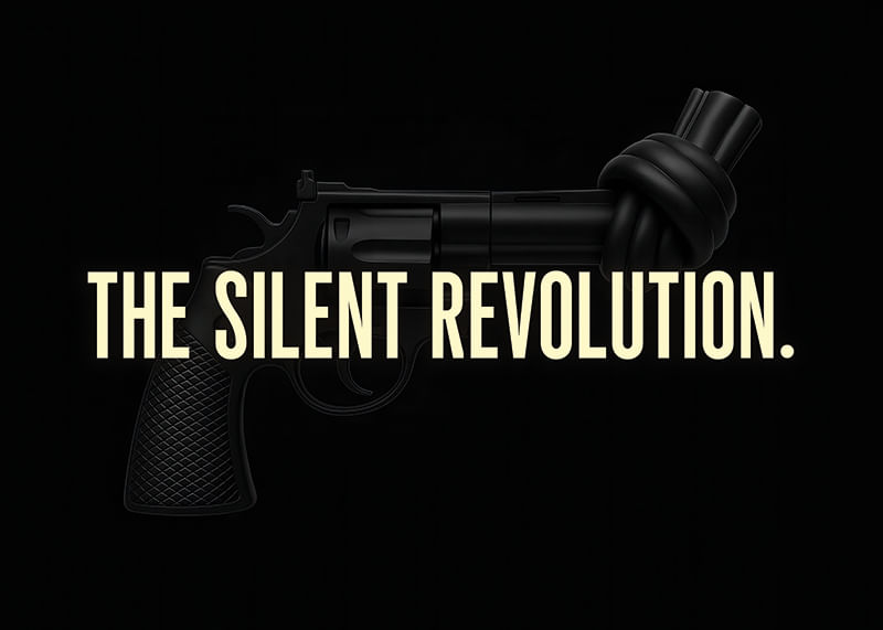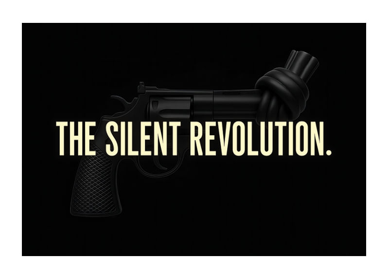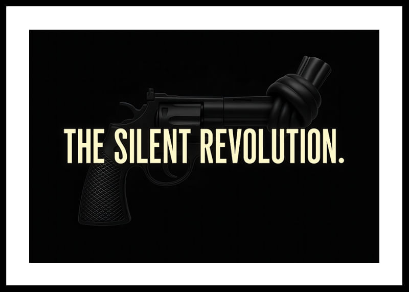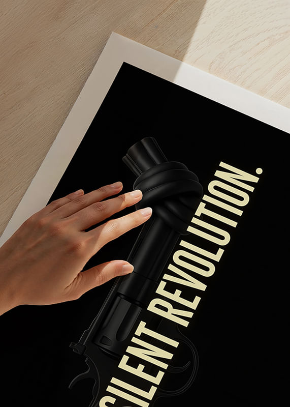 Ett grafiskt konstverk i avskalad perfektion. Den ikoniska knutna revolvern – symbolen för icke-våld – möter ett kolsvart rum där budskapet får tala: The Silent Revolution. En tyst men obeveklig uppmaning till positiv förändring utan våld. Minimalism med maximal betydelse. Denna poster är en del av kollektionen "Non-Violence Collection" där varje köp stödjer The Non-Violence Projects viktiga arbetet med att förebygga våld.