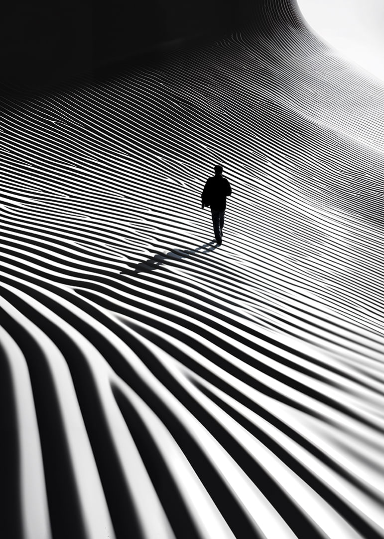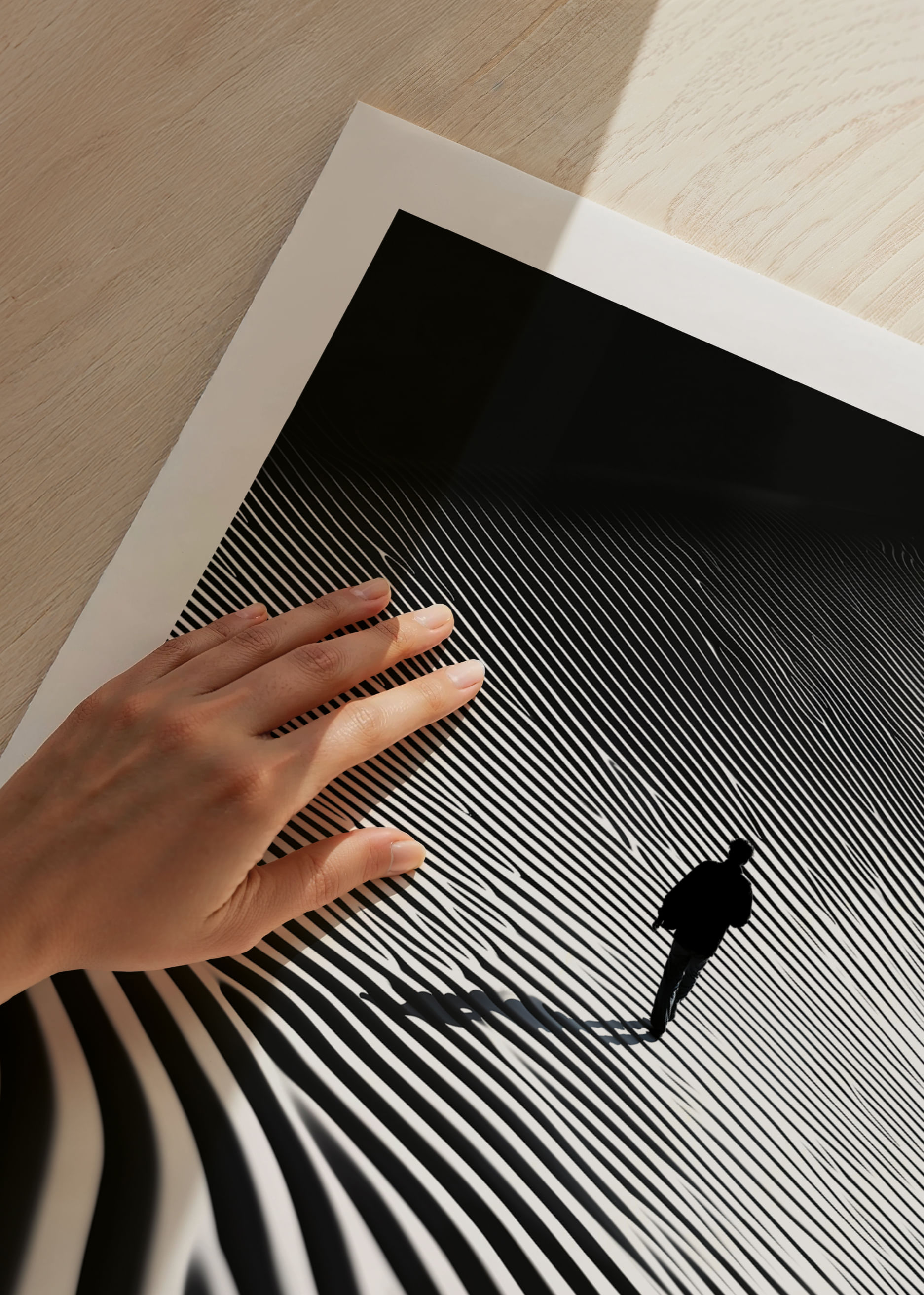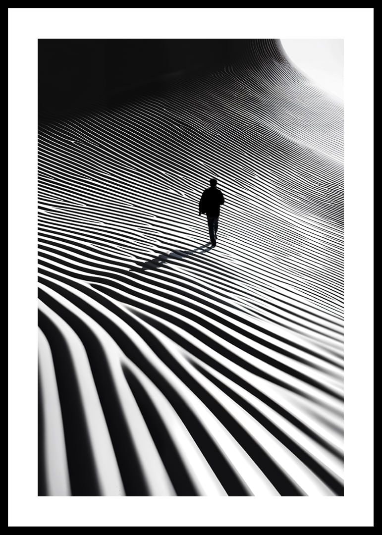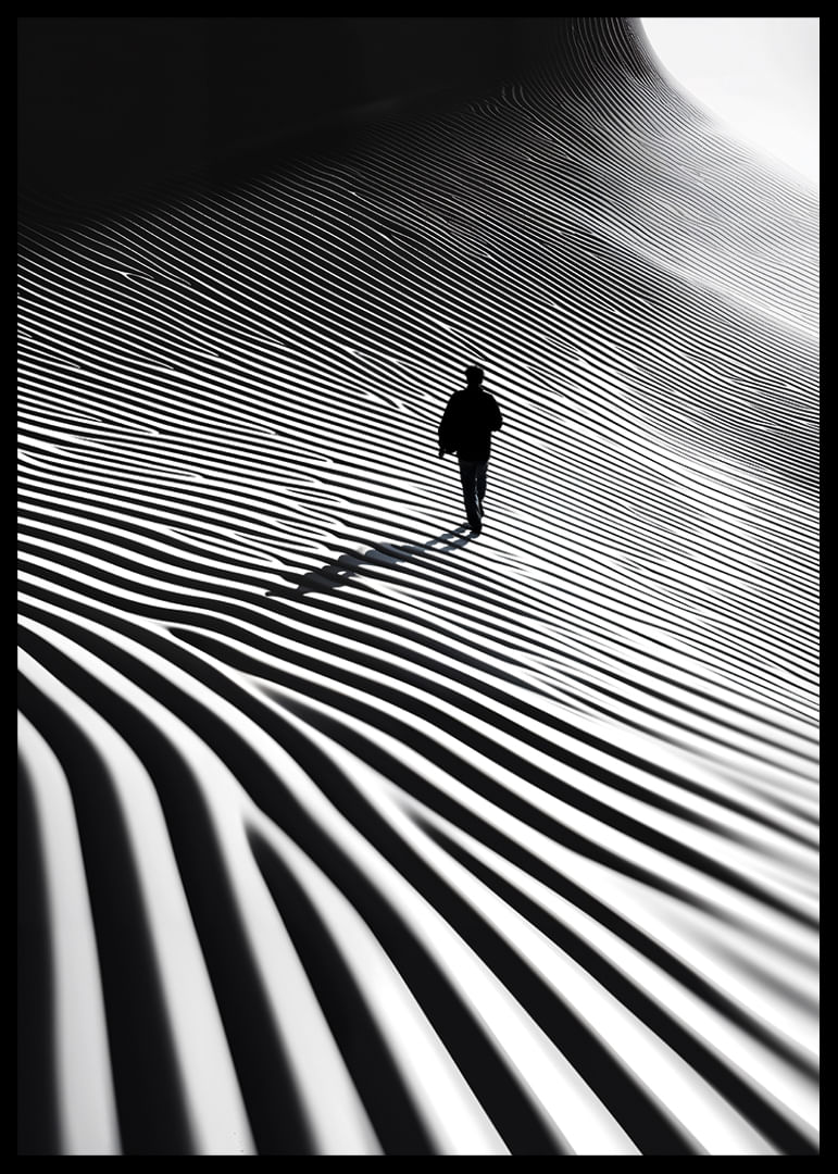 En ensam figur vandrar genom ett surrealistiskt landskap av ljus och skugga. De vågformade linjerna skapar en hypnotisk rörelse som fångar blicken och väcker nyfikenhet. En poster som utstrålar mystik, minimalism och modern elegans – perfekt för dig som vill ha ett djärvt, tankeväckande konstverk på väggen.