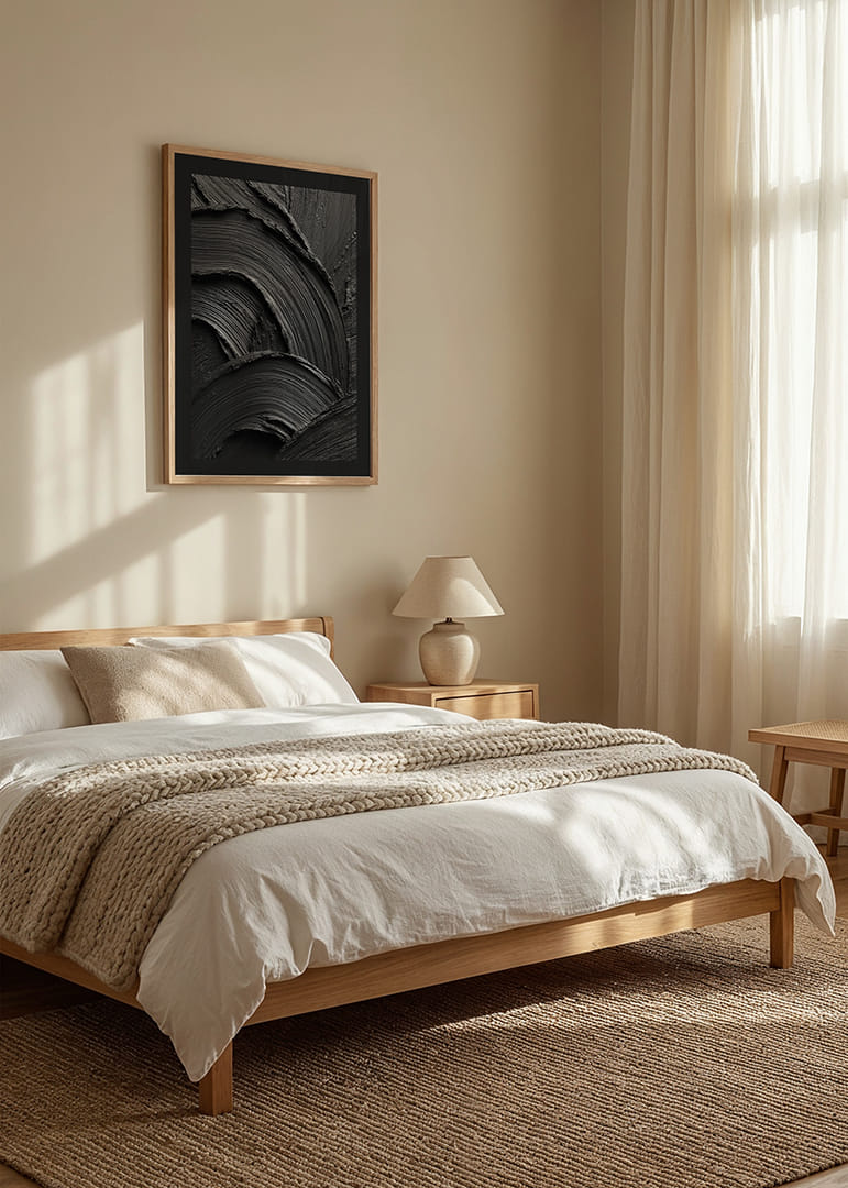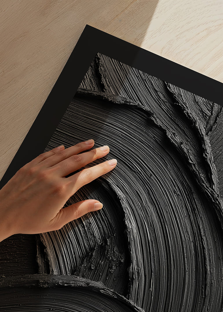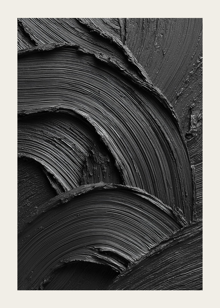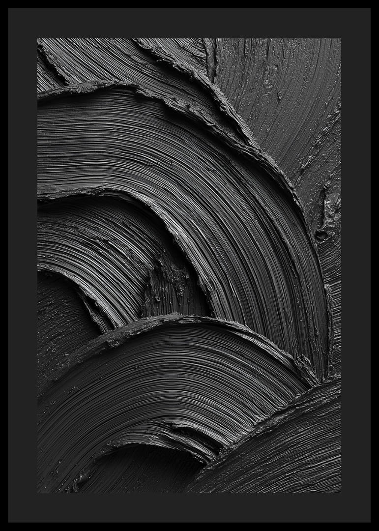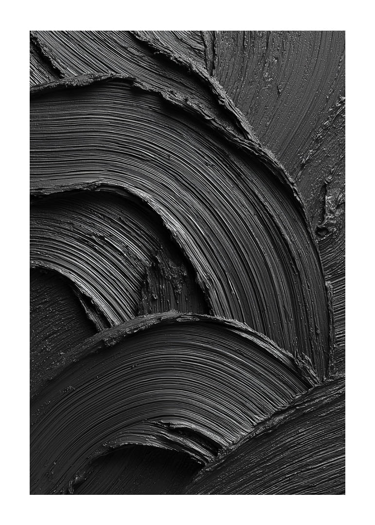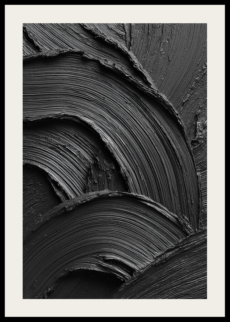 En kraftfull och minimalistisk poster i djupt svart, där penseldragens struktur skapar ett dramatiskt spel av ljus, skuggor och rörelse. Den taktila känslan och de mjuka, vågformade linjerna ger en unik kombination av elegans och intensitet. Ett konstverk som fångar blicken och tillför rummet en modern, stilren och sofistikerad atmosfär.