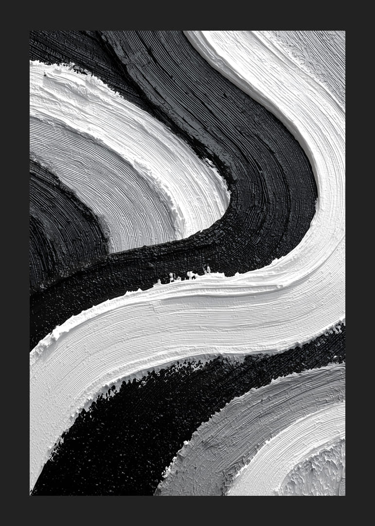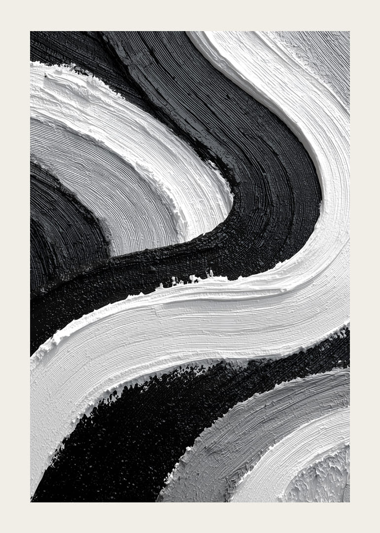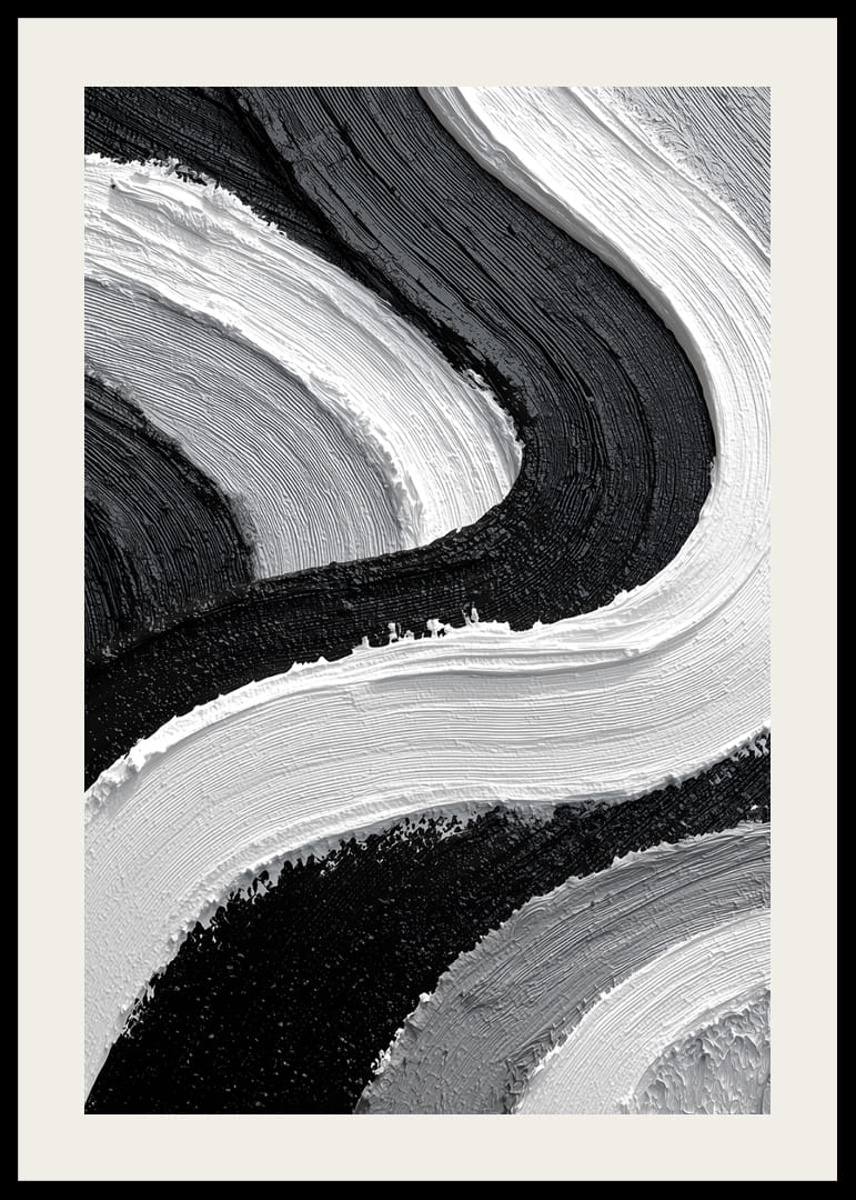 Denna poster fångar ögat med sina dramatiska svartvita strömningar som slingrar sig över ytan. De kontrasterande färgerna skapar en smidig rytm som för tankarna till havets harmoniska rörelse. Varje penseldrag bjuder in till att utforska djupet och variationen i dess textur. Med sin stilrena estetik lyfter postern inredningen och ger rummet en modern och sofistikerad känsla.