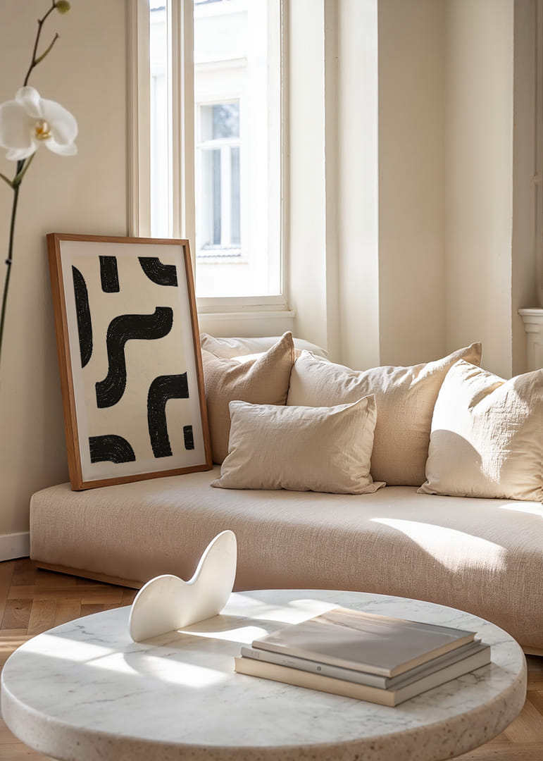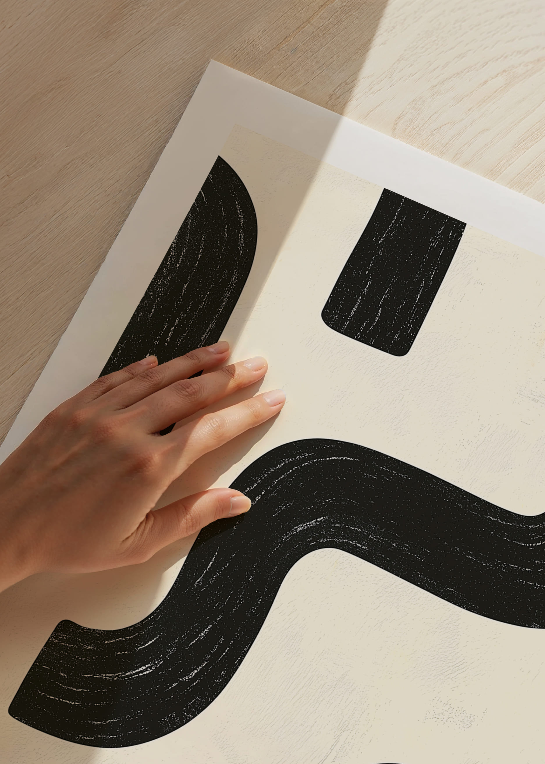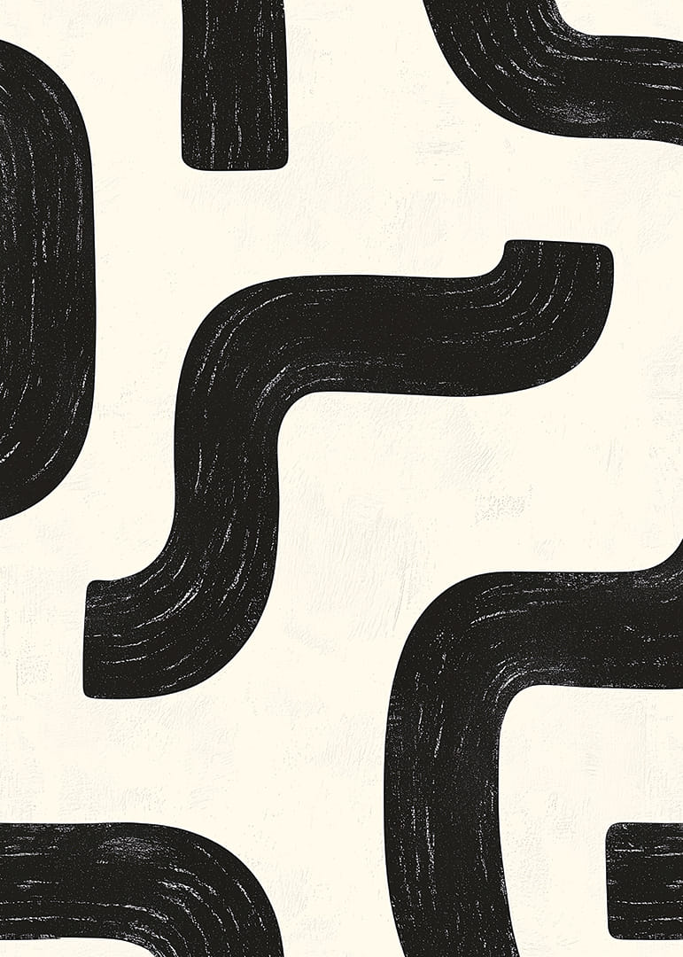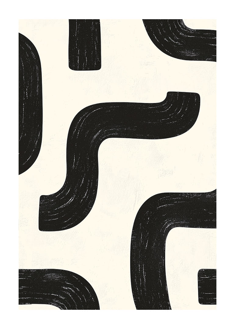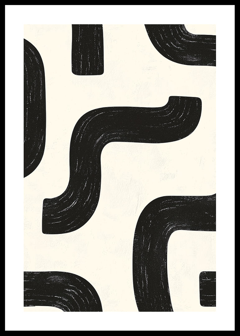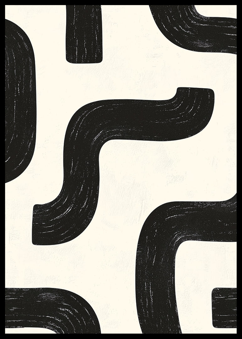 I denna poster möts svartvita kurvor i en elegant, rytmisk dans som fångar ögat. Den abstrakta designen med sina mjuka linjer och kontrasterande toner skapar en visuell harmoni som fascinerar. Det enkla men uttrycksfulla mönstret fördjupar atmosfären och kan anpassa sig till olika inredningsstilar. Denna poster är perfekt för dem som söker att ge sitt hem en modern och sofistikerad touch.
