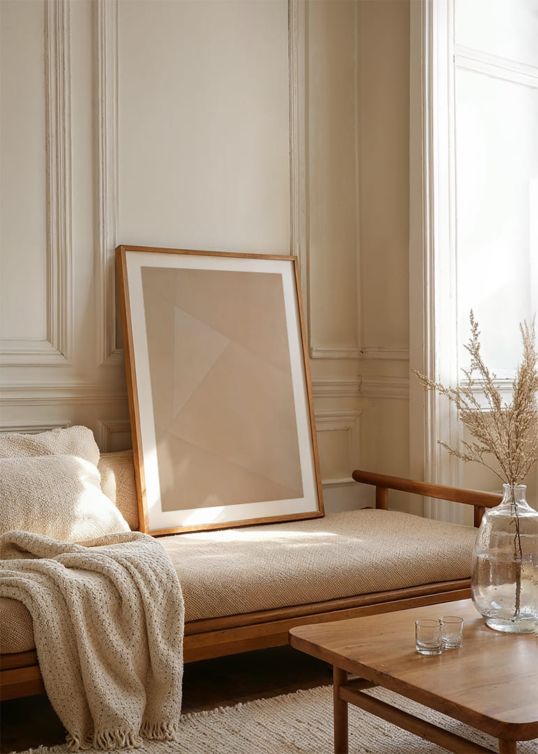 Denna poster fångar omedelbart med sina mjuka geometriska former och subtila linjer i dämpade pastelltoner. Den utstrålar en harmonisk känsla av enkelhet och lugn, där varje linje och nyans är noggrant balanserad. En perfekt poster för att ge en elegant och stillsam atmosfär åt vilket rum som helst, och dess stillsamma skönhet bjuder in till eftertanke och avkoppling.