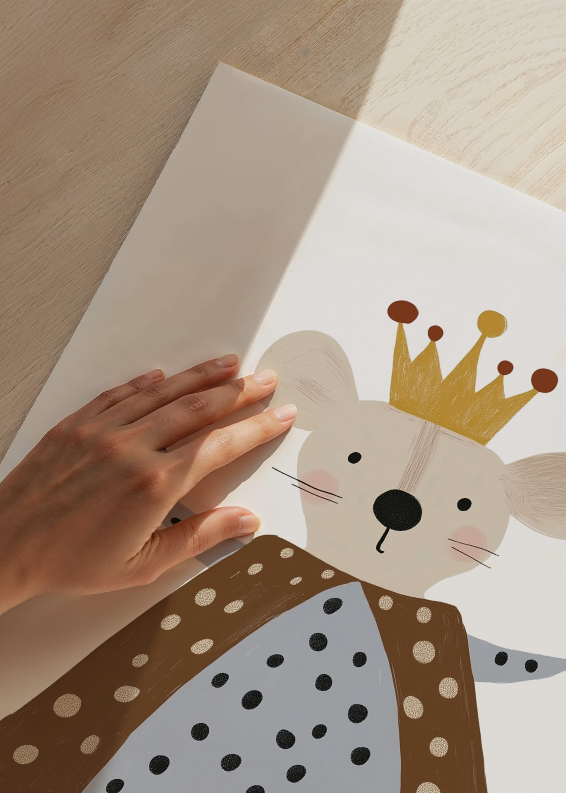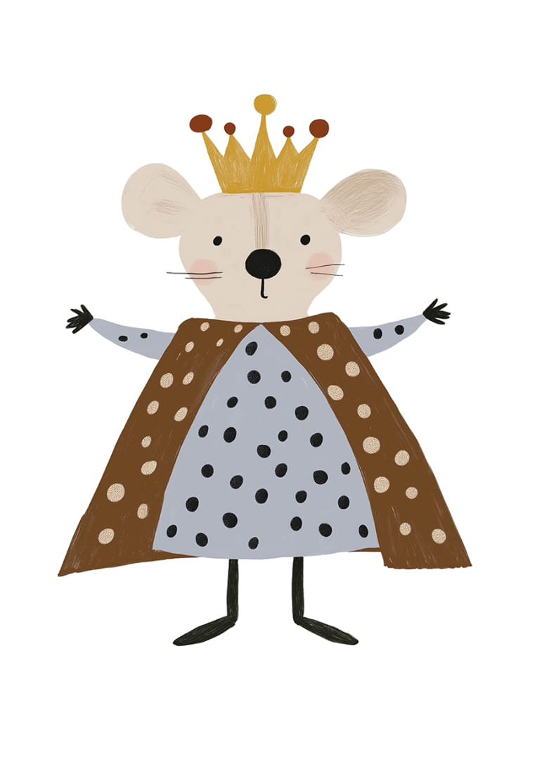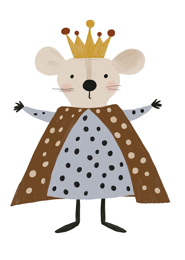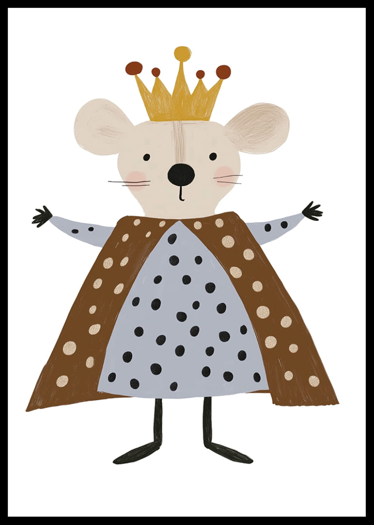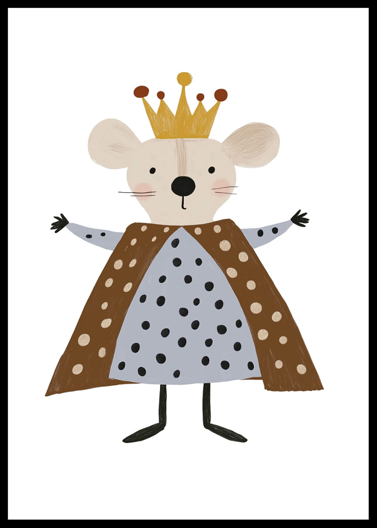 Denna poster utstrålar charm med en bedårande mus klädd i kungakrona och prickig mantel. Musens glada uttryck och färgglada detaljer skapar en lekfull atmosfär. Perfekt för barnens rum, ger denna poster en känsla av magi och äventyr. Den fångar barnens fantasi och tillför ett charmigt och kungligt inslag till hemmets inredning.