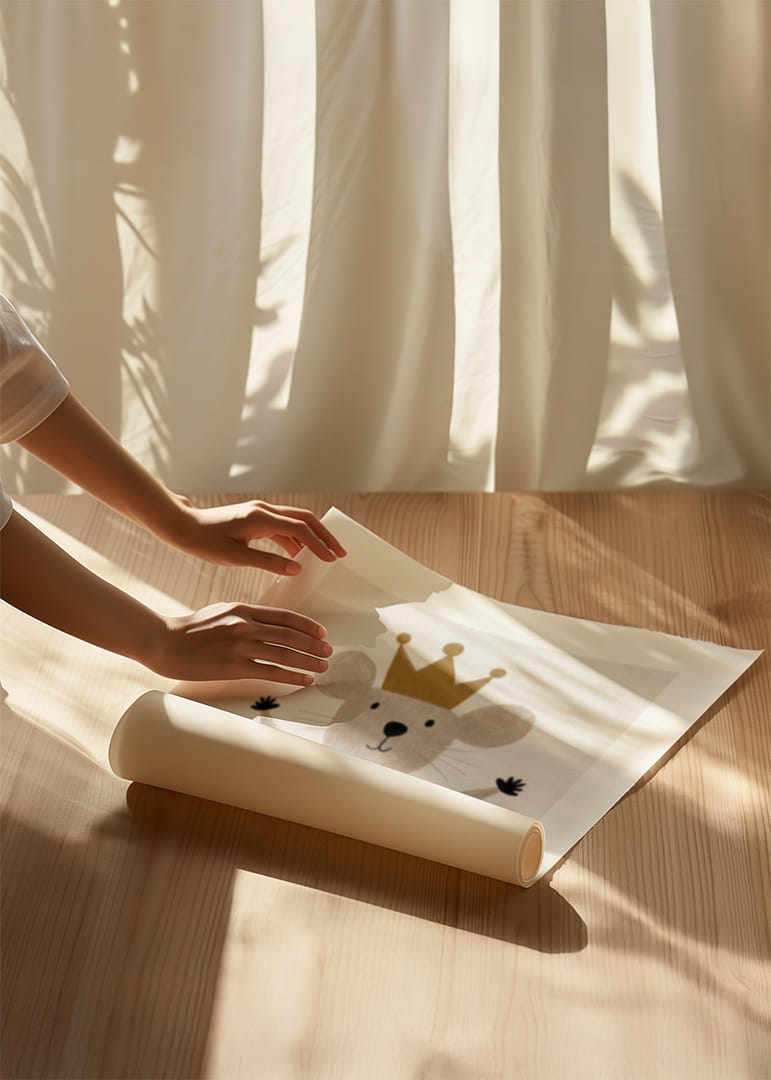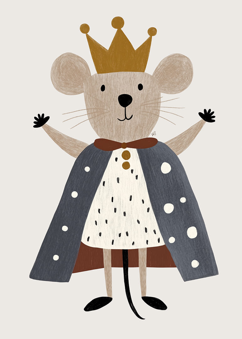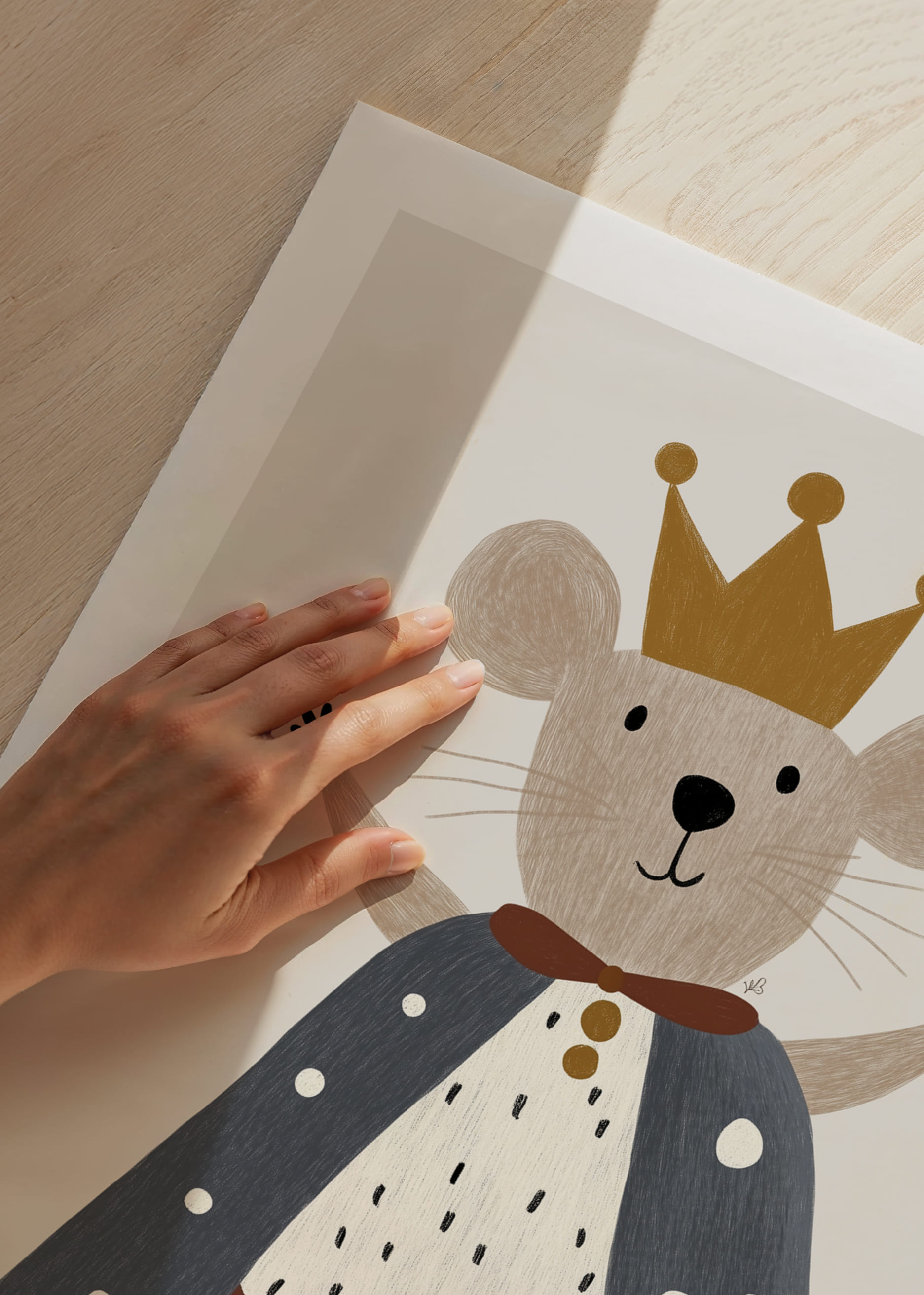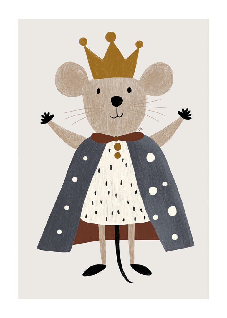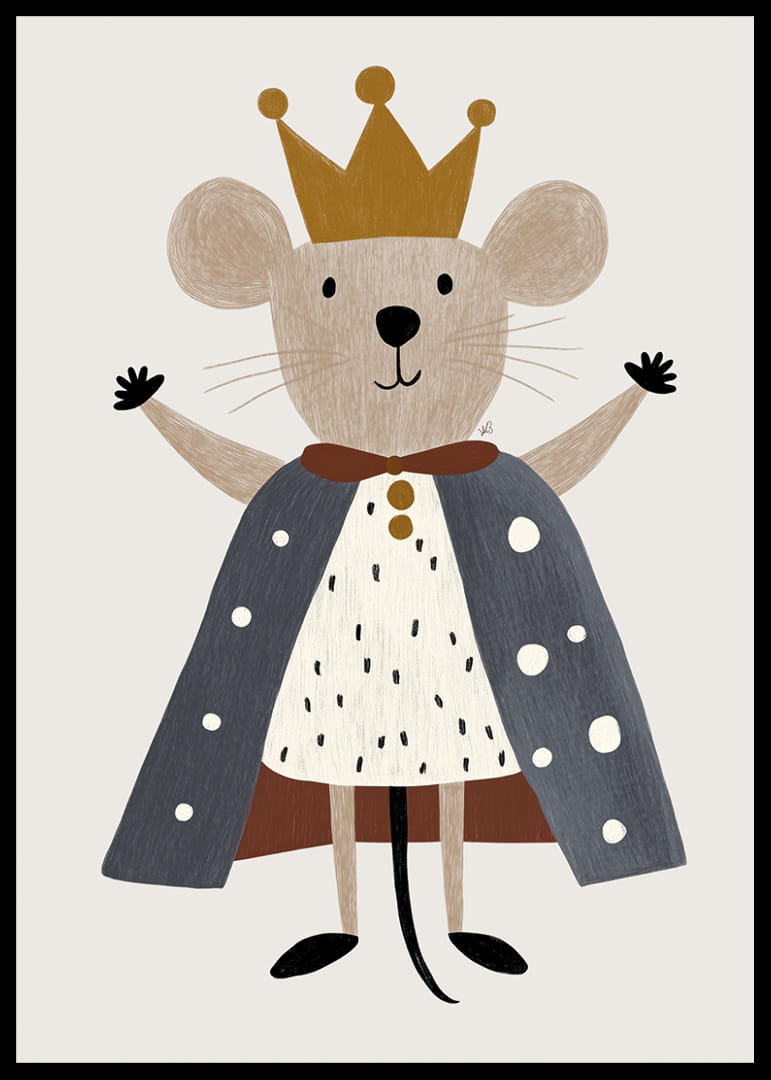 Denna poster framställer en söt mus iklädd krona och kunglig mantel, vilket omedelbart fångar ögat och hjärtat. Med sina små, glada ögon och charmiga uttryck ger detta konstverk ett lekfullt och ändå majestätiskt intryck. Perfekt för barnrummet, förvandlar denna poster varje rum till ett fantasifullt rike där glädje och fantasi får blomstra. En fröjd för både unga och gamla.