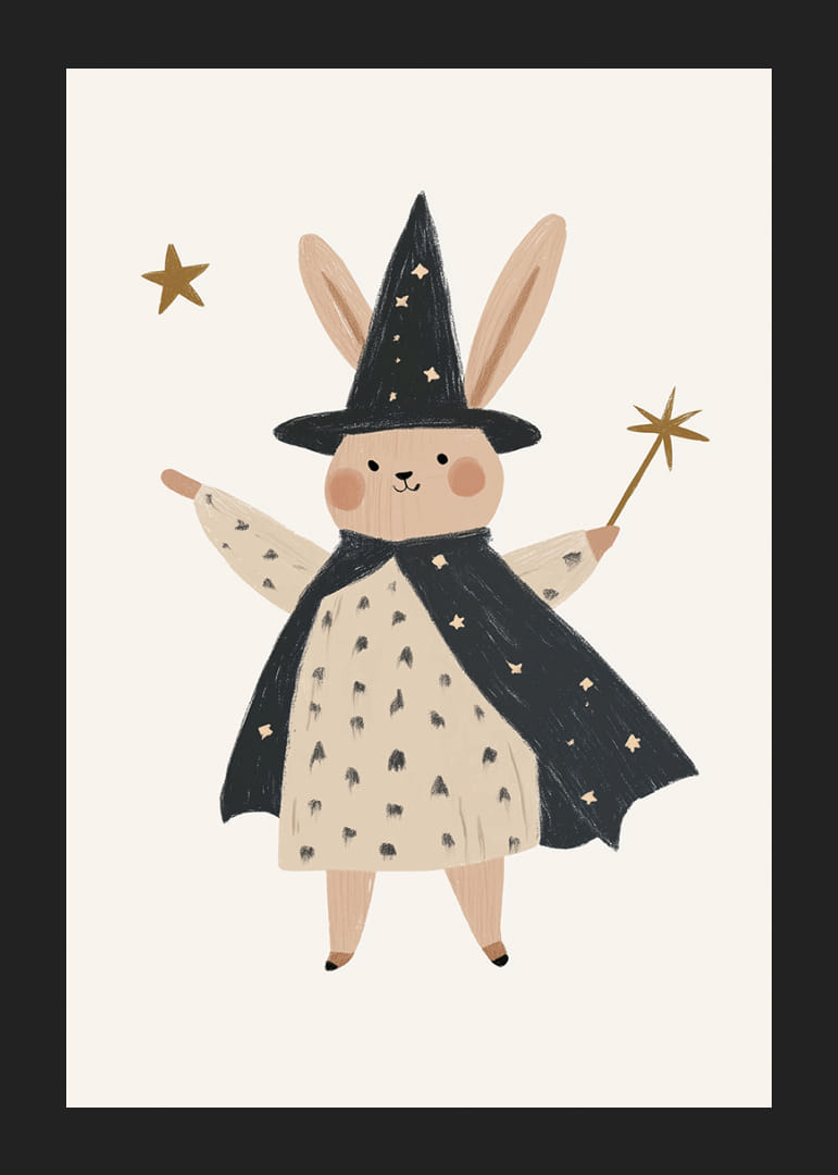 Denna poster fångar en charmig kanin klädd som en trollkarl, omgiven av en aura av stjärnor. Kaninens stora hatt och glänsande mantel skapar en magisk atmosfär. Den lekfulla designen och de mjuka färgerna ger en känsla av äventyr och fantasi. Postern är perfekt för att tillföra en touch av magi och oskyldig glädje till vilket rum som helst, och är en perfekt dekoration för barnens sovrum.