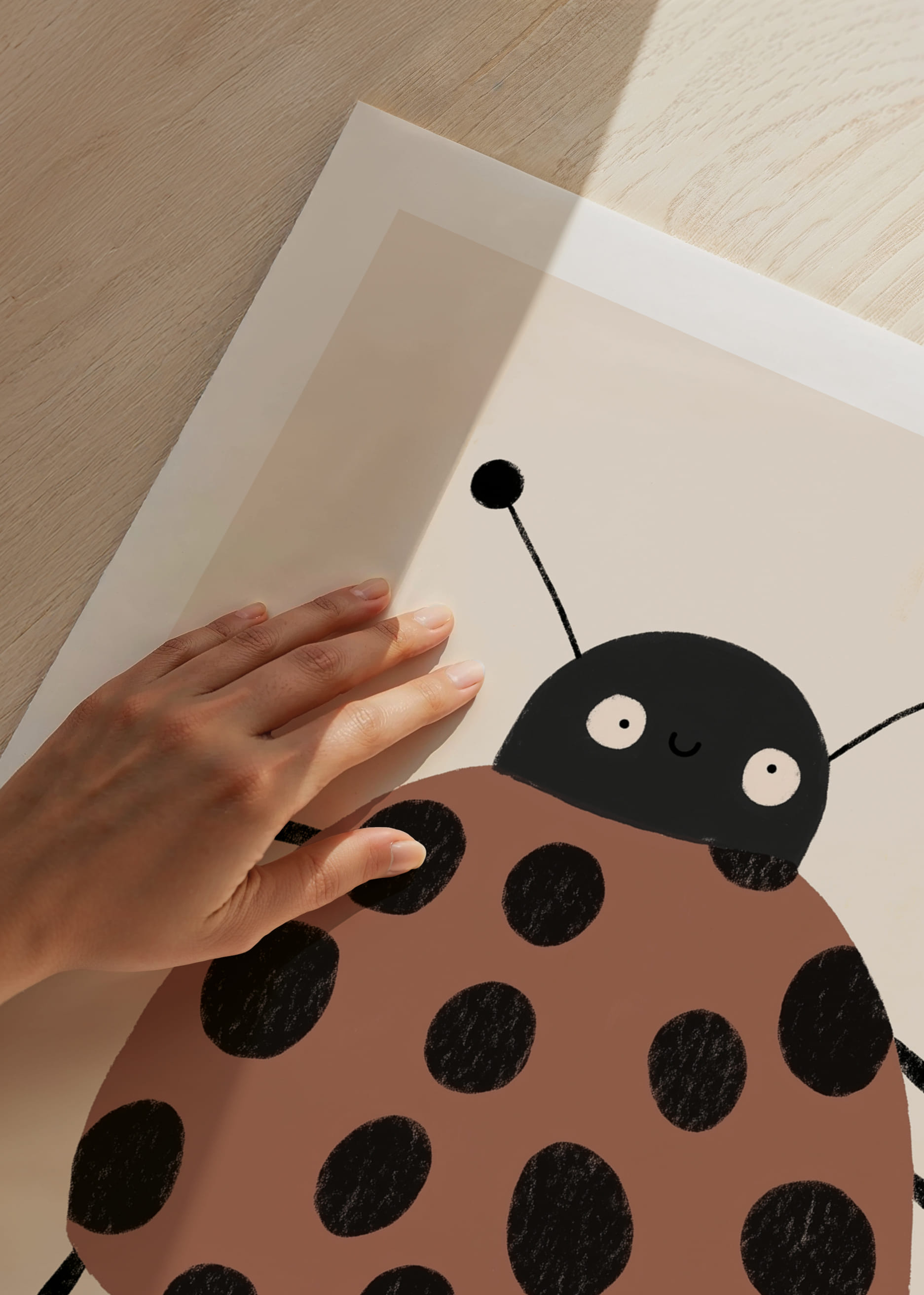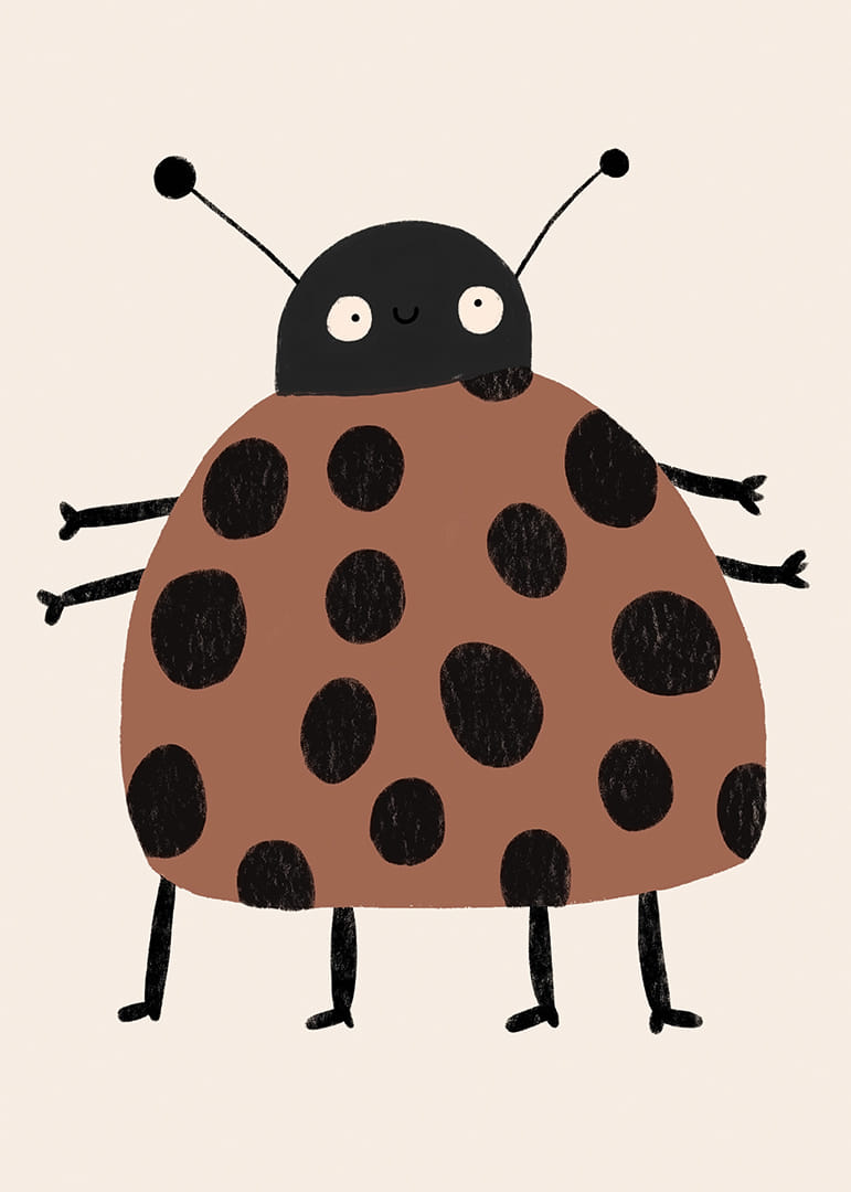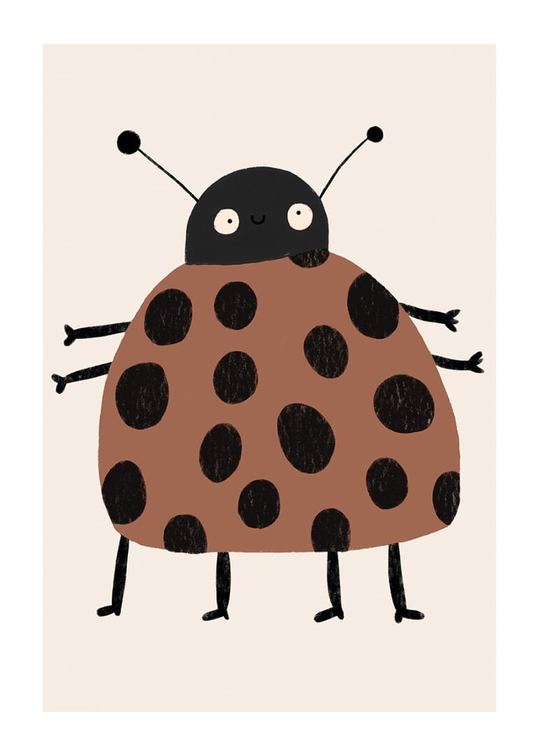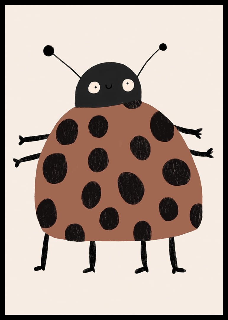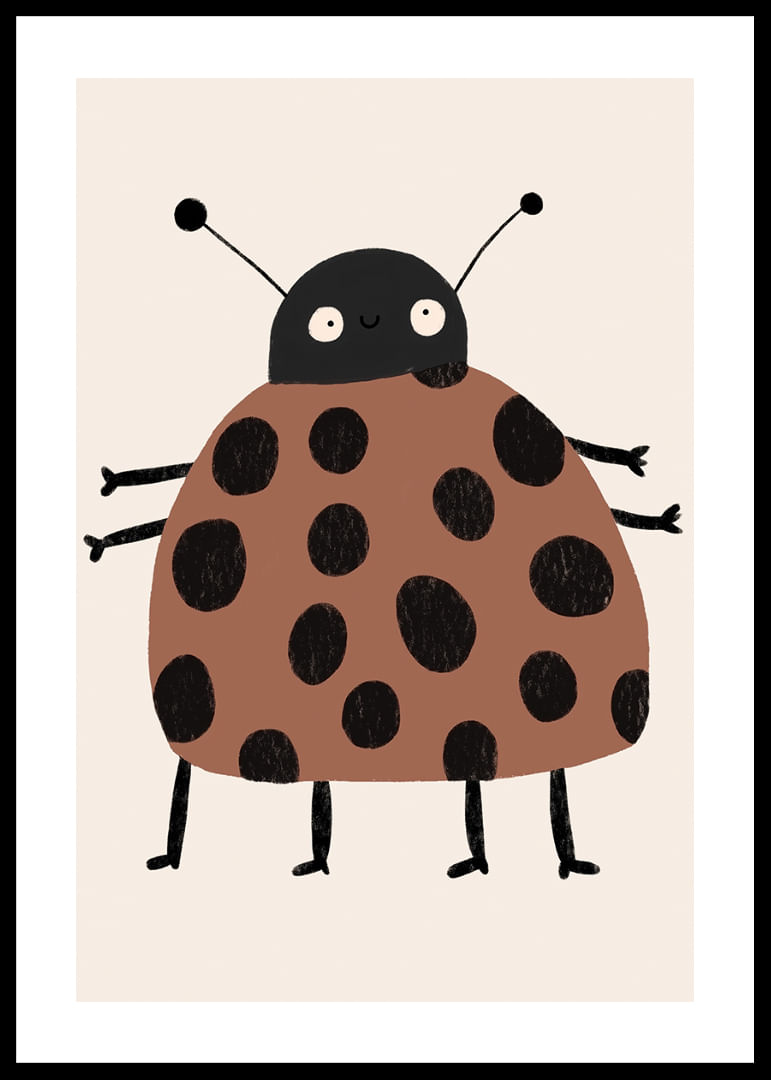Den här postern presenterar en charmig nyckelpiga med stora svarta prickar på en varm brun kropp, som genast fångar ögat med sin lekfulla stil. Det söta ansiktet och benens glada placering skapar en känsla av barnslig glädje och bekymmerslöshet. Denna poster är perfekt att hänga i barnrummet eller i en lekfull del av ditt hem där den sprider både värme och livlighet.