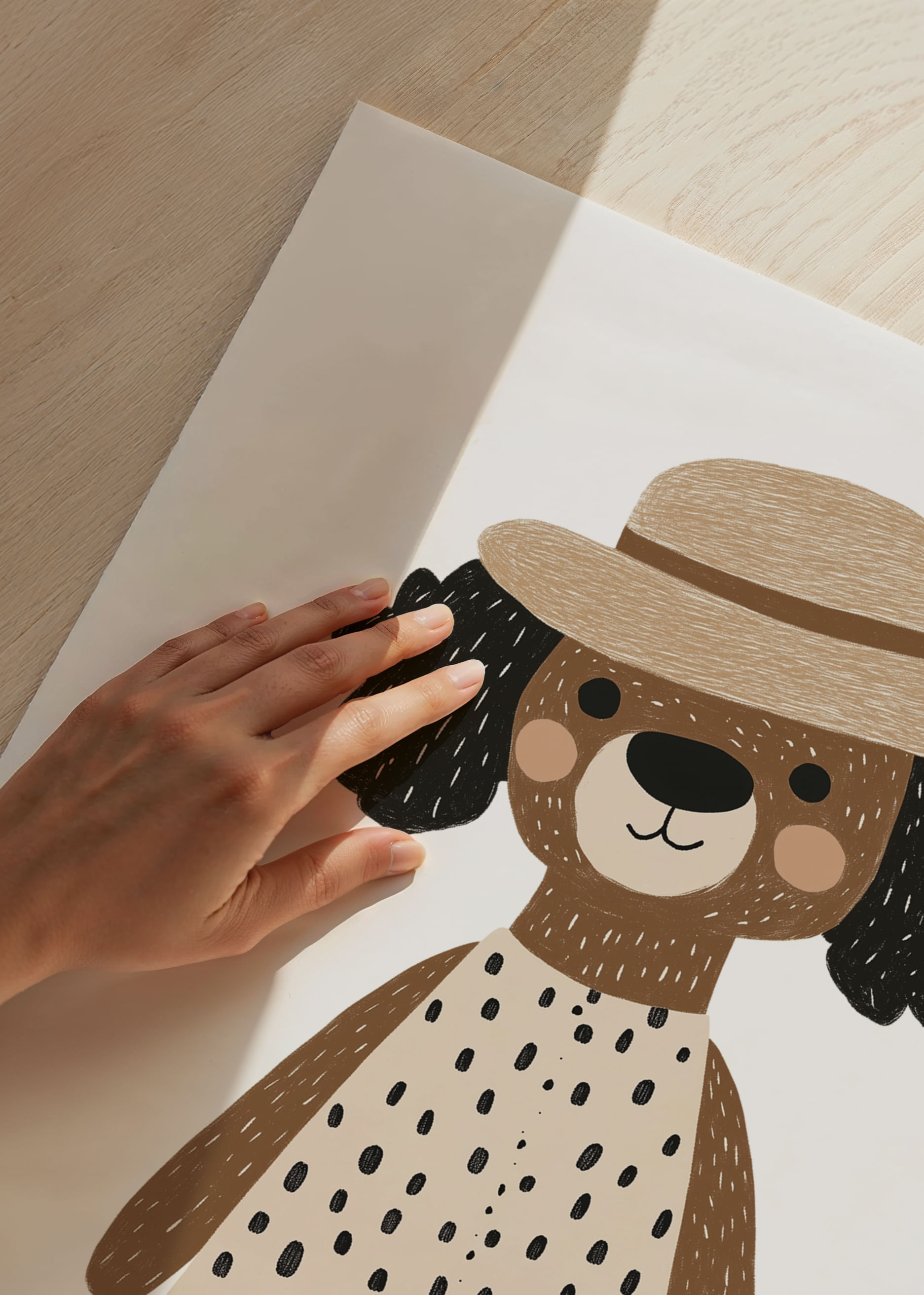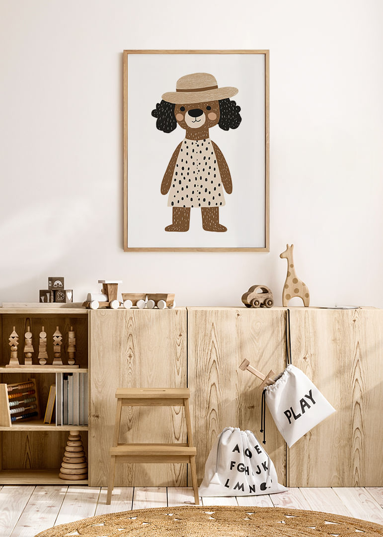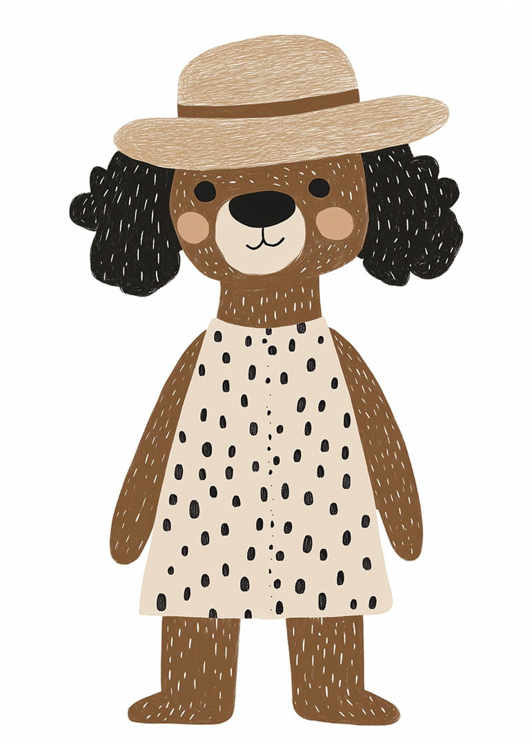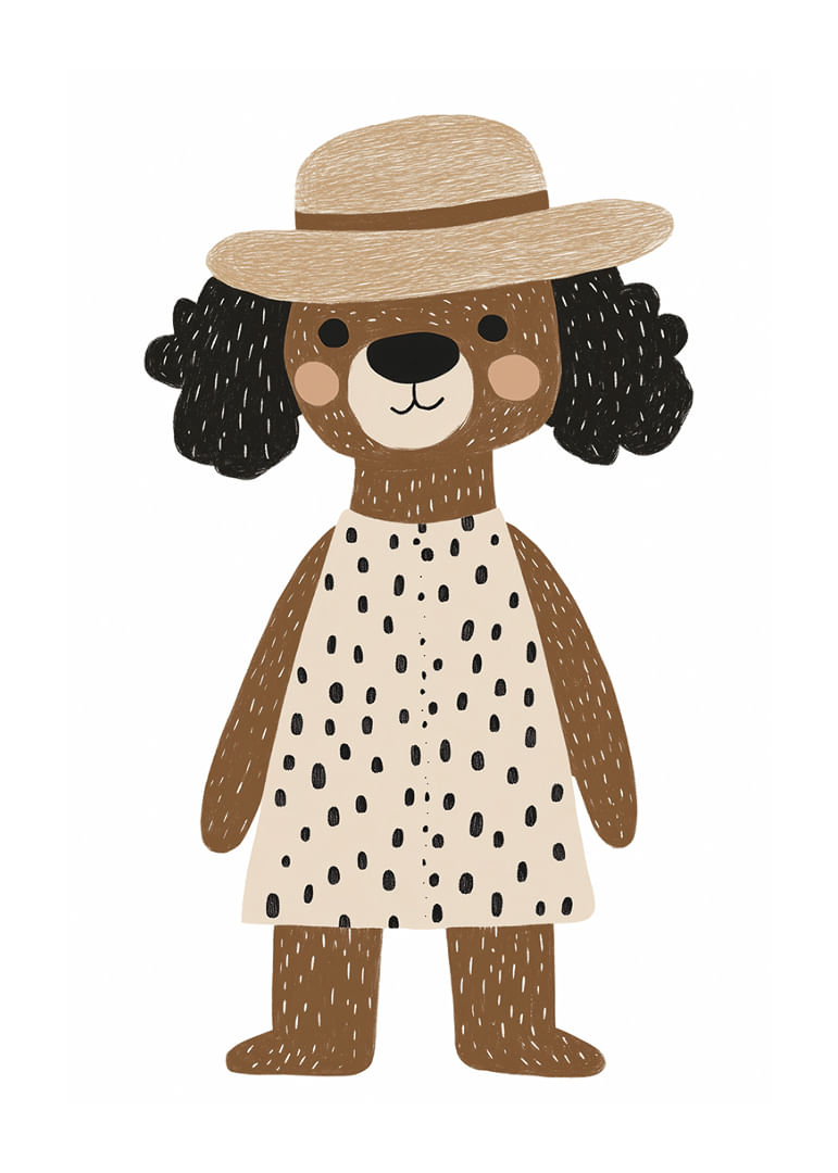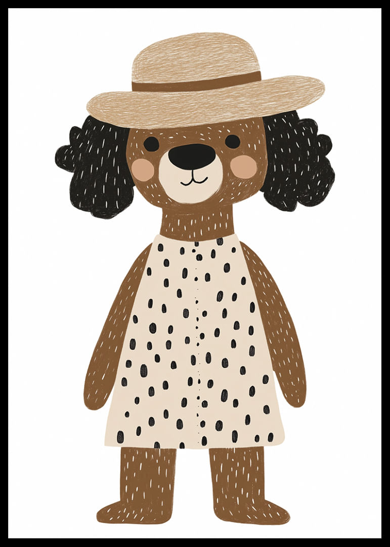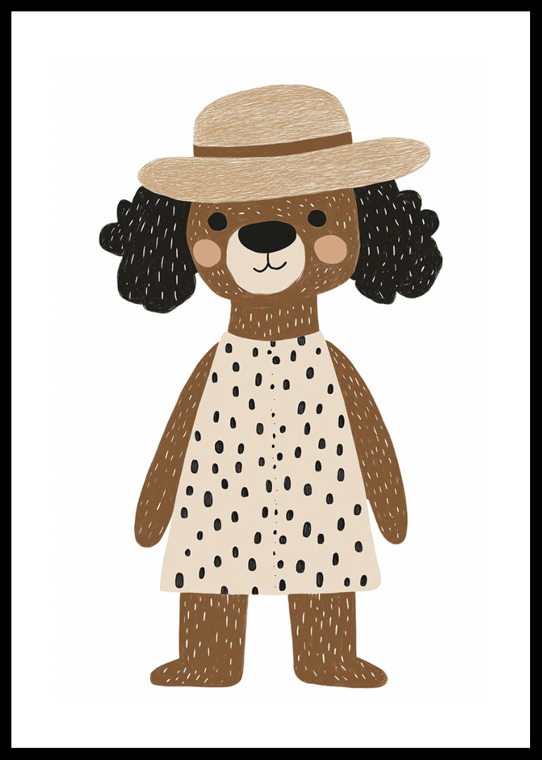 Möt denna glada hund, iklädd en prickig klänning och charmig hatt, som genast förtrollar din fantasi. Den lekfulla designen och hundens oskuldsfulla uttryck ger en känsla av glädje. Denna poster blir en medelpunkt i ditt hem och tillför en touch av barnslig glädje och stil. Med sina varma toner och lekfulla motiv passar postern perfekt i både barnrum och kreativa utrymmen.