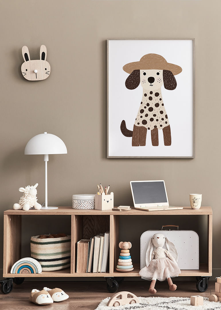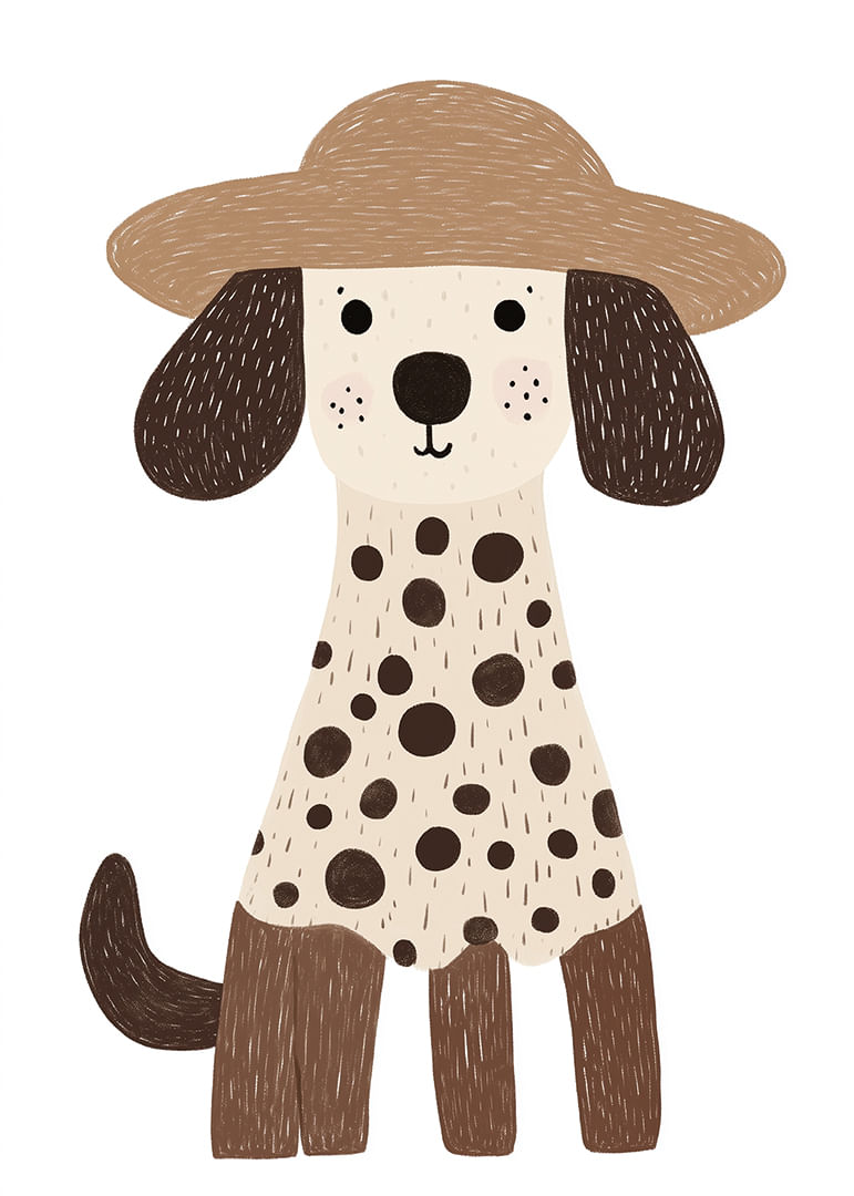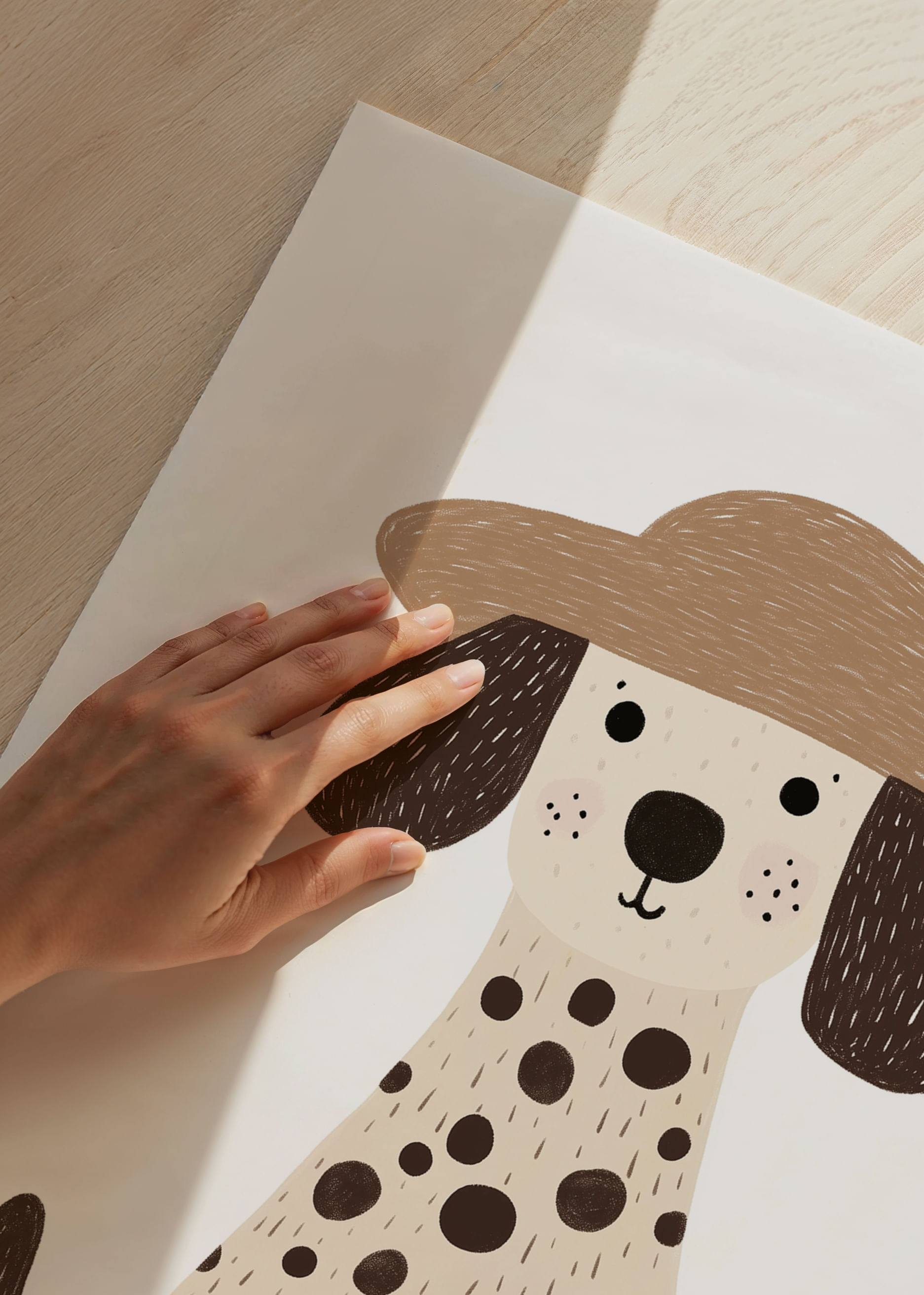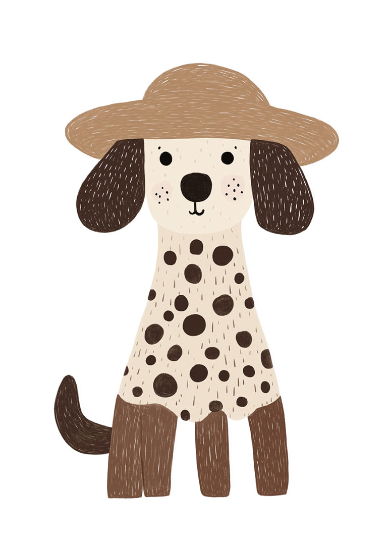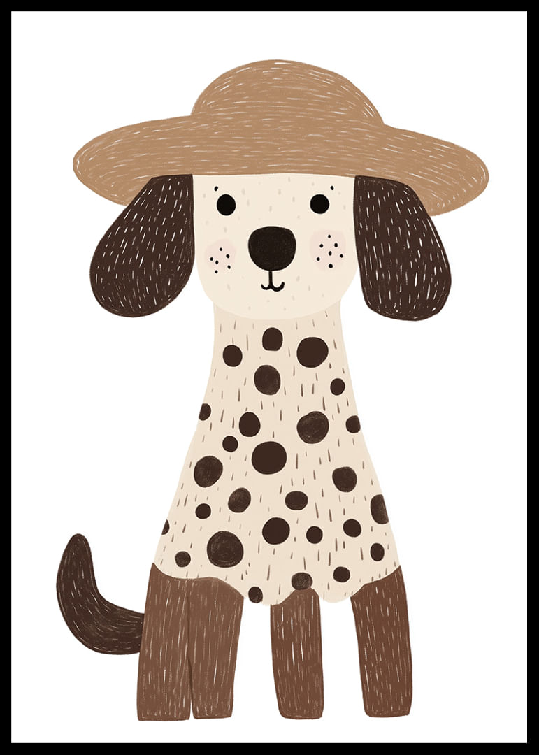 Denna poster fångar en charmig dalmatiner iförd en brun hatt och prickig päls, vilket sprider en känsla av glädje och lekfullhet. Med sina stora bruna fläckar och stiliga uppsyn skapar den ett vänligt och varmt intryck. Denna poster är perfekt för att ge ett rum en touch av personlighet och livfullhet, samtidigt som den tillför en lekfull atmosfär som passar alla åldrar.