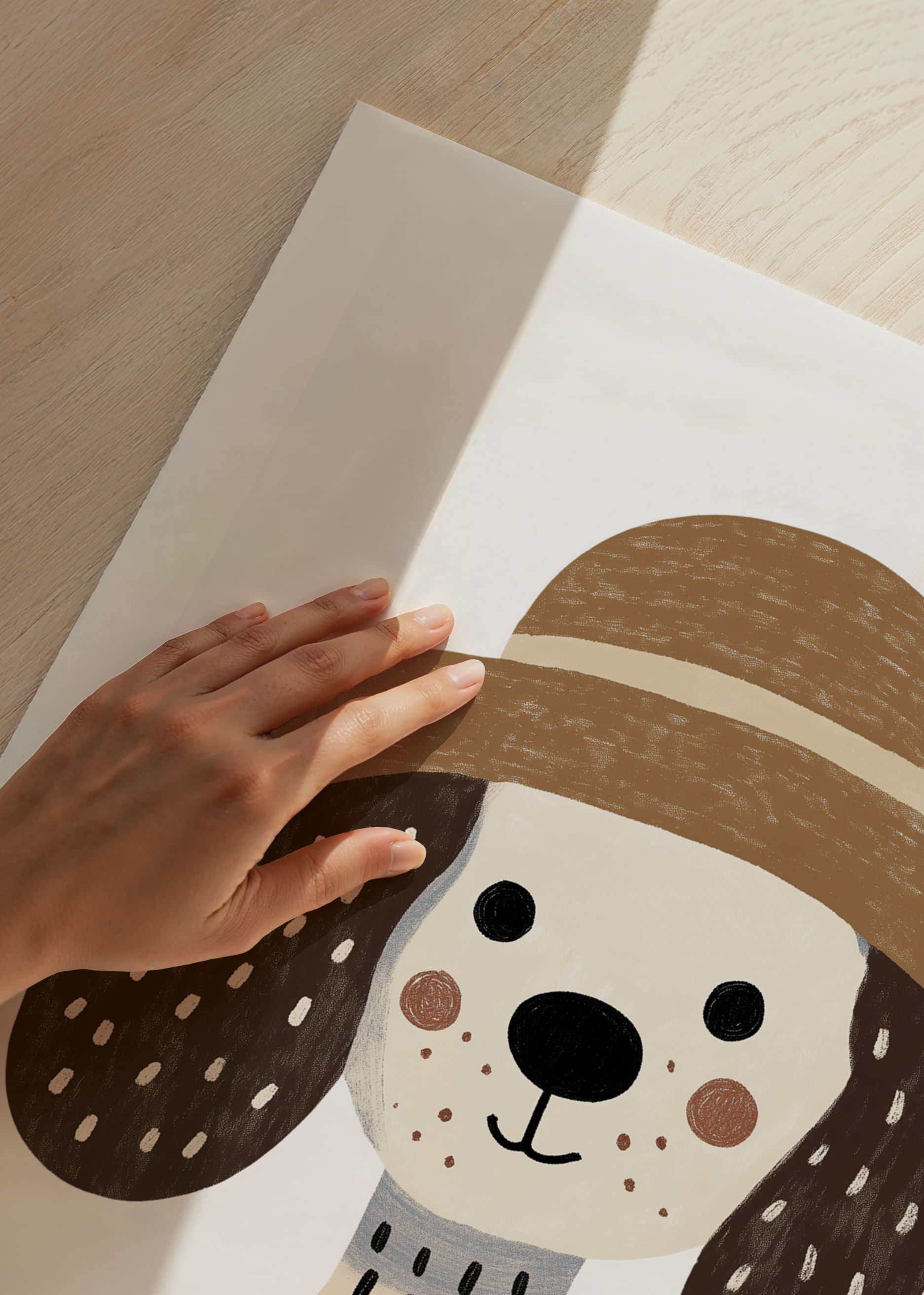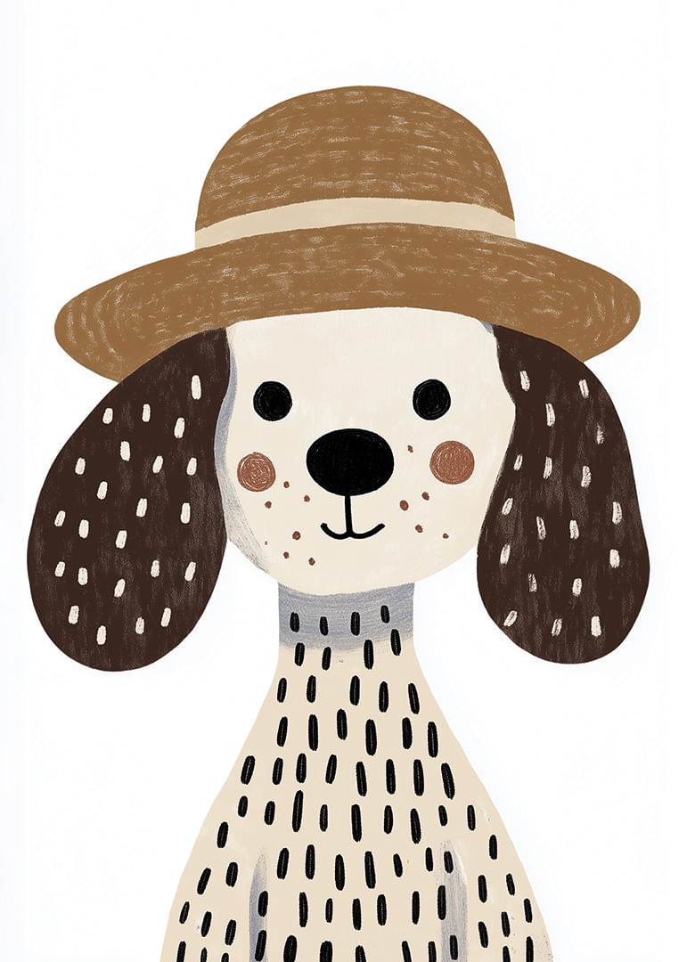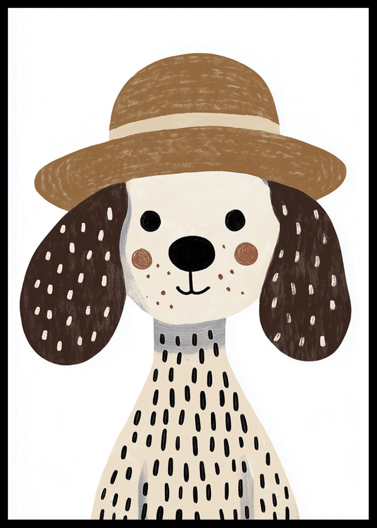 Denna poster fångar blicken med en charmig hund i stråhatt och prickig päls som strålar av lekfull elegans. Varje penseldrag framhäver dess vänliga uttryck och glada energi. Med harmoniska jordtoner blir denna poster en perfekt detalj som lyser upp vilket rum som helst och sprider en känsla av glädje och trivsel till dess omgivning. För djurvänner och esteter är detta en fröjd.
