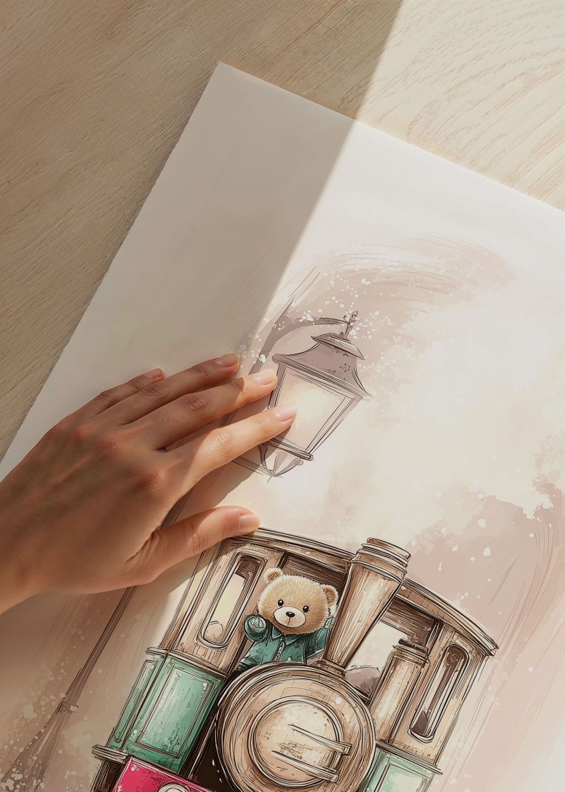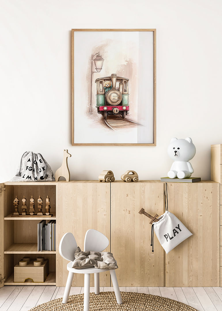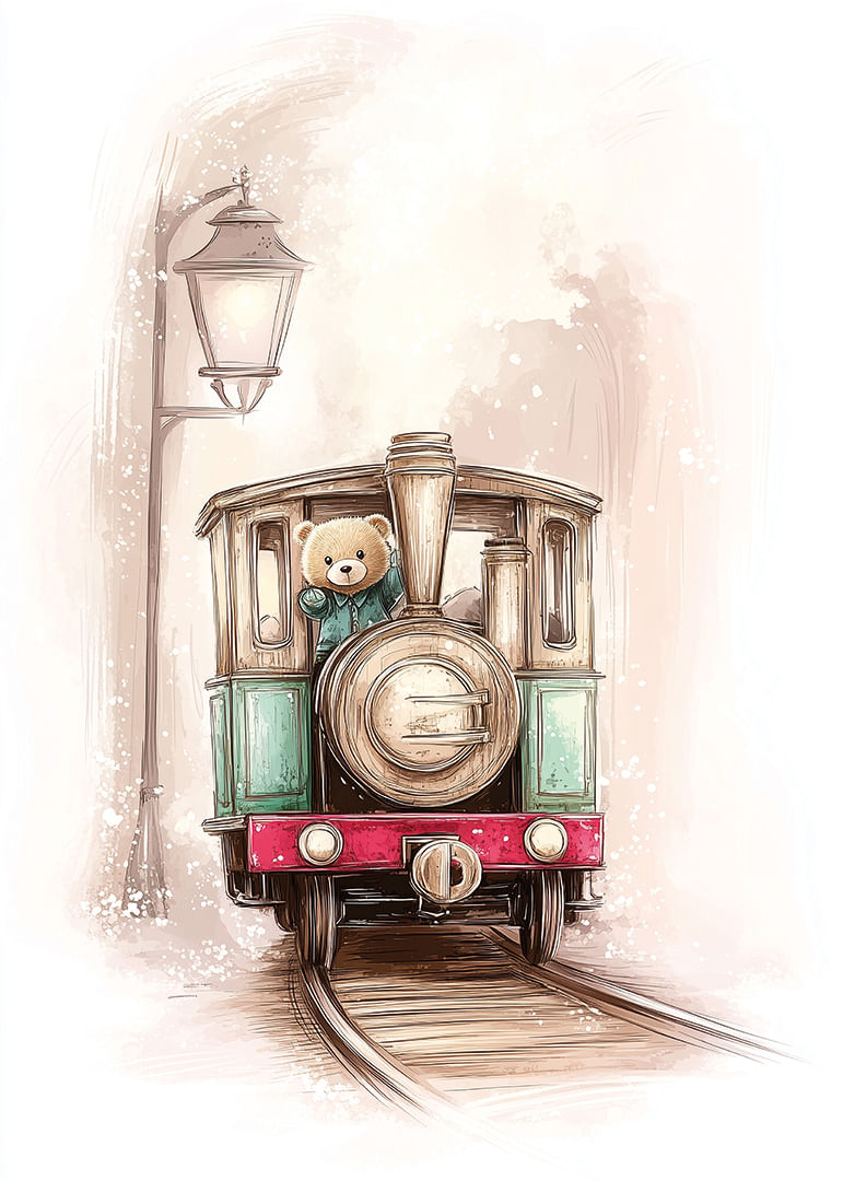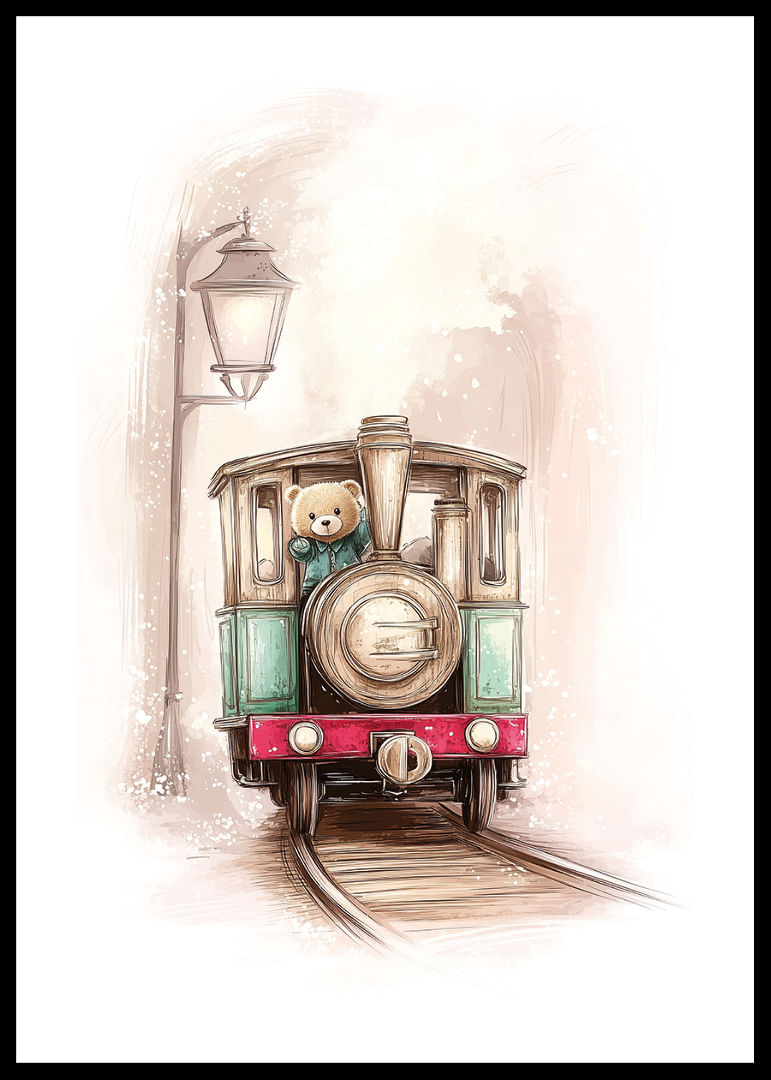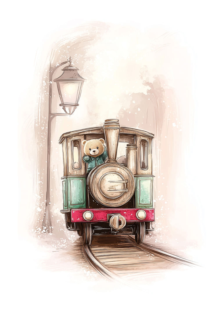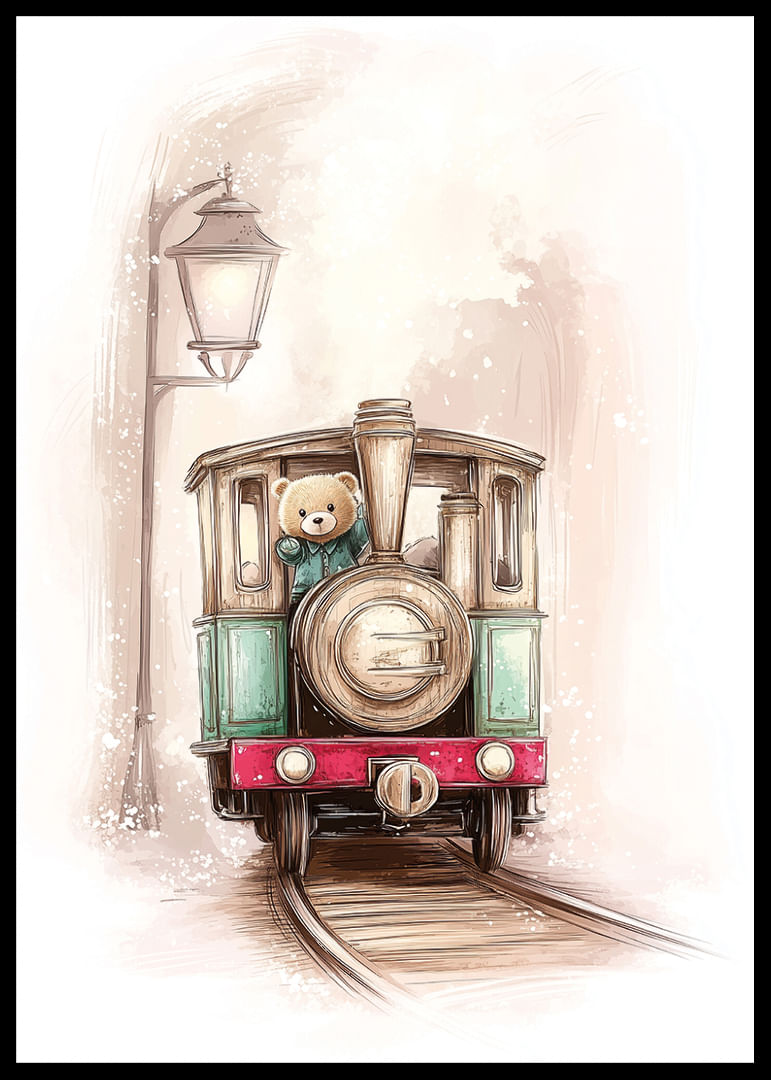 Denna poster fångar en underbar känsla med ett tåg som körs av en leende nallebjörn, vilket ger en sagolik, nostalgisk stämning. Ljusa färger och mjuka linjer skapar ett lekfullt, harmoniskt uttryck som inspirerar fantasi och glädje. Perfekt för barnrummet, berikar postern utrymmet med värme och äventyrslust, och väcker en känsla av nyfikenhet och trygghet.