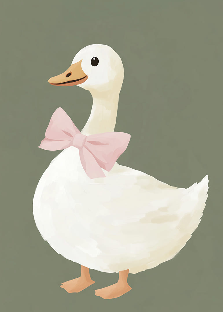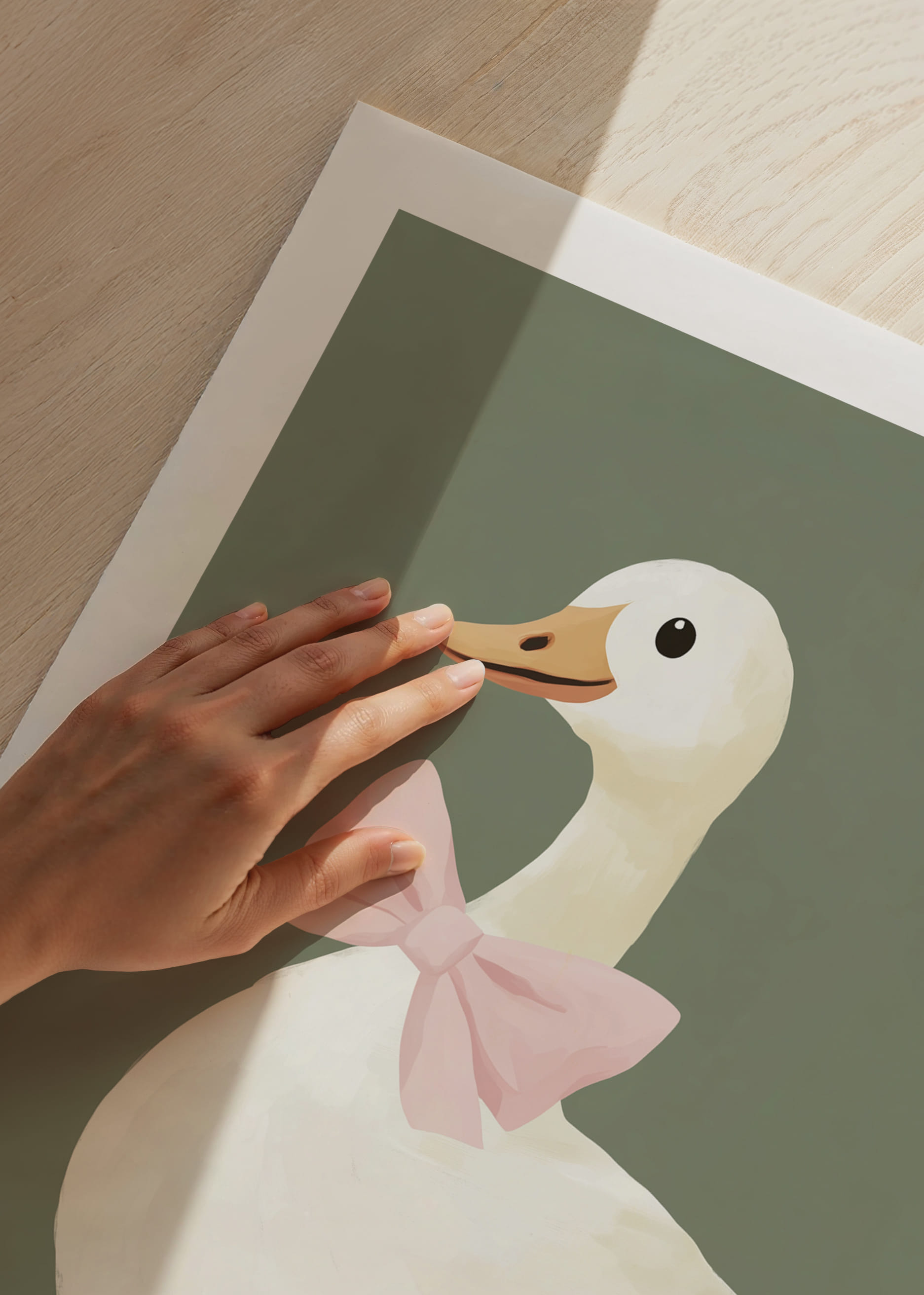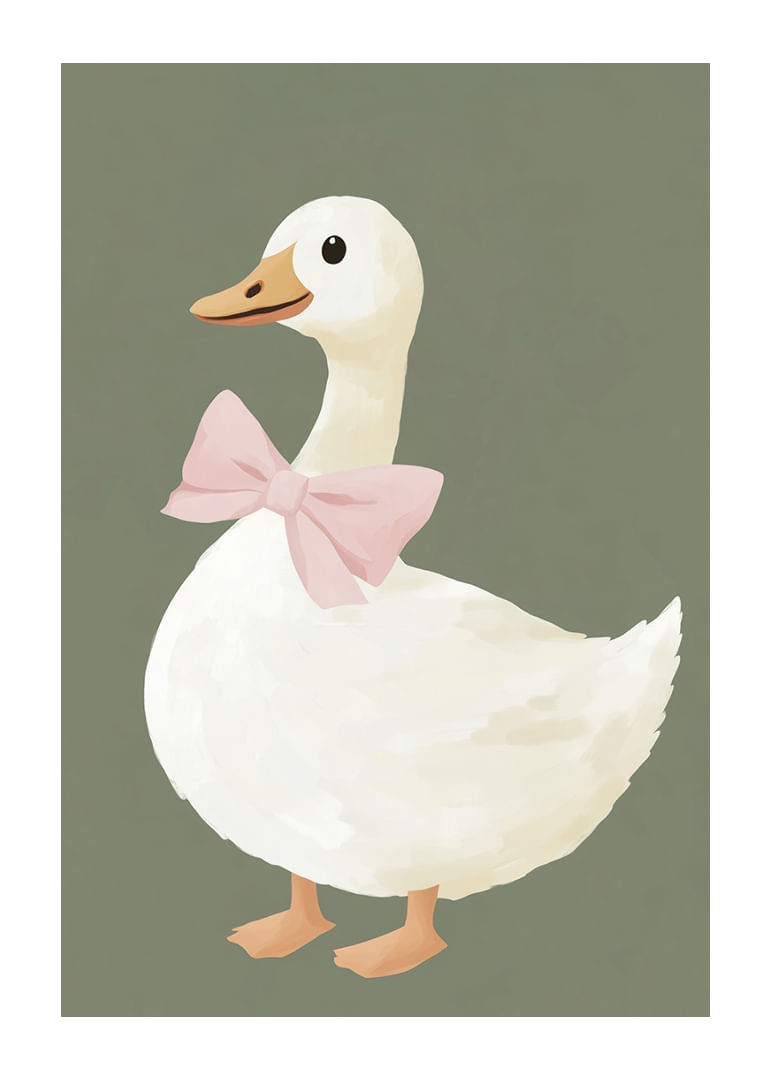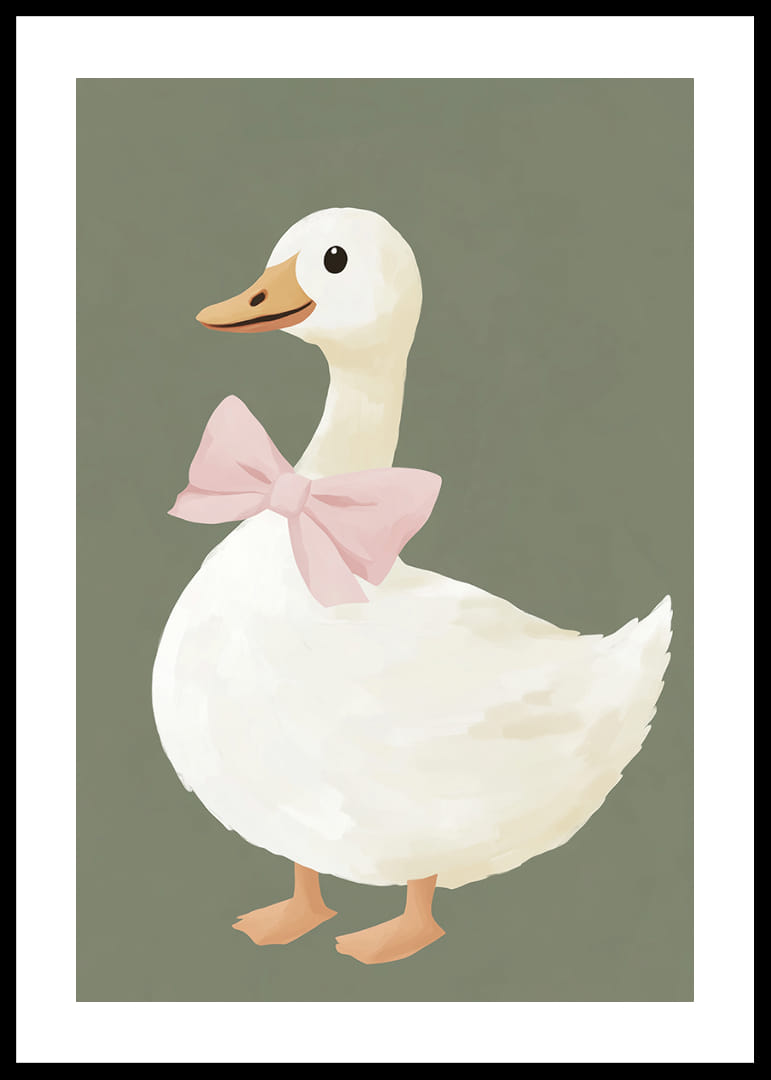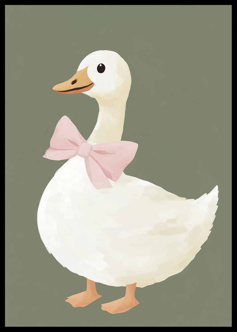 Denna poster fångar hjärtat med sin charmiga anka som bär en rosa rosett mot en mjuk grön bakgrund. Den söta och oskyldiga blicken hos ankan ger en känsla av lugn och glädje, och den kontrasterande rosetten tillför en lekfull touch. Som en del av din inredning skapar denna poster en varm och välkomnande atmosfär, perfekt för att förgylla vilket rum som helst.