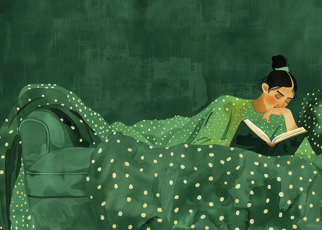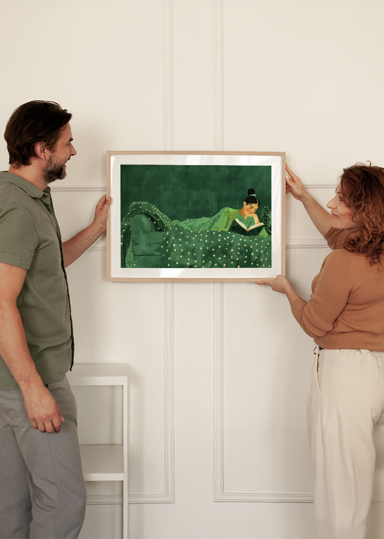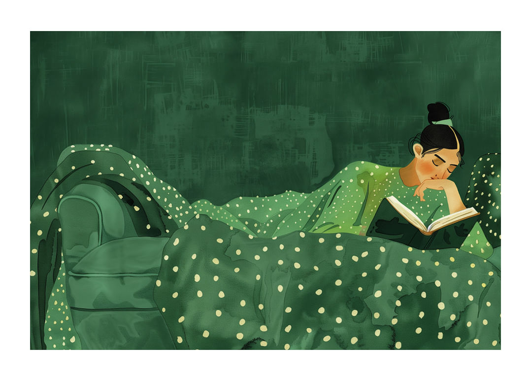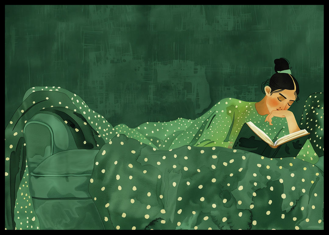 I en harmonisk sammansmältning av gröna nyanser fångar denna poster en värld av stillhet och introspektion. Den avbildar en person omsluten av mjuka, prickiga tyger, försjunken i bokens drömmar. Det är en inbjudan till lugna stunder där tiden står stilla. Som en del av ditt hem, skapar denna poster en oas av ro, där interiören förvandlas till en plats av avkoppling och lugn.