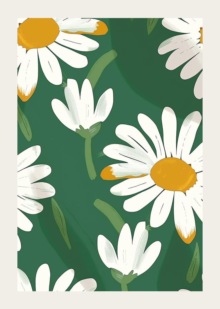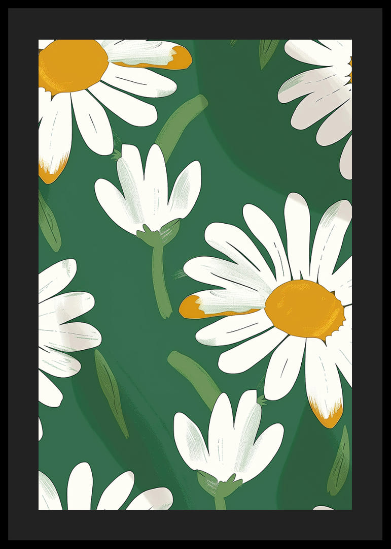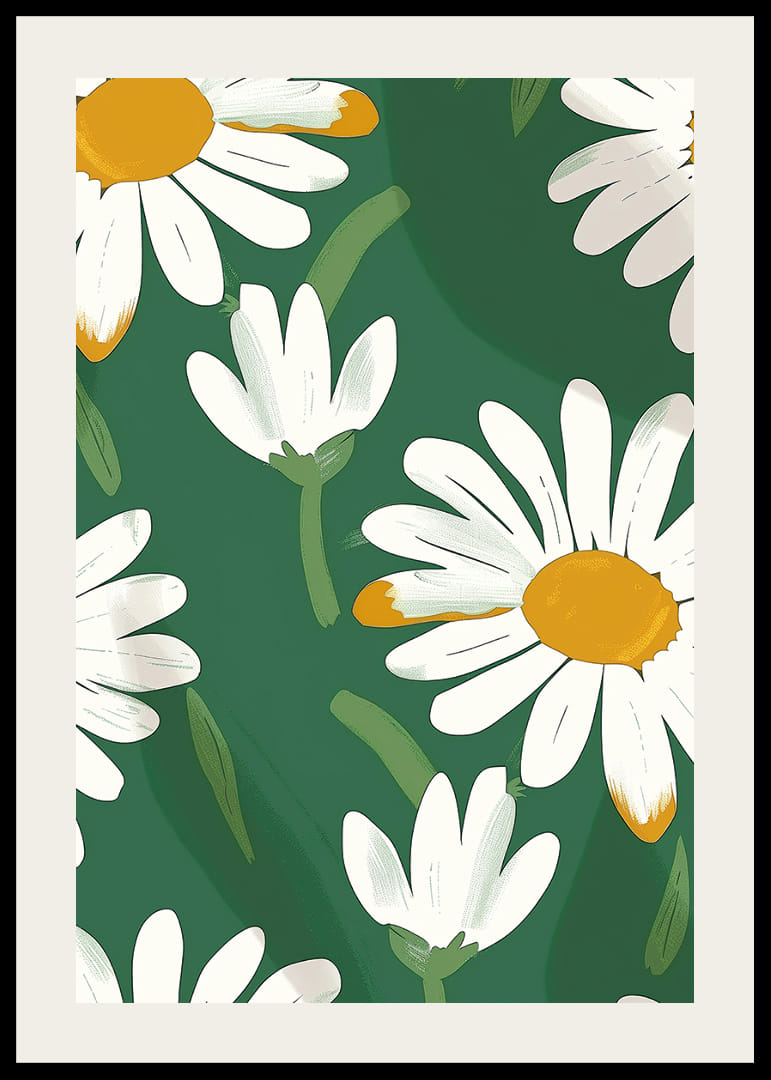 Denna poster med livliga prästkragar mot en rik grön bakgrund fångar vårens friskt spirande energi. De vita kronbladen och det gyllene centrumet ger en glad och harmonisk känsla. Postern förvandlar vilket rum som helst till en oas av lugn och glädje, och inbringar naturens skönhet i ditt hem med ett fridfullt och upplyftande uttryck.