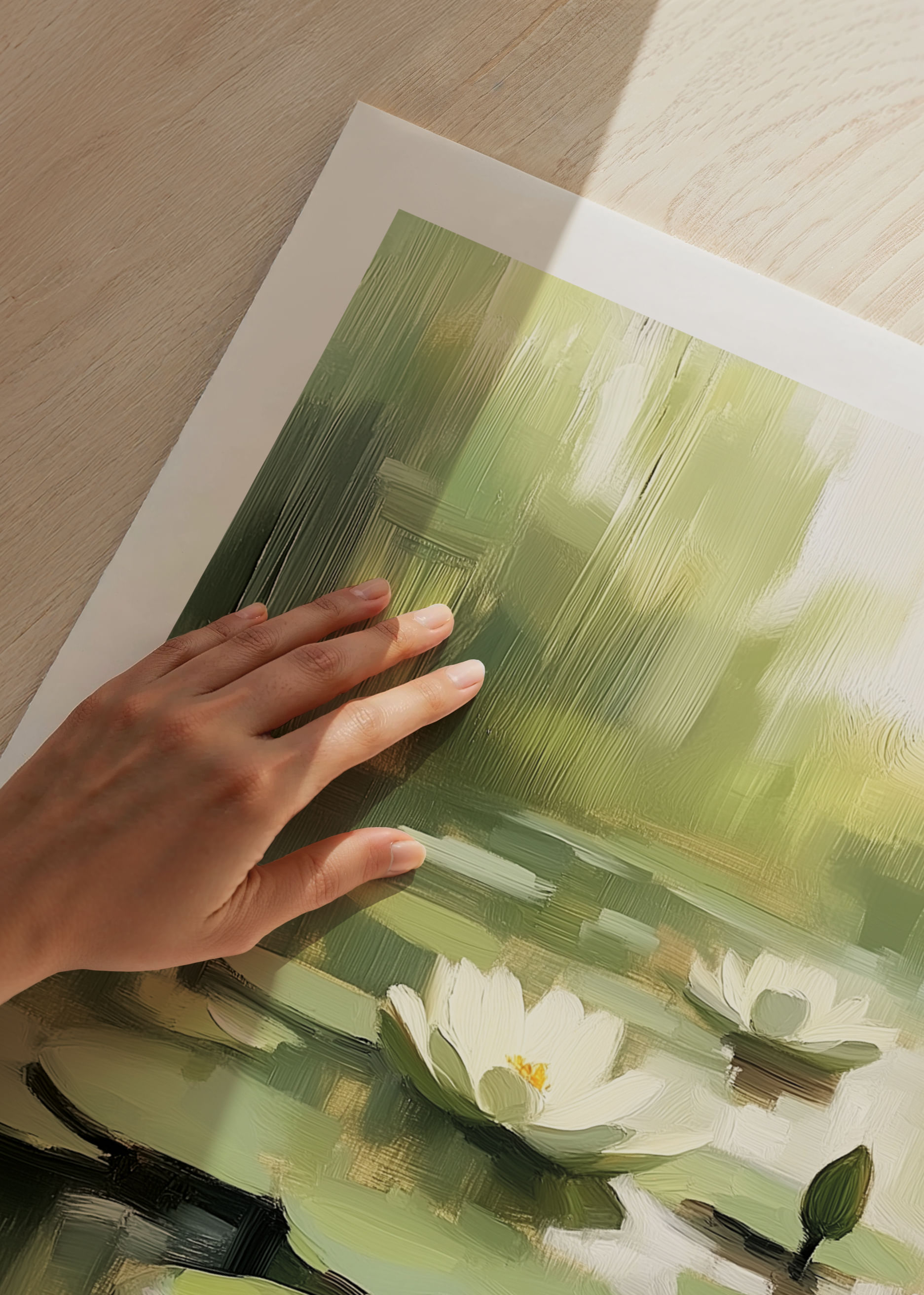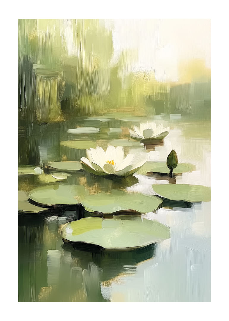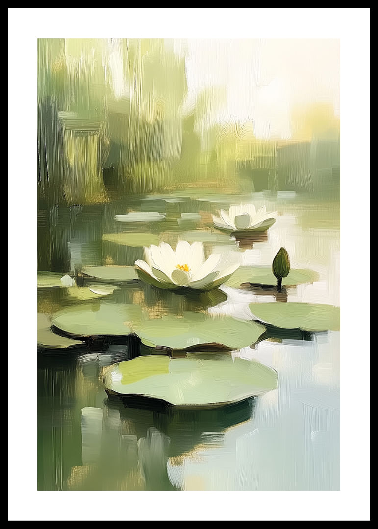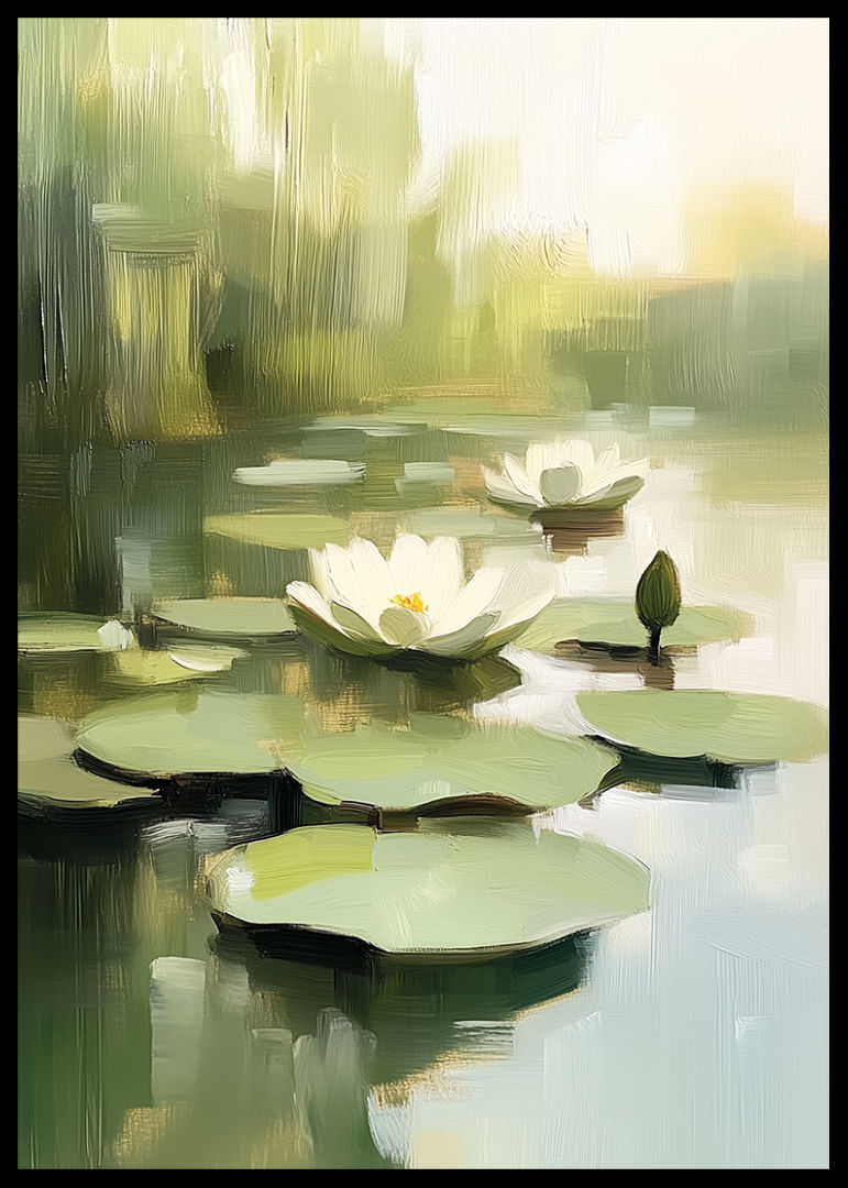 Denna poster fångar ett stilla vattenlandskap där näckrosor mjukt flyter på ytan och speglas i vattnet. De mjuka färgerna och de subtila penseldragen skapar en fridfull atmosfär som lugnar sinnet. Perfekt för att förvandla vilket rum som helst till en oas av stillhet. Med denna poster kan du enkelt förhöja känslan av ro och naturlig skönhet i ditt hem.