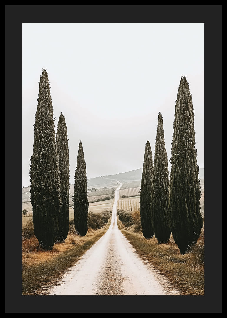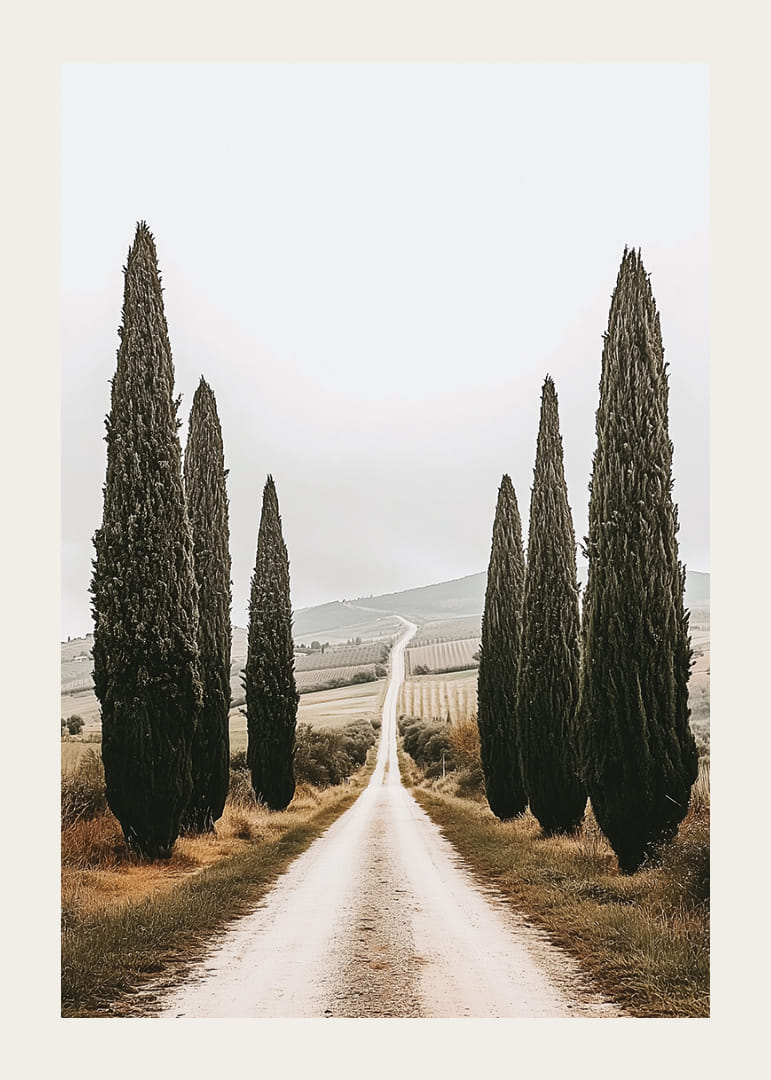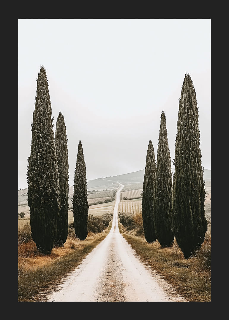 Denna poster fångar en lugn och vacker väg kantad av majestätiska cypresser som sträcker sig mot horisonten i ett drömskt italienskt landskap. Den skapar en känsla av ro och evighet, och bjuder in till att drömma sig bort längs den slingrande stigen. Postern förvandlar varje rum till en plats av frid och naturlig skönhet, där tidens gång känns stilla och harmonisk.